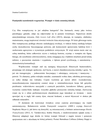 Joanna Łuniewicz Pamiętniki nastoletnich wegetarian. Wampir w kinie ostatniej dekady Czy film wampiryczny to już odrębna kategoria? Jim Jarmusch, znany jako twórca parodiujący gatunki, zdaje się odpowiadać na to pytanie twierdząco. Najnowsze dzieło amerykańskiego reżysera, Only Lovers Left Alive (2013), ukazuje, że wampiry, ulubieńcy mainstreamu, mogą inspirować również twórców kina artystycznego. W kinie głównego nurtu film wampiryczny podlega obecnie zaskakującej ewolucji, w trakcie której zanikają kolejne cechy dystynktywne fascynującego potwora, jak konieczność spożywania ludzkiej krwi i zachowania agresywne o wyrazistym podtekście erotycznym. W wizji autora może stać się celną metaforą, która całkowicie zrywa z tradycją horroru, czyniąc z wampira nie figurę Innego, ale uosobienie człowieczeństwa, istotę zmagającą się z ludzkim strachem przed utratą miłości, z poczuciem znużenia i wypalenia, z lękiem przed cywilizacją, z samotnością i niemożnością komunikacji. Współcześnie wampir stał się następcą klasycznych filmowych buntowników, przejmując ich strategie społeczne, styl bycia, a nawet charakterystyczną mimikę i gesty. To już nie transgresyjny – jednocześnie fascynujący i odrażający, erotyczny i tanatyczny – potwór. To chmurny, pełen wdzięku outsider, szarmancki wobec dam, odrobinę perwersyjny, co tylko dodaje mu wdzięku. Często wyróżnia go nawet ubiór: wysmakowane, monochromatyczne (najczęściej czarne) stroje o minimalistycznym kroju lub gotyckie przebrania: widowiskowe naszyjniki z czarnych paciorków, koronkowe falbany, gorsety, wyrazisty czarno-biały makijaż; wszystko głęboko przesycone estetyką kampu. Zazwyczaj wiąże się to z silnie performatywnym charakterem jego interakcji ze światem – może spowijać się w mgły lub czarny dym, otaczać krukami, a nawet błyszczeć w słońcu jak odłamek minerałów. O dystansie do konwencji świadczy coraz częściej przewijający się wątek autotematyczny. Bohaterowie serialu Pamiętniki wampirów (2009–) czytają Zmierzch Stephenie Meyer (i, jak łatwo się domyślić, są zniesmaczeni), a bohater animowanego Hotelu Transylwania (2012, G. Tartakovsky), hrabia Dracula, z niedowierzaniem ogląda scenę z filmowej adaptacji tego dzieła (w której wampir Edward z nagim torsem i ponurym spojrzeniem stoi z ukochaną na leśnej polanie). Postać Barnabasa Collinsa (Johnny Depp) w Mrocznych cieniach (2012, T. Burton) w całości zbudowana jest z cytatów odsyłających do filmów o Nosferatu autorstwa Murnaua i Herzoga (ze scenami wstawania z trumny, zbliżeniem rąk zakończonych długimi spiczastymi paznokciami i obrazem pełzania na czworakach po pionowych powierzchniach). Wizerunek wampira jako naczelnego outsidera jest najłatwiej zauważalny w produkcjach przeznaczonych dla nastolatków. To tu staje się on bratem wykluczonych, marginalizowanych i pogrążonych w smutku. Bohater tych historii nie jest już zuchwałym, pewnym swej potęgi immoralistą w duchu filozofii Fryderyka Nietzschego lub markiza de Sade. Świadomie dystansuje się od klanu, gdzie najczęściej nie znajduje zrozumienia dla swojego „wegetarianizmu” (w jego wypadku: przejścia na dietę złożoną tylko ze zwierząt) lub prostej sympatii do ludzi – swojej klasy żywicieli. Ślady dawnej grozy, którą budziły wampiry z powieści groszowych i kultowej książki Brama Stokera, możemy odnaleźć właśnie w bohaterach epizodycznych, w tej barwnej zbieraninie ekscentryków, morderców i szaleńców, jaką tworzą wampirze klany i luźne federacje w serialu Czysta krew (2008–) lub filmach z serii Underworld (2003–2012). Główny bohater Zmierzchu, świadomie decydujący się przystąpić do szkolnej społeczności, staje się nastolatkiem na mocy swoistej umowy, którą zawiera z własną dzikością i z ludźmi, którzy mu ufają. Może zostać gwiazdą drużyny piłkarskiej, a jednocześnie zabłysnąć wiedzą – posiada bowiem cechy, które wyróżniają go w sposób pozytywny: nadludzką siłę, ponaddźwiękową szybkość, nieomylny instynkt i błyskotliwą inteligencję. Z wachlarza wampirzych lęków (przed czosnkiem, symbolami religijnymi, światłem lub płynącą wodą) twórcy filmowych opowieści wybierają nieliczne, które nie mogą wpłynąć negatywnie na odbiór nieśmiertelnego amanta. Wady gatunkowe zostają pominięte lub wyeliminowane przez proste chwyty, takie jak pierścień chroniący przed słońcem (Pamiętniki wampirów) lub ciemne okulary, peleryna i kapelusz z szerokim rondem (Mroczne cienie), które przy okazji nadają protagoniście wygląd ekscentrycznej gwiazdy rocka. W rezultacie wampiryzm przestał mieć cechy przekleństwa, a zyskał status namaszczenia, wyniesienia ponad przeciętność. Postać żywiącej się krwią bestii straciła też subwersywny charakter (jaki cechował jeszcze bohaterów Wywiadu z wampirem [1994, N. Jordan] lub Zagadki nieśmiertelności [1983, T. Scott]), a nabrała sensu terapeutycznego. Elena, ukochana Stefana w Pamiętnikach wampirów, traci rodziców i, paradoksalnie, jedyną pokrewną duszę znajduje w osobie wampira pamiętającego czasy wojny secesyjnej. Niezdarna Bella ze Zmierzchu (2008, C. Hardwicke), balansująca na krawędzi katatonicznej depresji, otwiera się dopiero przy Edwardzie, choć jest świadoma, że w jej obecności wampir odczuwa apetyt bynajmniej nie seksualny. Nastolatek chory na białaczkę buduje w Byzantium (2012, N. Jordan) dziwny związek z rudowłosą wampirzycą o wyglądzie szesnastolatki. W horrorze Pozwól mi wejść (2008, T. Alfredson) miłość niemożliwa zyskuje dodatkowy, niepokojący status poprzez zawieszenie bohatera pomiędzy dzieciństwem a dojrzewaniem i uwikłanie go w relację z małą wampirzycą, która łączy ujmującą dziewczęcą słodycz z czysto destrukcyjną pasją. Również w tym filmie punktem wyjścia jest jednak społeczna alienacj