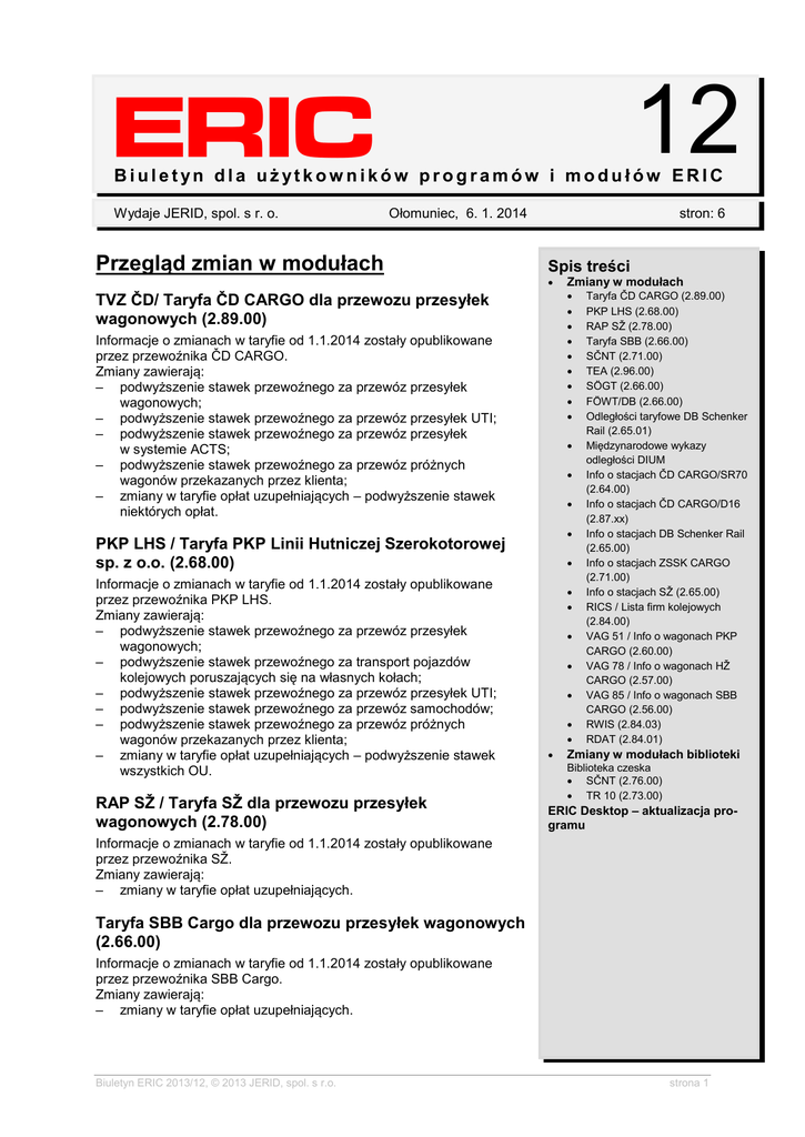 ERIC 12 Biuletyn dla użytkow ników programów i modułów ERIC Wydaje JERID, spol. s r. o. Ołomuniec, 6. 1. 2014 Przegląd zmian w modułach stron: 6 Spis treści Informacje o zmianach w taryfie od 1.1.2014 zostały opublikowane przez przewoźnika ČD CARGO. Zmiany zawierają: – podwyższenie stawek przewoźnego za przewóz przesyłek wagonowych; – podwyższenie stawek przewoźnego za przewóz przesyłek UTI; – podwyższenie stawek przewoźnego za przewóz przesyłek w systemie ACTS; – podwyższenie stawek przewoźnego za przewóz próżnych wagonów przekazanych przez klienta; – zmiany w taryfie opłat uzupełniających – podwyższenie stawek niektórych opłat. PKP LHS / Taryfa PKP Linii Hutniczej Szerokotorowej sp. z o.o. (2.68.00) Informacje o zmianach w taryfie od 1.1.2014 zostały opublikowane przez przewoźnika PKP LHS. Zmiany zawierają: – podwyższenie stawek przewoźnego za przewóz przesyłek wagonowych; – podwyższenie stawek przewoźnego za transport pojazdów kolejowych poruszających się na własnych kołach; – podwyższenie stawek przewoźnego za przewóz przesyłek UTI; – podwyższenie stawek przewoźnego za przewóz samochodów; – podwyższenie stawek przewoźnego za przewóz próżnych wagonów przekazanych przez klienta; – zmiany w taryfie opłat uzupełniających – podwyższenie stawek wszystkich OU. RAP SŽ / Taryfa SŽ dla przewozu przesyłek wagonowych (2.78.00) Zmiany w modułach TVZ ČD/ Taryfa ČD CARGO dla przewozu przesyłek wagonowych (2.89.00) Taryfa ČD CARGO (2.89.00) PKP LHS (2.68.00) RAP SŽ (2.78.00) Taryfa SBB (2.66.00) SČNT (2.71.00) TEA (2.96.00) SÖGT (2.66.00) FÖWT/DB (2.66.00) Odległości taryfowe DB Schenker Rail (2.65.01) Międzynarodowe wykazy odległości DIUM Info o stacjach ČD CARGO/SR70 (2.64.00) Info o stacjach ČD CARGO/D16 (2.87.xx) Info o stacjach DB Schenker Rail (2.65.00) Info o stacjach ZSSK CARGO (2.71.00) Info o stacjach SŽ (2.65.00) RICS / Lista firm kolejowych (2.84.00) VAG 51 / Info o wagonach PKP CARGO (2.60.00) VAG 78 / Info o wagonach HŽ CARGO (2.57.00) VAG 85 / Info o wagonach SBB CARGO (2.56.00) RWIS (2.84.03) RDAT (2.84.01) Zmiany w modułach biblioteki Biblioteka czeska SČNT (2.76.00) TR 10 (2.73.00) ERIC Desktop – aktualizacja programu Informacje o zmianach w taryfie od 1.1.2014 zostały opublikowane przez przewoźnika SŽ. Zmiany zawierają: – zmiany w taryfie opłat uzupełniających. Taryfa SBB Cargo dla przewozu przesyłek wagonowych (2.66.00) Informacje o zmianach w taryfie od 1.1.2014 zostały opublikowane przez przewoźnika SBB Cargo. Zmiany zawierają: – zmiany w taryfie opłat uzupełniających. Biuletyn ERIC 2013/12, © 2013 JERID, spol. s r.o. strona 1 SČNT / Taryfa Słowacja-Czechy (2.71.00) Informacje o zmianach w taryfie od 1.1.2014 zostały opublikowane przez przewoźnika ZSSK CARGO. Zmiany zawierają: podwyższenie stawek przewoźnego za przewóz przesyłek wagonowych na liniach ZSSK; podwyższenie stawek przewoźnego za przewóz przesyłek wagonowych na liniach ČD; podwyższenie stawek przewoźnego za przewóz próżnych wagonów przekazanych przez klienta, na liniach ČD; zmiany w taryfie opłat uzupełniających – podwyższenie stawek wszystkich opłat. TEA / Taryfa Europa-Azja (2.96.00) Informacje o zmianach w taryfie od 28.10.2013 zostały opublikowane przez przewoźnika ŽS. Zmiany zawierają: zmiany w liście stacji ŽS (Serbia): dodano stację: Stepanovićevo; usunięto stacje: Apatin, Apatin Fabrika, Belotince, Beočin, Bijeljina, Bogutovačka Banja, Brestovac, Kostolac, Padinska Skela. SÖGT / Taryfa szwedzko-austriacka (2.66.00) Informacje o zmianach w taryfie od 1.1.2014 zostały opublikowane przez koleje DB Schenker Rail. Zmiany zawierają: podwyższenie stawek przewoźnego za przewóz próżnych wagonów przekazanych przez klienta. FÖWT/DB / Taryfa francusko-austriacka przez Niemcy (2.66.00) Informacje o zmianach w taryfie od 1.1.2014 zostały opublikowane przez koleje DB Schenker Rail. Zmiany zawierają: podwyższenie stawek przewoźnego za przewóz przesyłek wagonowych; podwyższenie stawek przewoźnego za przewóz próżnych wagonów przekazanych przez klienta. Odległości taryfowe DB Schenker Rail (Niemcy) – (2.65.01) Informacje o zmianach od 2. 12. 2013, 15.12.2013, 1.1.2014 zostały opublikowane przez przewoźnika DB Schenker Rail. Zmiany zawierają: – dodano stacje Pinnow (Uckermark), Göttingen Fa. Transpetrol, Munster (Örtze), Celle Vorwerk; – usunięto stacje: Altenhagen (Kr Celle), Beckedorf, Celle Nord, Celle Vorstadt, Dethlingen, Drögennindorf, Egestorf (Lüneb), Eldingen, Eversen, Garstedt (Lüneburg), Bispingen, Gödenstorf-Oelstorf, Hambostel, Hankensbüttel, Lührsbockel, Luhdorf, Munster (Oertze) Süd, Scheuen, Soltau (Han) Süd, Steinhorst, Sülze (Han), Wahrenholz, Wardböhmen, Wietzendorf. Międzynarodowe wykazy odległości DIUM Dokonano zmian i uzupełnień w wykazach odległości DIUM od 15.12.2013 (2.72.00): DIUM PL (51) – Polska – dodano stację: Wrocław Kuźniki; – usunięta stacja: Bolechowo; – zmiany informacji o 16 stacjach; DIUM RO (53) – Rumunia – dodano stacje Grădinari Caraş - KORNUTRIM, Orăştie - CLAUS SERVICE, Reşiţa Nord - OMV PETROM, Târgu Jiu - REMAT GORJ; Biuletyn ERIC 2013/12, © 2013 JERID, spol. s r.o. strona 2 – usunięto stacje: Albeşti Târnava - CESIRO -Sighişoara, Azuga, Baloteşti , Băneasa Giurgiu, Buşteni, Con-stanţa Ferry-boat - AGENŢIA ROMTRANS MOL 1, Făget Teleajen, Jebel - CEREALCOM TIMIS, Măneciu, Ploieşti Nord, Plopeni, Plopeni Sat, Poiana Slănic, Pucioasa, Scăeni, Sibiu A.N.R.S.P.S, Stamora Moraviţa - TERINVEST, Târgşoru Nou, Teişani, Turnişor - MOARA CIBIN, Văleni Nord, Vălenii de Munte, Zalhanaua; – zmiany informacji o 6 stacjach; DIUM CZ (54) – Czechy – dodano stacje Krásný Jez + 11 punktów ładunkowych; – usunięto stacje: Chřibská, Mikulášovice dolní nádraží, Oslavany, Soběšín, Stéblová, Vidnava + 23 punktów
