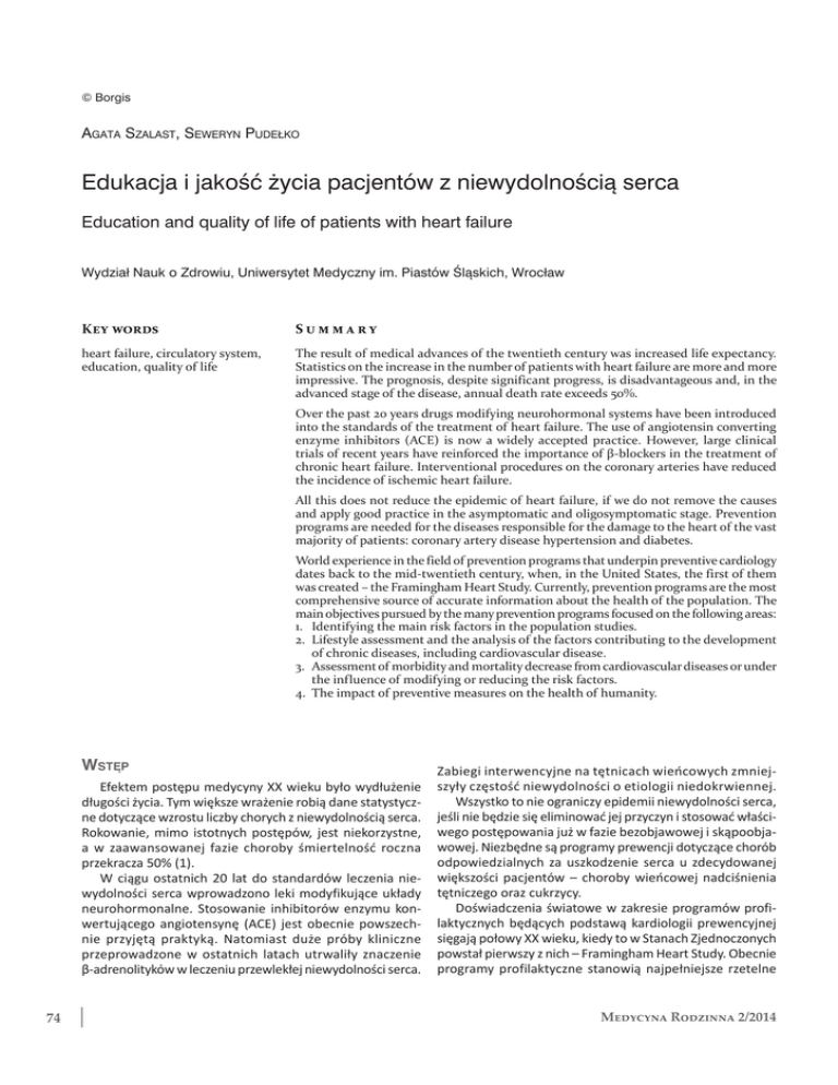 © Borgis Agata Szalast, Seweryn Pudełko Edukacja i jakość życia pacjentów z niewydolnością serca Education and quality of life of patients with heart failure Wydział Nauk o Zdrowiu, Uniwersytet Medyczny im. Piastów Śląskich, Wrocław Key words Summary heart failure, circulatory system, education, quality of life The result of medical advances of the twentieth century was increased life expectancy. Statistics on the increase in the number of patients with heart failure are more and more impressive. The prognosis, despite significant progress, is disadvantageous and, in the advanced stage of the disease, annual death rate exceeds 50%. Over the past 20 years drugs modifying neurohormonal systems have been introduced into the standards of the treatment of heart failure. The use of angiotensin converting enzyme inhibitors (ACE) is now a widely accepted practice. However, large clinical trials of recent years have reinforced the importance of β-blockers in the treatment of chronic heart failure. Interventional procedures on the coronary arteries have reduced the incidence of ischemic heart failure. All this does not reduce the epidemic of heart failure, if we do not remove the causes and apply good practice in the asymptomatic and oligosymptomatic stage. Prevention programs are needed for the diseases responsible for the damage to the heart of the vast majority of patients: coronary artery disease hypertension and diabetes. World experience in the field of prevention programs that underpin preventive cardiology dates back to the mid-twentieth century, when, in the United States, the first of them was created – the Framingham Heart Study. Currently, prevention programs are the most comprehensive source of accurate information about the health of the population. The main objectives pursued by the many prevention programs focused on the following areas: 1. Identifying the main risk factors in the population studies. 2. Lifestyle assessment and the analysis of the factors contributing to the development of chronic diseases, including cardiovascular disease. 3. Assessment of morbidity and mortality decrease from cardiovascular diseases or under the influence of modifying or reducing the risk factors. 4. The impact of preventive measures on the health of humanity. Wstęp Efektem postępu medycyny XX wieku było wydłużenie długości życia. Tym większe wrażenie robią dane statystyczne dotyczące wzrostu liczby chorych z niewydolnością serca. Rokowanie, mimo istotnych postępów, jest niekorzystne, a w zaawansowanej fazie choroby śmiertelność roczna przekracza 50% (1). W ciągu ostatnich 20 lat do standardów leczenia niewydolności serca wprowadzono leki modyfikujące układy neurohormonalne. Stosowanie inhibitorów enzymu konwertującego angiotensynę (ACE) jest obecnie powszechnie przyjętą praktyką. Natomiast duże próby kliniczne przeprowadzone w ostatnich latach utrwaliły znaczenie β-adrenolityków w leczeniu przewlekłej niewydolności serca. 74 Zabiegi interwencyjne na tętnicach wieńcowych zmniejszyły częstość niewydolności o etiologii niedokrwiennej. Wszystko to nie ograniczy epidemii niewydolności serca, jeśli nie będzie się eliminować jej przyczyn i stosować właściwego postępowania już w fazie bezobjawowej i skąpoobjawowej. Niezbędne są programy prewencji dotyczące chorób odpowiedzialnych za uszkodzenie serca u zdecydowanej większości pacjentów – choroby wieńcowej nadciśnienia tętniczego oraz cukrzycy. Doświadczenia światowe w zakresie programów profilaktycznych będących podstawą kardiologii prewencyjnej sięgają połowy XX wieku, kiedy to w Stanach Zjednoczonych powstał pierwszy z nich – Framingham Heart Study. Obecnie programy profilaktyczne stanowią najpełniejsze rzetelne Medycyna Rodzinna 2/2014 Edukacja i jakość życia pacjentów z niewydolnością serca źródło informacji o stanie zdrowia populacji. Główne cele realizowane w ramach wielu programów profilaktycznych dotyczyły następujących obszarów: a) identyfikacji głównych czynników ryzyka w badanych populacjach, b)oceny stylu życia i analizy czynników sprzyjających rozwojowi chorób przewlekłych, w tym także chorób układu krążenia, c) oceny zmniejszenia zachorowalności i śmiertelności z powodu chorób układu krążenia pod wpływem modyfikowania lub ograniczenia czynników ryzyka, d)wpływu działań profilaktycznych na stan zdrowia ludzkości (2). Definicja niewydolności serca Istnieje wiele definicji niewydolności serca. Dość rozpowszechnione jest określenie niewydolności serca jako stanu, gdy w wyniku zaburzeń strukturalnych lub czynnościowych serca pojemność minutowa jest obniżona w stosunku do zapotrzebowania metabolicznego tkanek bądź prawidłowa pojemność minutowa jest utrzymywana kosztem podwyższonego ciśnienia napełniania. Przyczyną takiej sytuacji może być każde schorzenie zaburzające napełnienie lub wyrzut krwi z komór, jednak najczęstszymi przyczynami niewydolności serca są choroba wieńcowa i nadciśnienie tętnicze (1). Niewydolność serca jest to stan, w którym nieprawidłowa struktura lub funkcjonowanie serca upośledza zdolność do zapewnienia wystarczającego przepływu krwi zgodnie z zapotrzebowaniem organizmu. Nie należy mylić niewydolności serca z zatrzymaniem krążenia. Do częstych przyczyn niewydolności serca należą: zawał mięśnia sercowego, nadciśnienie, choroba niedokrwienna serca, miażdżyca naczyń, choroby zastawkowe i kardiomiopatie. Proces niewydolności serca może mieć charakter przewlekły bądź ostry, stąd wyróżniamy dwie postaci schorzenia, różniące się etiologią, symptomatologią i sposobem leczenia (3). Grupa ekspertów Europejskiego Towarzystwa Kardiologicznego (ESC) w 2001 roku zdefiniowała przewlekłą niewydolność serca jako stan, w którym są obecne nie tylko dolegliwości i charakterystyczne znamiona niewydolności serca (w spoczynku lu