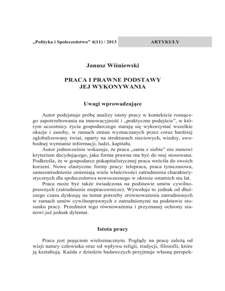 Praca i prawne podstawy jej wykonywania „Polityka i Społeczeństwo” 4(11) / 2013 83 ARTYKUŁY Janusz Wiśniewski PRACA I PRAWNE PODSTAWY JEJ WYKONYWANIA Uwagi wprowadzające Autor podejmuje próbę analizy istoty pracy w kontekście rosnącego zapotrzebowania na innowacyjność i „praktyczne podejście”, w którym uczestnicy życia gospodarczego starają się wykorzystać wszelkie okazje i zasoby, w ramach zmian wyznaczanych przez coraz bardziej zglobalizowany świat, oparty na strukturach sieciowych, wiedzy, swobodnej wymianie informacji, ludzi, kapitału. Autor jednocześnie wskazuje, że praca „sama z siebie” nie stanowi kryterium decydującego, jaka forma prawna ma być do niej stosowana. Podkreśla, że w gospodarce pokapitalistycznej praca wróciła do swoich korzeni. Nowe elastyczne formy pracy: telepraca, praca tymczasowa, samozatrudnienie zmieniają wiele właściwości zatrudnienia charakterystycznych dla społeczeństwa nowoczesnego w okresie ostatnich stu lat. Praca może być także świadczona na podstawie umów cywilnoprawnych (zatrudnienie niepracownicze). Wywołuje to jednak od dłuższego czasu dyskusję na temat potrzeby zrównoważenia zatrudnionych w ramach umów cywilnoprawnych z zatrudnionymi na podstawie stosunku pracy. Przedmiot tego równoważenia i przyznanej ochrony stanowi już jednak dylemat. Istota pracy Praca jest pojęciem wieloznacznym. Poglądy na pracę zależą od wizji natury człowieka oraz od wpływu religii, tradycji, filozofii, które ją kształtują. Każda z dziedzin badawczych przyjmuje własną perspek- 84 JANUSZ WIŚNIEWSKI tywę rozumienia pracy, co sprawia, że różne jej właściwości są eksponowane albo pomijane. Międzynarodowy Pakt Praw Obywatelskich i Politycznych przyjęty przez zgromadzenie ogólne ONZ 16 grudnia 1966 r. nie tylko nawiązuje do Powszechnej Deklaracji Praw Człowieka z 1948 r., ale jako cel wskazuje wyzwolenie od lęku z powodu niedostatku. Stąd już tylko krok do wskazania istoty pracy. Europejska Karta Społeczna przyjęta w Turynie 18 października 1961 r. i ratyfikowana przez Polskę stanowi z kolei, że każdy będzie miał możliwość zarabiania na życie poprzez pracę swobodnie wybraną. Także Międzynarodowy Pakt Praw Gospodarczych, Społecznych i Kulturalnych wskazuje na prawo każdego człowieka do uzyskiwania możliwości utrzymania się poprzez pracę swobodnie wybraną lub przyjętą. Konstytucja RP nie przesądza znaczenia pojęcia „praca”, a jej art. 24 nie może być interpretowany, jak się wydaje, jako odnoszący się tylko do pracy wykonywanej w ramach pracowniczego podporządkowania. W doktrynie prawa konstytucyjnego wskazuje się, że dyspozycją art. 24 objęta jest każda praca. Dodaje się, że przepis ten dotyczy pracy rozumianej najszerzej, a więc pracy w znaczeniu filozoficznym (Banaszak 2009). Podkreśla się także, że norma art. 24 stanowi konstytucyjną afirmację pracy i jest przede wszystkim normą programową skierowaną do państwa jako ustawodawcy i kontrolera. W art. 11 k.p. wyrażona została zasada wolności pracy, pojmowana jako swoboda wyboru miejsca i podstawy prawnej zatrudnienia. Od 1 stycznia 2004 r. istotnym elementem tej zasady jest swoboda stron stosunku pracy regulowania warunków pracy i płacy. Telepraca (art. 675 k.p.) zaś charakteryzuje się regularnym wykonywaniem przez pracownika pracy poza zakładem pracy, z wykorzystaniem środków komunikacji elektronicznej w rozumieniu art. 2, pkt 5 Ustawy z 18 lipca 2002 r. o świadczeniu usług drogą elektroniczną (DzU nr 71, poz. 1800 z późn. zm.). W literaturze przedmiotu autorzy, definiując pracę, odwołują się do encyklopedycznych lub słownikowych sformułowań. Źródła te definiują pracę jako m.in. „celową działalność człowieka zmierzającą do wytworzenia określonych dóbr materialnych lub kulturowych” lub „zajęcie, zatrudnienie jako źródło dochodu” (Wielka encyklopedia… 2004), bądź też jako „celowy i świadomy wysiłek człowieka, którego celem Praca i prawne podstawy jej wykonywania 85 jest przekształcenie szeroko rozumianego środowiska tak, aby zwiększyć szanse przeżycia gatunku ludzkiego” (Mięcina 2013). Są to tylko dwie z wielu klasycznych definicji pracy i przytoczenie ich miało na celu wskazanie jedynie na samą naturę pracy, która na przestrzeni wieków uległa zasadniczym zmianom, zmienił się cel oraz ekonomiczny, społeczny i kulturowy wymiar pracy. Nastąpiło wykształcenie celów, ale także czynności kwalifikowanych jako praca lub jako działania poza sferą pracy, nauka czy wolontariat. W dzisiejszych czasach gospodarka i społeczeństwo postmodernistyczne coraz większe zainteresowanie wykazują pracą specjalisty i menedżera zarządzającego wiedzą. To właśnie wiedza jest najbardziej wartościowym narzędziem, materiałem i wytworem pracy. Praca wykorzystująca zaawansowaną wiedzę wytwarza najbardziej oczekiwany produkt. Znaczenie wiedzy znalazło odbicie w pojęciu „społeczeństwa wiedzy” charakteryzującego dzisiejsze czasy: ponowoczesność. To niewątpliwie sprawia, że z estymą odnosimy się do pracy wymagającej wiedzy i predyspozycji społecznych, stwarzającej perspektywy rozwoju i awansu (Rynek pracy…). Żałować jednak należy, iż z drugiej strony niskim etosem obdarza się pracę wymagającą zwłaszcza wysiłku fizycznego oraz pracę o małej złożoności, monotonną. Wprawdzie praca o takich znamionach w określonych przypadkach może nie być źródłem satysfakcji czy też spełniać celów pozafinansowych, wcale to jednak nie oznacza, że nie zasługuje na szacunek społeczny. Stąd też, zwłaszcza w literaturze przedmiotu, powinno się unikać takich określeń, jak: „praca na zmywaku”, czy też stwierdzeń: „w Polsce mentalnie preferowana jest kariera w korporacji, a jeżeli pracy w korporacjach brakuje, to zostaje posada kelnera” (Rybiński 2014). Przecież norma art. 24 Konst