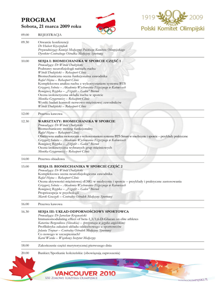 PROGRAM Sobota, 21 marca 2009 roku 09.00 REJESTRACJA 09.30 Otwarcie konferencji Dr Hubert Krysztofiak Przewodniczący Komisji Medycznej Polskiego Komitetu Olimpijskiego Dyrektor Centralnego Ośrodka Medycyny Sportowej 10.00 SESJA I: BIOMECHANIKA W SPORCIE CZĘŚĆ 1 Prowadzący: Dr Witold Dudziński Podstawy neurofizjologii narządu ruchu Witold Dudziński – Rehasport Clinic Biomechaniczna ocena funkcjonalna zawodnika Rafał Hejna – Rehasport Clinic Kompleksowa analiza ruchu z wykorzystaniem systemu BTS Grzegorz Sobota – Akademia Wychowania Fizycznego w Katowicach Remigiusz Rzepka – „Fizjofit – Galen” Bieruń Ocena izokinetyczna układu ruchu w sporcie Monika Grygorowicz – Rehasport Clinic Wyniki badań kontroli nerwowo-mięśniowej zawodników Witold Dudziński – Rehasport Clinic 12.00 Przerwa kawowa 12.30 WARSZTATY: BIOMECHANIKA W SPORCIE Prowadzący: Dr Witold Dudziński Biomechaniczny trening funkcjonalny Rafał Hejna – Rehasport Clinic Obiektywna analiza motoryczna z wykorzystaniem systemu BTS Smart w medycynie i sporcie – przykłady praktyczne Grzegorz Sobota – Akademia Wychowania Fizycznego w Katowicach Remigiusz Rzepka – „Fizjofit – Galen” Bieruń Ocena izokinetyczna wybranych grup mięśniowych Monika Grygorowicz – Rehasport Clinic 14.00 Przerwa obiadowa 15.00 SESJA II: BIOMECHANIKA W SPORCIE CZĘŚĆ 2 Prowadzący: Dr Witold Dudziński Kompleksowa ocena neurofizjologiczna zawodnika Rafał Hejna – Rehasport Clinic Ocena aktywności mięśniowej sEMG w medycynie i sporcie – przykłady i praktyczne zastosowania Grzegorz Sobota – Akademia Wychowania Fizycznego w Katowicach Remigiusz Rzepka – „Fizjofit – Galen” Bieruń Propriocepcja w psychologii Marek Graczyk – Centralny Ośrodek Medycyny Sportowej 16.00 Przerwa kawowa 16.30 SESJA III: UKŁAD ODPORNOŚCIOWY SPORTOWCA Prowadzący: Dr Jarosław Krzywański Immunomodulating effect of beta-1,3/1,6-D-Glucan on elite athletes Katarina Bergendiova (Slovakia) – (prezentacja w języku angielskim) Profilaktyka zakażeń układu oddechowego u sportowców Jolanta Trojnar – Centralny Ośrodek Medycyny Sportowej Co nowego w szczepieniach? Karol Warda – Wojskowy Instytut Medyczny 18.00 Zakończenie części merytorycznej pierwszego dnia 20.00 Bankiet/Spotkanie koleżeńskie (obowiązują zaproszenia) PROGRAM Niedziela, 22 marca 2009 roku 09.00 SESJA IV: TRAUMATOLOGIA SPORTOWA Prowadzący: Dr Marek Tramś Diagnostyka obrazowa wybranych uszkodzeń okolicy stawu skokowego Marcin Dzianach – Rehasport Clinic Leczenie wybranych uszkodzeń okolicy stawu skokowego. Kryteria powrotu do sportu Tomasz Piontek – Rehasport Clinic Diagnostyka obrazowa wybranych uszkodzeń stawu ramiennego Marcin Dzianach – Rehasport Clinic Leczenie wybranych uszkodzeń okolicy stawu ramiennego. Kryteria powrotu do sportu Przemysław Lubiatowski – Rehasport Clinic Model kompleksowego leczenia pacjenta z uszkodzeniem barku Przemysław Lubiatowski, Marcin Dzianach, Rafał Hejna – Rehasport Clinic Sonochirurgia – zastosowanie ultrasonografii zabiegowej Zbigniew Pilecki – Polski Związek Gimnastyczny 11.00 Przerwa kawowa 11.30 SESJA V: AKTUALNOŚCI ANTYDOPINGOWE Prowadzący: Prof. Jerzy Smorawiński Tytułem wstępu …. Jerzy Smorawiński – Przewodniczący Komisji do Zwalczania Dopingu w Sporcie Zmiany w Liście Substancji i Metod Zabronionych w 2009 roku Andrzej Pokrywka – Instytut Sportu Aktualne standardy udzielania wyłączeń dla celów terapeutycznych (TUE) Jarosław Krzywański – Centralny Ośrodek Medycyny Sportowej System bezpieczeństwa pacjenta sportowca Zbigniew Pilecki – Polski Związek Gimnastyczny 13.00 Przerwa obiadowa 14.00 SESJA VI: TRENING WYSOKOŚCIOWY Prowadzący: Dr Hubert Krysztofiak, Dyr. Tadeusz Wróblewski Racjonalne zastosowanie hipoksji normobarycznej w treningu sportowym Dariusz Sitkowski – Instytut Sportu Trening wysokościowy – czy jest możliwy w Polsce? Tomasz Mikulski – Instytut Medycyny Doświadczalnej i Klinicznej PAN Ocena wydolności fizycznej w sportach wytrzymałościowych Robert Pietruszyński – Polski Związek Kolarski 15.00 Przerwa kawowa 15.30 SESJA VII: POSTĘPY W MEDYCYNIE SPORTOWEJ Prowadzący: Dr Hubert Krysztofiak, Dr Wiesław Tomaszewski Sport dzieci i młodzieży – problemy orzecznictwa Hubert Krysztofiak – Centralny Ośrodek Medycyny Sportowej Pekin 2008 - ocena i wnioski po igrzyskach olimpijskich Jarosław Krzywański, Hubert Krysztofiak – Centralny Ośrodek Medycyny Sportowej Vancouver 2010 - stan przygotowań do igrzysk olimpijskich Jarosław Krzywański, Hubert Krysztofiak – Centralny Ośrodek Medycyny Sportowej Zebranie Misji Medycznej Polskiego Komitetu Olimpijskiego 17.30 Zakończenie konferencji