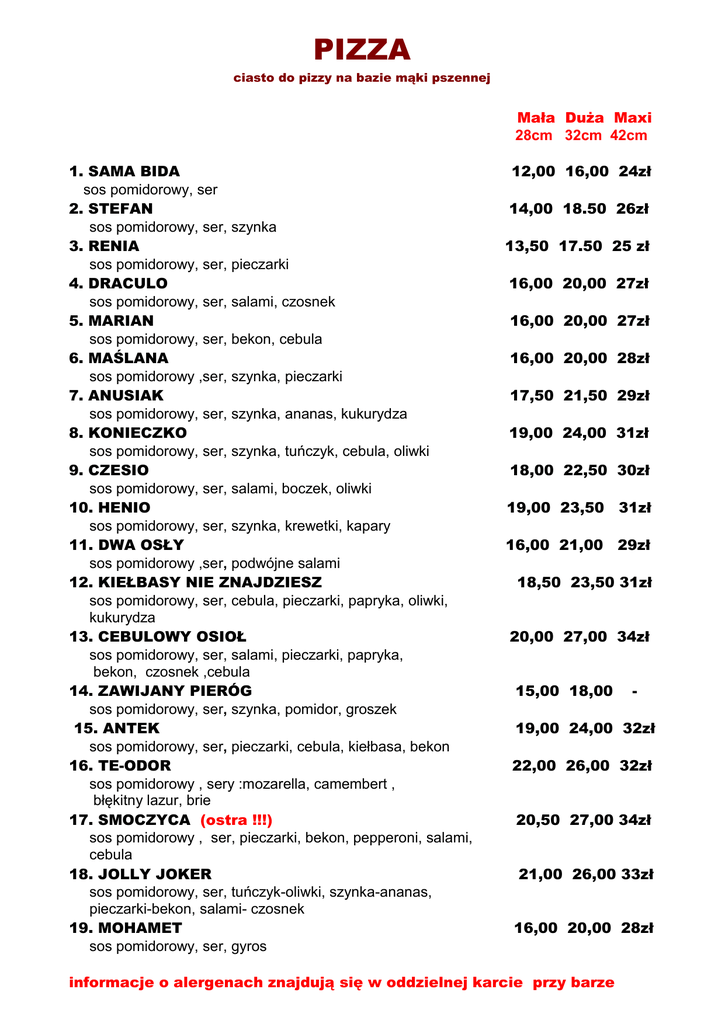 PIZZA ciasto do pizzy na bazie mąki pszennej Mała Duża Maxi 28cm 32cm 42cm 1. SAMA BIDA sos pomidorowy, ser 2. STEFAN sos pomidorowy, ser, szynka 3. RENIA sos pomidorowy, ser, pieczarki 4. DRACULO sos pomidorowy, ser, salami, czosnek 5. MARIAN sos pomidorowy, ser, bekon, cebula 6. MAŚLANA sos pomidorowy ,ser, szynka, pieczarki 7. ANUSIAK sos pomidorowy, ser, szynka, ananas, kukurydza 8. KONIECZKO sos pomidorowy, ser, szynka, tuńczyk, cebula, oliwki 9. CZESIO sos pomidorowy, ser, salami, boczek, oliwki 10. HENIO sos pomidorowy, ser, szynka, krewetki, kapary 11. DWA OSŁY sos pomidorowy ,ser, podwójne salami 12. KIEŁBASY NIE ZNAJDZIESZ sos pomidorowy, ser, cebula, pieczarki, papryka, oliwki, kukurydza 13. CEBULOWY OSIOŁ sos pomidorowy, ser, salami, pieczarki, papryka, bekon, czosnek ,cebula 14. ZAWIJANY PIERÓG sos pomidorowy, ser, szynka, pomidor, groszek 15. ANTEK sos pomidorowy, ser, pieczarki, cebula, kiełbasa, bekon 16. TE-ODOR sos pomidorowy , sery :mozarella, camembert , błękitny lazur, brie 17. SMOCZYCA (ostra !!!) sos pomidorowy , ser, pieczarki, bekon, pepperoni, salami, cebula 18. JOLLY JOKER sos pomidorowy, ser, tuńczyk-oliwki, szynka-ananas, pieczarki-bekon, salami- czosnek 19. MOHAMET sos pomidorowy, ser, gyros 12,00 16,00 24zł 14,00 18.50 26zł 13,50 17.50 25 zł 16,00 20,00 27zł 16,00 20,00 27zł 16,00 20,00 28zł 17,50 21,50 29zł 19,00 24,00 31zł 18,00 22,50 30zł 19,00 23,50 31zł 16,00 21,00 29zł 18,50 23,50 31zł 20,00 27,00 34zł 15,00 18,00 - 19,00 24,00 32zł 22,00 26,00 32zł 20,50 27,00 34zł 21,00 26,00 33zł 16,00 20,00 28zł informacje o alergenach znajdują się w oddzielnej karcie przy barze mała duża maxi 28cm 32cm 42cm 20. HYDRAULIK sos pomidorowy, ser, krewetki, małże, kraby 21. WĘDZONY KURCZAK sos czosnkowy, ser, kurczak wędzony, kukurydza, cebula 22. MARSJAŃSKA sos pomidorowy , ser, ser favita, brokuł, czosnek 23. WIELKANOCNA sos pomidorowy, ser, kiełbasa, boczek, jajko, cebula 24. WŁASNA WYDUMKA sos pomidorowy ,ser ,wybrane dodatki… 21,00 25,00 32zł 19,00 24,00 30zł 18,00 21,50 27,5zł 20,00 23,00 29zł ? ? ? DODATKI: Warzywne…………………………………………………..……………1,50 zł pomidor, ogórek, cebula, papryka, papryka peperoni lub chili, czosnek, brokuł, pieczarki, oliwki, kukurydza, groszek, kapary Mięsne………………………………………………………………… …2,50 zł szynka, boczek, salami, tuńczyk, kiełbasa Gyros ………………………………………………………………………4,00 zł mięso drobiowe z udźca przyprawione Wędzony kurczak ……………………………………………….….….4,00zł Owoce morza ……………………………………………………….….3,00 zł mix ośmiornica pospolita, kalmary, krewetki, małże Sery…………………………………………………………………..……..5,00zł Podwójne ciasto…………………………………………………….... 1,50zł informacje o alergenach znajdują się w oddzielnej karcie przy barze