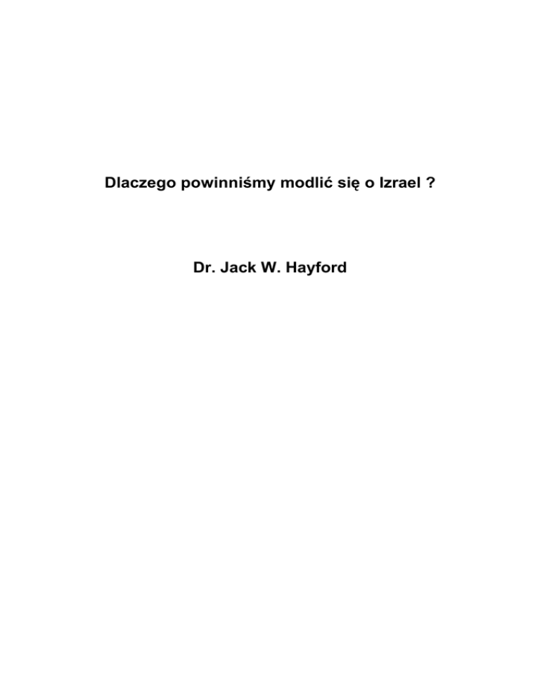 Dlaczego powinniśmy modlić się o Izrael ? Dr. Jack W. Hayford Izrael jest krajem, o którym Bóg mówi w Biblii – w sposób unikalny, proroczy, wyzwalający i wielokrotny: „To jest mój kraj.” Bóg nie mówi o żadnym innym kraju na świecie tak, jak o Izraelu. Izrael został wywyższony, aby był jasnym światłem dla innych narodów. Kościół chrześcijański składał się na początku prawie wyłącznie z Żydów do czasu, aż głoszenie Ewangelii objęło dalsze tereny. W końcu Dobra Nowina osiągnęła Antiochię, gdzie został założony pierwszy chrześcijański zbór składający się z byłych pogan; był to punkt wyjściowy do głoszenia Ewangelii na całym świecie. W Liście do Rzymian, w rozdziałach od 9 do 11, Apostoł Paweł zajmuje się zagadnieniem Bożego przeznaczenia oraz celu dla narodu żydowskiego. Te trzy rozdziały są praktycznie jedynymi w całej Biblii, które przedstawiają nam szczegółowo Bożą perspektywę i sposób postępowania Boga wobec Żydów. Żydzi byli „pierwocinami” ... „pierwszymi ludźmi” (przez Abrahama), którzy rozumieli, że Bóg jest Bogiem przymierza. Oni przekazali dalej światu bogactwo tej prawdy i przez nich Mesjasz przyszedł na świat. W Biblii Żydzi są określani jako „korzeń/pień” a chrześcijanie jako „gałęzie”. Biblia przypomina nam, że nawet, jeżeli „niektórzy z nich zostali odłamani z powodu niewiary, ty zaś trwasz dzięki wierze” (Rzym.11,20), nie powinniśmy się wywyższać, lecz strzec: „Jeśli bowiem Bóg nie oszczędził gałęzi naturalnych, nie oszczędzi też ciebie.” (Rzym.11,21) Gdy zostanie osiągnięta pełnia pogan, „zostanie zbawiony cały Izrael”. (por. Rzym.11,16-27) Dlaczego jednak powinniśmy modlić się o Izrael dzisiaj ? Żyjemy w czasie, który wymaga czujności i trzeźwości. My, którzy wierzymy w Jezusa Chrystusa, jesteśmy wezwani, aby stać po stronie Izraela. Możliwe, że jesteśmy ludźmi ostatniej godziny. W obliczu proroctw nie możemy zachowywać się pasywnie; powinniśmy gorliwie się modlić, wstawiać i służyć Bogu zgodnie ze Słowem naszego Zbawiciela, który powiedział, że nie jest naszym zadaniem spekulować na temat końca świata. Naszym obowiązkiem jest reprezentować Boże Królestwo, aż On powróci. (por. Łuk.19,13) Nie chodzi o politykę, chodzi o Słowo Boże, ale polityczna sytuacja jest bardzo dramatyczna. Pismo mówi, że przyjdzie czas, w którym wszystkie narody zwrócą się przeciw Izraelowi. Jest bardzo prawdopodobne, że stanie się to w naszych czasach. Dlatego niezmiernie ważne jest, abyśmy zastanowili się, dlaczego właśnie dziś powinniśmy stać po stronie Izraela. 2 8 powodów, dla których powinniśmy stać po stronie Izraela 1. Każdy wierzący jest wezwany do tego, aby w jego systemie wartości Żydzi zajmowali szczególne miejsce oraz, aby dziękować Bogu z głębi serca za to, co uczynił On przez swój naród. Jeżeli zrozumiemy, jak istotny jest szacunek wobec Żydów, zrozumiemy również Boże powołanie i rzeczy, które Bóg powiedział w tym kontekście. Dotyczy to narodu i kraju. • Każdy wierzący jest wezwany do tego, aby w jego systemie wartości Żydzi zajmowali szczególne miejsce, gdyż tak jest u Boga. • Pan wybrał sobie naród ... Zaczął od wyszukania mężczyzny imieniem Abraham. Pan powiedział, że przez Abrahama i Sarę i przez obiecanego im syna Izaaka będą błogosławione wszystkie narody na ziemi i każdy człowiek będzie miał dostęp do tego błogosławieństwa. • W 1Mojż.12,3 Pan zawiera przymierze z Abrahamem i mówi: „Będę błogosławił błogosławiącym tobie, a przeklinających cię przeklinać będę; i będą przez ciebie błogosławione wszystkie plemiona ziemi.” To dotyczy nie tylko Żydów jako narodu, lecz także ich kraju – Izraela. Bóg będzie sądził narody i rozprawiał się z nimi z powodu ich decyzji tak samo, jak czyni to z pojedynczą osobą. • Pan dokonał wyboru celowo: „... Izraelitów, do których należy synostwo i chwała, i przymierza, i nadanie zakonu, i służba Boża, i obietnice; do których należą ojcowie i z których pochodzi Chrystus według ciała; Ten jest ponad wszystkim, Bóg błogosławiony na wieki. Amen. (Rzym.9,4-5) Synostwo: Boża decyzja wybrania potomków Abrahama jako narodu. Chwała: Manifestująca się, uchwytna obecność Boga, który się sam objawia. Przymierza: Zobowiązania, które Bóg podejmuje. Przymierze z Abrahamem: Bóg mówi: „Dam ci potomstwo i ziemię; przez twoje potomstwo będą błogosławione wszystkie narody.” (por. 1 Mojż.17) 3 Przymierze z Mojżeszem: Objawienie zakonu danego nam jako pouczenie, aby doprowadzić nas do Chrystusa. Jesteśmy zbawieni przez Krew Baranka. Nowe Przymierze: W Ks. Jeremiasza (31,33) i Ezechiela (11,19-20; 36,26-27) Bóg mówi podobnymi słowami: „Lecz takie przymierze zawrę z domem izraelskim po tych dniach, mówi Pan: Złożę mój zakon w ich wnętrzu i wypiszę go na ich sercu.” Największy dar: Cud podarowania ludzkości Jezusa. Bóg tak nas umiłował, że dał Swojego jednorodzonego Syna ...; dał Go przez Żydów i Jezus przyszedł jako Żyd. Jezus sam powiedział, gdy rozmawiał z kobietą z Samarii: „Zbawienie pochodzi od Żydów.” (Jan 4,22) Pismo mówi więc do nas bardzo jasno: Chodzi o korzenie tego wszystkiego, co dotyczy Bożego objawienia wobec ludzkości. Wyraźnym dowodem jest rzeczywista egzystencja Żydów jako narodu oraz fakt, iż znowu posiadają oni własne państwo. Dziś walka toczy się o Izrael, o Jeruzalem, o obecność Żydów i ich prawo do swojego kraju. Niewiele narodów jest gotowych, aby zobowiązać się do wiernego wspierania Żydów i Izraela. Biblia mówi jednoznacznie, że Bóg uczci tych, którzy będą to czynić. 2. Nasza pozycja jest według Bożego postanowienia nierozdzielnie związana z narodem żydowskim a przez to również z krajem Izrael. Przez budowanie naszej wiary na Zbawicielu, 