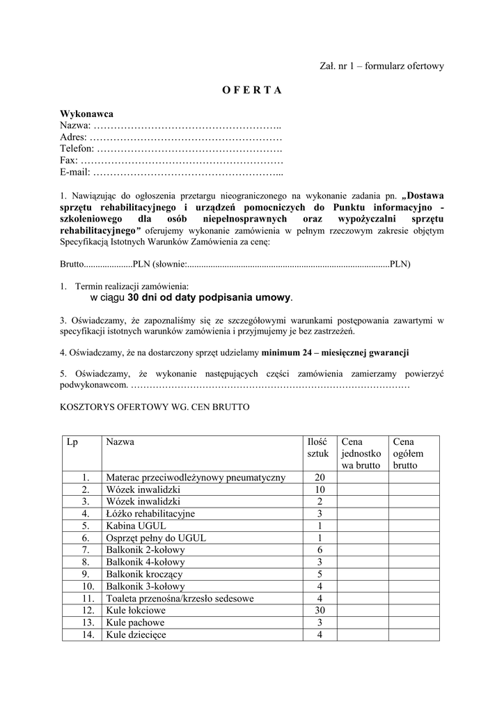 Zał. nr 1 – formularz ofertowy OFERTA Wykonawca Nazwa: ……………………………………………….. Adres: ………………………………………………… Telefon: ………………………………………………. Fax: …………………………………………………… E-mail: ………………………………………………... 1. Nawiązując do ogłoszenia przetargu nieograniczonego na wykonanie zadania pn. „Dostawa sprzętu rehabilitacyjnego i urządzeń pomocniczych do Punktu informacyjno szkoleniowego dla osób niepełnosprawnych oraz wypoŜyczalni sprzętu rehabilitacyjnego” oferujemy wykonanie zamówienia w pełnym rzeczowym zakresie objętym Specyfikacją Istotnych Warunków Zamówienia za cenę: Brutto.....................PLN (słownie:.......................................................................................PLN) 1. Termin realizacji zamówienia: w ciągu 30 dni od daty podpisania umowy. 3. Oświadczamy, Ŝe zapoznaliśmy się ze szczegółowymi warunkami postępowania zawartymi w specyfikacji istotnych warunków zamówienia i przyjmujemy je bez zastrzeŜeń. 4. Oświadczamy, Ŝe na dostarczony sprzęt udzielamy minimum 24 – miesięcznej gwarancji 5. Oświadczamy, Ŝe wykonanie następujących części zamówienia zamierzamy powierzyć podwykonawcom. ……………………………………………………………………………… KOSZTORYS OFERTOWY WG. CEN BRUTTO Lp Nazwa 1. 2. 3. 4. 5. 6. 7. 8. 9. 10. 11. 12. 13. 14. Materac przeciwodleŜynowy pneumatyczny Wózek inwalidzki Wózek inwalidzki ŁóŜko rehabilitacyjne Kabina UGUL Osprzęt pełny do UGUL Balkonik 2-kołowy Balkonik 4-kołowy Balkonik kroczący Balkonik 3-kołowy Toaleta przenośna/krzesło sedesowe Kule łokciowe Kule pachowe Kule dziecięce Ilość sztuk 20 10 2 3 1 1 6 3 5 4 4 30 3 4 Cena jednostko wa brutto Cena ogółem brutto 15. 16. 17. 18. 19. 20. 21. 22. 23. 24. 25. 26. 27. 28. 29. 30. 31. 32. 33. 34. 35. 36. 37. 38. 39. 40. 41. 42. 43. 44. 45. 46. 47. 48. 49. 50. 51. 52. 53. 54. 55. Laski Wózek prysznicowo-toaletowy Wózek inwalidzki toaletowy Krzesło prysznicowe Rower rehabilitacyjny Rotor kończyn górnych Rotor kończyn dolnych Rotor kończyn górnych i dolnych Podnośnik wannowy + nakładka Podnośnik wannowy Rampa podjazdowa dwukrotnie składana rozmiar 76x180 cm Rampa podjazdowa jednokrotnie składana rozmiar 76x150 cm Pionizator dla dorosłych i dzieci Materac rehabilitacyjny 3-częściowy składany Materac rehabilitacyjny 1-częściowy Mata gimnastyczna z kolcami Inhalator Lampa solux Mata do kąpieli bąbelkowej Poduszki p/odleŜynowe Poduszki pod łokcie z siemienia Poduszka – rogal z siemienia Poduszka 3-komorowa z siemienia KrąŜek pod pośladki KrąŜek pod pięty Podkłady na łóŜko Wałek ortopedyczno - rehabilitacyjny Wałek ortopedyczny zmywalny Piłki do masaŜu Stabilizator siatkowy stawu kolanowego z szynami Stabilizator stawu kolanowego /neopren perforowany/ Stabilizator stawu łokciowego /neopren perforowany/ Stabilizator stawu nadgarstkowego krótki /neopren perforowany/ Stabilizator stawu skokowego z taśmą /neopren perforowany/ Prostotrzymacz Neurotemblak Kołnierz szyjny- ortopedyczny typu Florida Kołnierz szyjny – ortopedyczny typu Schanza Pas przeciwreumatyczny z bursztynem Pas lędźwiowy przeciwreumatyczny z bursztynem Drabinka rehabilitacyjna drewniana 7 1 1 4 5 1 1 1 1 1 1 1 1 2 2 2 5 1 1 7 5 4 4 4 4 5 2 2 2 2 2 2 1 2 4 2 2 2 2 2 4 56. 57. 58. 59. 60. Lustro korekcyjne Wózek sprzętowy Osprzęt do wózka Materac korekcyjny Krzesło korekcyjne 1 1 1 4 1 ………………………………………………………………………….. Podpis/y osoby upowaŜnionej do składania ofert w imieniu Wykonawcy