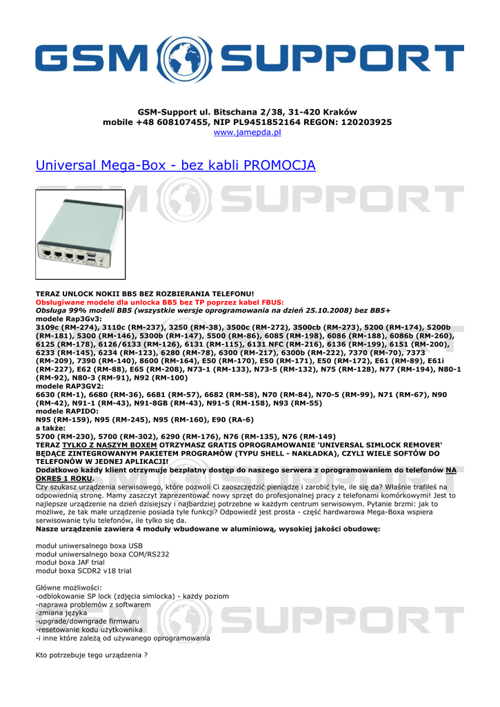 GSM-Support ul. Bitschana 2/38, 31-420 Kraków mobile +48 608107455, NIP PL9451852164 REGON: 120203925 www.jamepda.pl Universal Mega-Box - bez kabli PROMOCJA TERAZ UNLOCK NOKII BB5 BEZ ROZBIERANIA TELEFONU! Obsługiwane modele dla unlocka BB5 bez TP poprzez kabel FBUS: Obsługa 99% modeli BB5 (wszystkie wersje oprogramowania na dzień 25.10.2008) bez BB5+ modele Rap3Gv3: 3109c (RM-274), 3110c (RM-237), 3250 (RM-38), 3500c (RM-272), 3500cb (RM-273), 5200 (RM-174), 5200b (RM-181), 5300 (RM-146), 5300b (RM-147), 5500 (RM-86), 6085 (RM-198), 6086 (RM-188), 6086b (RM-260), 6125 (RM-178), 6126/6133 (RM-126), 6131 (RM-115), 6131 NFC (RM-216), 6136 (RM-199), 6151 (RM-200), 6233 (RM-145), 6234 (RM-123), 6280 (RM-78), 6300 (RM-217), 6300b (RM-222), 7370 (RM-70), 7373 (RM-209), 7390 (RM-140), 8600 (RM-164), E50 (RM-170), E50 (RM-171), E50 (RM-172), E61 (RM-89), E61i (RM-227), E62 (RM-88), E65 (RM-208), N73-1 (RM-133), N73-5 (RM-132), N75 (RM-128), N77 (RM-194), N80-1 (RM-92), N80-3 (RM-91), N92 (RM-100) modele RAP3GV2: 6630 (RM-1), 6680 (RM-36), 6681 (RM-57), 6682 (RM-58), N70 (RM-84), N70-5 (RM-99), N71 (RM-67), N90 (RM-42), N91-1 (RM-43), N91-8GB (RM-43), N91-5 (RM-158), N93 (RM-55) modele RAPIDO: N95 (RM-159), N95 (RM-245), N95 (RM-160), E90 (RA-6) a także: 5700 (RM-230), 5700 (RM-302), 6290 (RM-176), N76 (RM-135), N76 (RM-149) TERAZ TYLKO Z NASZYM BOXEM OTRZYMASZ GRATIS OPROGRAMOWANIE 'UNIVERSAL SIMLOCK REMOVER' BĘDĄCE ZINTEGROWANYM PAKIETEM PROGRAMÓW (TYPU SHELL - NAKŁADKA), CZYLI WIELE SOFTÓW DO TELEFONÓW W JEDNEJ APLIKACJI! Dodatkowo każdy klient otrzymuje bezpłatny dostęp do naszego serwera z oprogramowaniem do telefonów NA OKRES 1 ROKU. Czy szukasz urządzenia serwisowego, które pozwoli Ci zaoszczędzić pieniądze i zarobić tyle, ile się da? Właśnie trafiłeś na odpowiednią stronę. Mamy zaszczyt zaprezentować nowy sprzęt do profesjonalnej pracy z telefonami komórkowymi! Jest to najlepsze urządzenie na dzień dzisiejszy i najbardziej potrzebne w każdym centrum serwisowym. Pytanie brzmi: jak to możliwe, że tak małe urządzenie posiada tyle funkcji? Odpowiedź jest prosta - część hardwarowa Mega-Boxa wspiera serwisowanie tylu telefonów, ile tylko się da. Nasze urządzenie zawiera 4 moduły wbudowane w aluminiową, wysokiej jakości obudowę: moduł moduł moduł moduł uniwersalnego boxa USB uniwersalnego boxa COM/RS232 boxa JAF trial boxa SCDR2 v18 trial Główne możliwości: -odblokowanie SP lock (zdjęcia simlocka) - każdy poziom -naprawa problemów z softwarem -zmiana języka -upgrade/downgrade firmwaru -resetowanie kodu użytkownika -i inne które zależą od używanego oprogramowania Kto potrzebuje tego urządzenia ? osoby które już posiadają Universal Boxa na porcie COM i używają kabli Rj45 od boxów takich, jak Universal Box v2.0, v3.0, UltraLOGIC, UDK, USPIU, BlueBox. Od teraz do MegaBoxa można podłączyć rownież te kable osoby które nie mogą sobie pozwolić na zainwestowanie w pełne urządzenie z kablami - mogą kupić Mega Boxa teraz, a w przyszłości dokupić dodatkowe kable osoby które nie mogą sobie pozwolić na zakup wielu boxów, a chcą otworzyć serwis GSM - kable do Mega Boxa są znacznie tańsze od zwykłych kabli RS232 i będą pasować do innych urządzeń osoby które serwisują telefony od czasu do czasu - mogą dokupić kable, które potrzebne są w danym momencie, dlatego ta opcja jest atrakcyjna cenowo osoby które dużo podrózują - mogą podłączyć MegaBoxa do każdego komputera z portem USB - nie wymaga posiadania zewnętrznego zasilania osoby które chcą mieć najlepsze urządzenie działające bezproblemowo - urządzenie zostało wdrożone w warszatach z ISO 9001 i nie jest to produkt chiński MODUŁ SERWISOWY UNIVERSAL USB Jest to zaawansowane urządzenie pracujące tylko na porcie USB, które umożliwia transfer danych z PC do telefonu i na odwrót z prędkościa dochodzącą do 1 Mbit/s (921000 kb/s ) ! Używając tego Boxa możesz pracować od 4 do 8 razy szybciej niż używając zwykłego kabla COM, ale to nie jest jedyna zaleta tego urządzenia. Ma wbudowany 2-portowy HUB USB służący do podłączenia innych urządzeń takich, jak klucz USB HASP i Smart Card. Jest to wspaniałe urządzenie specjalnie dla ludzi, którzy posiadaja Universal Box v3.4 albo Blue Box ponieważ mogą używać kabli od tamych boxów do pracy z Mega Boxem. Także użytkownicy standardowych chińskich kabli do urządzen takich, jak: USPIU, UDK, Victory Eagle, Universal Box x1.07, Blue Box - wystarczy tylko kupić mały konwerter, który kosztuje 1,5 EUR! Kupując to urządzenie możesz pracować z softwarem do ponad 400 telefonów i wspierać takie standardy, jak S2GSM dla nowych Alcateli albo Vygis dla Mitsubishi, LG, Alcatel i innych o prędkości 0,5 Mbit/s. Dodaliśmy specjalną funkcję, która umożliwia zmianę logiczną z 3V na 5V, gdyż jest to przydatne dla obsługi nowych modeli telefonów – możesz ją ustawić poprzez zmianę pozycji przełącznika 3V / 5V. Porównanie prędkości pomiędzy innymi urządzeniami takimi, jak kabel COM, rs 232 Boxes i kablami do Mega Boxa Czas flashowania K500i (MCU+FL) - wielkość pliku 20 Mb (testowane przy uzyciu loggera wydanego przez Davinci Team Mega Box usb: 5 minut 32 sekund: Naciśnij, aby powiększyć Kable Com i inne Boxy: 27 minut 01 sekunda: Naciśnij, aby powiększyć Czas flashowania Samsung SGH-E250 - (testowane na oryginalnym downloaderze) Mega Box usb: 8 minut 04 sekundy: Naciśnij, aby powiększyć Kable Com i inne Boxy: 49 minut 37 sekund: Naciśnij, aby powiększyć Dane techniczne: - transfer dochodzący do 921000 kb/s przez port USB (~1Mbit/s) - zbudowany przy użyciu chipów FTDI FT232BM + 2 portowy HUB USB - łatwa zmiana napięcia z 3V na 5V - LEDy - PWR (zasilanie z USB), Rx (dane z telefonu), Tx (dane do telefonu), 5V (LEDy które informują, że napięcie 5V jest podłączone, co oznacza, że urządzenie pracuje w logicznym stanie 5V) - wbudowany 2-por