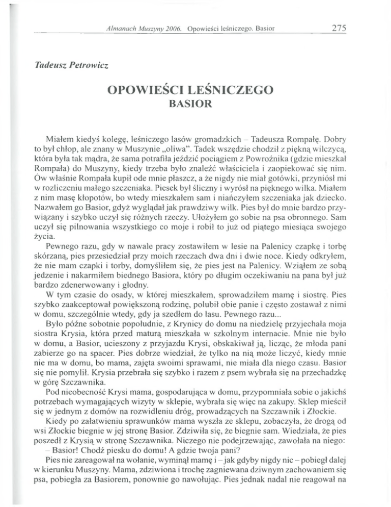 Almanach Muszyny 2006. Opowieści leśniczego. Basior 275 Tadeusz Petrow icz OPOWIEŚCI LEŚNICZEGO BASIOR Miałem kiedyś kolegę, leśniczego lasów gromadzkich - Tadeusza Rompałę. Dobry to był chłop, ale znany w Muszynie  ״oliwa”. Tadek wszędzie chodził z piękną wilczycą, która była tak mądra, że sama potrafiła jeździć pociągiem z Powroźnika (gdzie mieszkał Rompała) do Muszyny, kiedy trzeba było znaleźć właściciela i zaopiekować się nim. Ów właśnie Rompała kupił ode mnie płaszcz, a że nigdy nie miał gotówki, przyniósł mi w rozliczeniu małego szczeniaka. Piesek był śliczny i wyrósł na pięknego wilka. Miałem z nim masę kłopotów, bo wtedy mieszkałem sam i niańczyłem szczeniaka jak dziecko. Nazwałem go Basior, gdyż wyglądał jak prawdziwy wilk. Pies był do mnie bardzo przywiązany i szybko uczył się różnych rzeczy. Ułożyłem go sobie na psa obronnego. Sam uczył się pilnowania wszystkiego co moje i robił to już od piątego miesiąca swojego życia. Pewnego razu, gdy w nawale pracy zostawiłem w lesie na Palenicy czapkę i torbę skórzaną, pies przesiedział przy moich rzeczach dwa dni i dwie noce. Kiedy odkryłem, że nie mam czapki i torby, domyśliłem się, że pies jest na Palenicy. Wziąłem ze sobą jedzenie i nakarmiłem biednego Basiora, który po długim oczekiwaniu na pana był już bardzo zdenerwowany i głodny. W tym czasie do osady, w której mieszkałem, sprowadziłem mamę i siostrę. Pies szybko zaakceptował powiększoną rodzinę, polubił obie panie i często zostawał z nimi w domu, szczególnie wtedy, gdy ja szedłem do lasu. Pewnego razu... Było późne sobotnie popołudnie, z Krynicy do domu na niedzielę przyjechała moja siostra Krysia, która przed maturą mieszkała w szkolnym internacie. Mnie nie było w domu, a Basior, ucieszony z przyjazdu Krysi, obskakiwał ją, licząc, że młoda pani zabierze go na spacer. Pies dobrze wiedział, że tylko na nią może liczyć, kiedy mnie nie ma w domu, bo mama, zajęta swoimi sprawami, nie miała dla niego czasu. Basior się nie pomylił. Krysia przebrała się szybko i razem z psem wybrała się na przechadzkę w górę Szczawnika. Pod nieobecność Krysi mama, gospodarująca w domu, przypomniała sobie o jakichś potrzebach wymagających wizyty w sklepie, wybrała się więc na zakupy. Sklep mieścił się w jednym z domów na rozwidleniu dróg, prowadzących na Szczawnik i Złockie. Kiedy po załatwieniu sprawunków mama wyszła ze sklepu, zobaczyła, że drogą od wsi Złockie biegnie w jej stronę Basior. Zdziwiła się, że biegnie sam. Wiedziała, że pies poszedł z Krysią w stronę Szczawnika. Niczego nie podejrzewając, zawołała na niego: - Basior! Chodź piesku do domu! A gdzie twoja pani? Pies nie zareagował na wołanie, wyminął mamę i - jak gdyby nigdy nic - pobiegł dalej w kierunku Muszyny. Mama, zdziwiona i trochę zagniewana dziwnym zachowaniem się psa, pobiegła za Basiorem, ponownie go nawołując. Pies jednak nadal nie reagował na 276 Tadeusz Petrowicz wołanie, popatrzył jakoś dziwnie ponuro na mamę, pobiegł jeszcze kawałek dalej, by po chwili skręcić na Basztę, czyli w stronę lasu, nie do domu. Mama jednak postanowiła psa zawrócić i, już zła na niego, ruszyła w kierunku Baszty. Tymczasem Basior, kiedy był już pod lasem, usiadł i jakby czekał spokojnie na spotkanie. Kiedy mama podeszła całkiem blisko, coś ją tknęło, że to może nie być Basior. Zatrzymała się, strach ją obleciał i pędem wróciła do domu. Jakie było jej zdziwienie, kiedy przed dom na jej spotkanie wybiegł z radosnym szczekaniem pies, a za nim ukazała się Krysia, która, zastawszy zamknięte mieszkanie, wybrała się naprzeciw mamie. Jak się okazało, tym domniemanym Basiorem był prawdziwy wilk, który bezczelnie szedł sobie drogą i wyprowadził mamę pod sam las. Całe szczęście, że tam pod Basztą strach ją obleciał, bo cała ta przygoda mogła mieć mniej wesoły finał, o czym świadczyła zdecydowana postawa wilka. O tym, że wilki grasowały w muszyńskich lasach, wiedziałem, ale przygoda mamy dowiodła niezbicie, że bywają czasem okoliczności, o których nam się nawet nie śni. Wilki, przypadkowo spotkane w pobliżu siedzib ludzkich, mogą być nieraz brane za psy i obecność ich na naszym terenie często pozostaje niezauważona. Basiorowi zrobiłem jednak brzydki kawał. Po jakimś czasie, kiedy kupiłem Darusia, Basiora dałem mojej sympatii, Grażynie. Pies bardzo tęsknił za m ną i uciekał do leśniczówki, chociaż dostał się w bardzo dobre ręce. W końcu jednak polubił nową panią i przywiązał się do niej. Tak naprawdę miałem swoją kalkulację, dając Basiora Grażynie. Liczyłem, że pies razem z panią wróci do mnie, dlatego z tak lekkim sercem go podarowałem. Ale stało się inaczej. Grażyna wyjechała na studia do Krakowa (skończyła architekturę) i ani ona, ani pies do Muszyny nie wrócili.