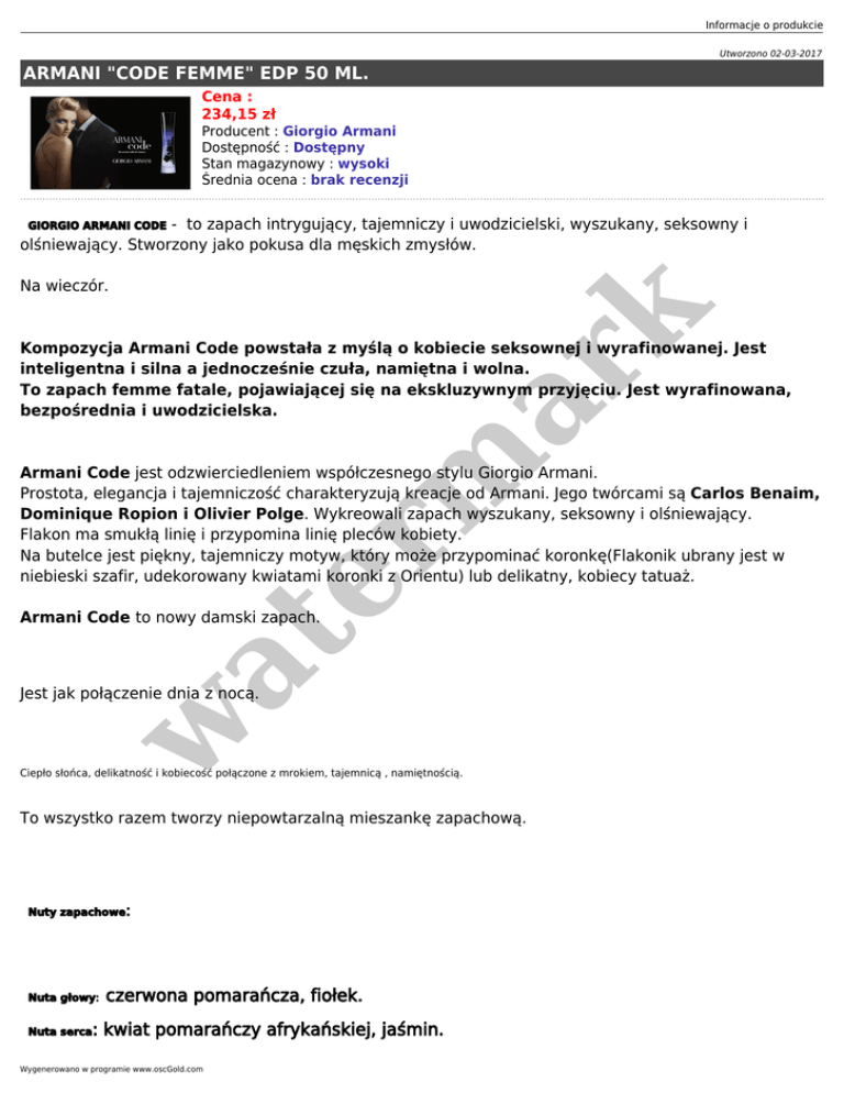 Informacje o produkcie Utworzono 02-03-2017 ARMANI "CODE FEMME" EDP 50 ML. Cena : 234,15 zł Producent : Giorgio Armani Dostępność : Dostępny Stan magazynowy : wysoki Średnia ocena : brak recenzji - to zapach intrygujący, tajemniczy i uwodzicielski, wyszukany, seksowny i olśniewający. Stworzony jako pokusa dla męskich zmysłów. GIORGIO ARMANI CODE er m ar k Na wieczór. Kompozycja Armani Code powstała z myślą o kobiecie seksownej i wyrafinowanej. Jest inteligentna i silna a jednocześnie czuła, namiętna i wolna. To zapach femme fatale, pojawiającej się na ekskluzywnym przyjęciu. Jest wyrafinowana, bezpośrednia i uwodzicielska. Armani Code jest odzwierciedleniem współczesnego stylu Giorgio Armani. Prostota, elegancja i tajemniczość charakteryzują kreacje od Armani. Jego twórcami są Carlos Benaim, Dominique Ropion i Olivier Polge. Wykreowali zapach wyszukany, seksowny i olśniewający. Flakon ma smukłą linię i przypomina linię pleców kobiety. Na butelce jest piękny, tajemniczy motyw, który może przypominać koronkę(Flakonik ubrany jest w niebieski szafir, udekorowany kwiatami koronki z Orientu) lub delikatny, kobiecy tatuaż. at Armani Code to nowy damski zapach. w Jest jak połączenie dnia z nocą. Ciepło słońca, delikatność i kobiecość połączone z mrokiem, tajemnicą , namiętnością. To wszystko razem tworzy niepowtarzalną mieszankę zapachową. Nuty zapachowe: Nuta głowy: Nuta serca czerwona pomarańcza, fiołek. : kwiat pomarańczy afrykańskiej, jaśmin. Wygenerowano w programie www.oscGold.com : miód, wanilia, drzewo sandałowe. Nuta bazy w at er m ar k premiera: 2006