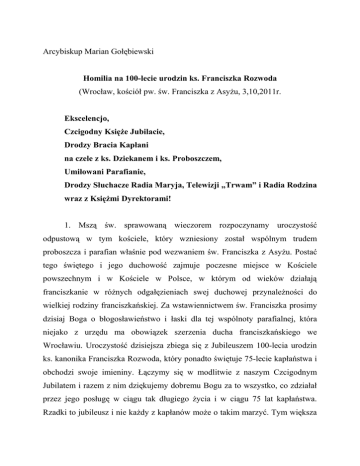 Arcybiskup Marian Gołębiewski Homilia na 100-lecie urodzin ks. Franciszka Rozwoda (Wrocław, kościół pw. św. Franciszka z Asyżu, 3,10,2011r. Ekscelencjo, Czcigodny Księże Jubilacie, Drodzy Bracia Kapłani na czele z ks. Dziekanem i ks. Proboszczem, Umiłowani Parafianie, Drodzy Słuchacze Radia Maryja, Telewizji „Trwam” i Radia Rodzina wraz z Księżmi Dyrektorami! 1. Mszą św. sprawowaną wieczorem rozpoczynamy uroczystość odpustową w tym kościele, który wzniesiony został wspólnym trudem proboszcza i parafian właśnie pod wezwaniem św. Franciszka z Asyżu. Postać tego świętego i jego duchowość zajmuje poczesne miejsce w Kościele powszechnym i w Kościele w Polsce, w którym od wieków działają franciszkanie w różnych odgałęzieniach swej duchowej przynależności do wielkiej rodziny franciszkańskiej. Za wstawiennictwem św. Franciszka prosimy dzisiaj Boga o błogosławieństwo i łaski dla tej wspólnoty parafialnej, która niejako z urzędu ma obowiązek szerzenia ducha franciszkańskiego we Wrocławiu. Uroczystość dzisiejsza zbiega się z Jubileuszem 100-lecia urodzin ks. kanonika Franciszka Rozwoda, który ponadto świętuje 75-lecie kapłaństwa i obchodzi swoje imieniny. Łączymy się w modlitwie z naszym Czcigodnym Jubilatem i razem z nim dziękujemy dobremu Bogu za to wszystko, co zdziałał przez jego posługę w ciągu tak długiego życia i w ciągu 75 lat kapłaństwa. Rzadki to jubileusz i nie każdy z kapłanów może o takim marzyć. Tym większa 2 jest nasza radość z racji tak wspaniałego jubileuszu współbrata w kapłaństwie, tym większa jest nasza wdzięczność wobec Boga, który w swojej Opatrzności wykreśla los każdemu człowiekowi. 2. Liturgia słowa z dzisiejszej uroczystości przypomina nam co powinno być przedmiotem dumy każdego ucznia Chrystusa. „Co do mnie, nie daj Boże, bym się miał chlubić z czego innego, jak tylko z krzyża Pana naszego Jezusa Chrystusa, dzięki któremu świat stał się ukrzyżowany dla mnie, a ja dla świata”. W tym wyznaniu św. Pawła czuje się siłę przekonania, odwagę i wierność. Krzyż Zbawiciela jest miejscem tylu śmierci: przede wszystkim umarł na nim Chrystus za nasze grzechy, razem z Chrystusem został ukrzyżowany on, Paweł, by umrzeć dla Prawa. Na krzyżu umarli ci wszyscy, którzy stanowią jedność z Chrystusem, i dzięki temu uległo śmierci ciało ze wszystkimi namiętnościami i pożądliwościami. Na krzyżu wreszcie znalazł śmierć dawny człowiek. Dzięki krzyżowi „świat” – wszystko, co reprezentuje „ciało”, „grzech”, a więc postawę egoistyczną, przestało istnieć dla Pawła, a także on dla tego wszystkiego, co trzeba określić terminem „świat”. Świat współczesny, naznaczony piętnem konsumizmu i hedonizmu, boi się krzyża. Również wielu współczesnych chrześcijan ulega tej pokusie, by urządzić świat bez krzyża, gdy tymczasem krzyż stanowi centrum orędzia Ewangelii. W Ewangelii dzisiejszej usłyszeliśmy słowa: „Wysławiam Cię, Ojcze, Panie nieba i ziemi, że zakryłeś te rzeczy przed mądrymi i roztropnymi, a objawiłeś je prostaczkom. Tak Ojcze, gdyż takie było Twoje upodobanie”. Mądrość Boża, objawienie Boże, odsłania się człowiekowi nie wtedy, kiedy przejęty jest swoją ważnością i przekonany o swej mądrości, ale wtedy właśnie, kiedy przestaje liczyć na swą mądrość, kiedy uznaje swoją niemoc. Bóg objawia siebie na swój własny sposób. W tym procesie objawiania szczególna rola przysługuje ludziom niezauważalnym, skromnym, uznającym swoją małość wobec Boga i ludzi. Wraz z objawieniem prawdziwej mądrości ofiarowany jest człowiekowi pokój. Pokój taki jest czymś więcej niż odpoczynkiem po 3 pracowitym dniu. Serce człowieka odnajduje pokój, kiedy przyodziewa się w dobroć i miłość Chrystusa i idzie za swoim Mistrzem, naśladując Go. Słowa Ewangelii są wyzwaniem dla tych, którzy jako „mądrzy i roztropni” odrzucają orędzie chrześcijańskie i negują chrześcijańskie korzenie Europy. Przypominają zarazem, że ekspertami w dziedzinie wiary są ludzie święci, prości i niekoniecznie uczeni. 3. Jak w świetle liturgii słowa przedstawia nam się osoba św. Franciszka z Asyżu? Do jakiej kategorii ludzi byśmy go zaliczyli? Chyba do tych „prostaczków”, którzy są uważnymi słuchaczami słowa Bożego. Nie bez racji zwykliśmy go nazywać „biedaczyną z Asyżu”. Jego powołanie rozpoczęło się od spotkania z trędowatym. Franciszek przed swoim nawróceniem unikał kontaktu z trędowatymi, unikał i odwracał się od nich, aby się nie zarazić. Pewnego dnia przezwyciężył ten lęk i odrazę. Co więcej, ucałował trędowatego z szacunkiem i litością. To był punkt zwrotny w jego życiu. Jego serce napełniła wewnętrzna radość. Doznał uzdrowienia z trądu lęku i bezduszności wobec cierpienia trędowatych. Opuścił dom rodzinny, rozstał się ze stylem życia złotej młodzieży, założył wspólnotę zakonną, którą ustnie zatwierdził papież w 1209 r. Odtąd chciał naśladować Jezusa ubogiego i pokornego. Ubogie narodzenie Jezusa w Betlejem, Jego mękę krzyżową i śmierć uczcił inscenizacją szopki betlejemskiej w miejscowości Grecio w 1223 r. W roku 1224 udał się na Górę Alwernię, gdzie podjął 40-dniowy post, w czasie którego dnia 14 września, w święto Podwyższenia Krzyża świętego, ukazał mu się Chrystus w postaci serafina na krzyżu i odbił na ciele Franciszka swoje najświętsze rany – stygmaty na dłoniach i stopach z wyraźnymi śladami gwoździ. Czuł się bardzo zawstydzony wskutek tego niezwykłego wyróżnienia, które zostało urzędowo potwierdzone przez Kościół. Odtąd mógł się chlubić tylko z krzyża Pana naszego Jezusa Chrystusa. Franciszek był mężem modlitwy. Często udawał się w tym celu na pustelnię, do górskich grot skalnych, aby tam się modlić. W kazaniach, 