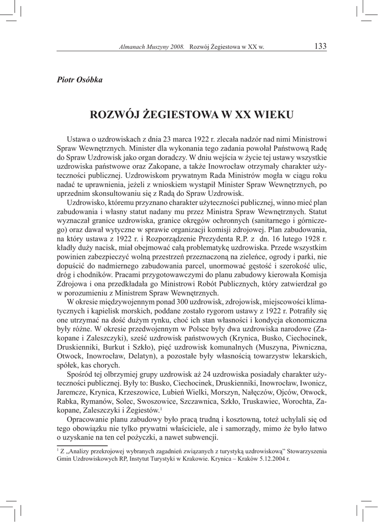 Almanach Muszyny 2008. Rozwój Żegiestowa w XX w. 133 Piotr Osóbka ROZWÓJ ŻEGIESTOWA W XX WIEKU Ustawa o uzdrowiskach z dnia 23 marca 1922 r. zlecała nadzór nad nimi Ministrowi Spraw Wewnętrznych. Minister dla wykonania tego zadania powołał Państwową Radę do Spraw Uzdrowisk jako organ doradczy. W dniu wejścia w życie tej ustawy wszystkie uzdrowiska państwowe oraz Zakopane, a także Inowrocław otrzymały charakter użyteczności publicznej. Uzdrowiskom prywatnym Rada Ministrów mogła w ciągu roku nadać te uprawnienia, jeżeli z wnioskiem wystąpił Minister Spraw Wewnętrznych, po uprzednim skonsultowaniu się z Radą do Spraw Uzdrowisk. Uzdrowisko, któremu przyznano charakter użyteczności publicznej, winno mieć plan zabudowania i własny statut nadany mu przez Ministra Spraw Wewnętrznych. Statut wyznaczał granice uzdrowiska, granice okręgów ochronnych (sanitarnego i górniczego) oraz dawał wytyczne w sprawie organizacji komisji zdrojowej. Plan zabudowania, na który ustawa z 1922 r. i Rozporządzenie Prezydenta R.P. z dn. 16 lutego 1928 r. kładły duży nacisk, miał obejmować całą problematykę uzdrowiska. Przede wszystkim powinien zabezpieczyć wolną przestrzeń przeznaczoną na zieleńce, ogrody i parki, nie dopuścić do nadmiernego zabudowania parcel, unormować gęstość i szerokość ulic, dróg i chodników. Pracami przygotowawczymi do planu zabudowy kierowała Komisja Zdrojowa i ona przedkładała go Ministrowi Robót Publicznych, który zatwierdzał go w porozumieniu z Ministrem Spraw Wewnętrznych. W okresie międzywojennym ponad 300 uzdrowisk, zdrojowisk, miejscowości klimatycznych i kąpielisk morskich, poddane zostało rygorom ustawy z 1922 r. Potrafiły się one utrzymać na dość dużym rynku, choć ich stan własności i kondycja ekonomiczna były różne. W okresie przedwojennym w Polsce były dwa uzdrowiska narodowe (Zakopane i Zaleszczyki), sześć uzdrowisk państwowych (Krynica, Busko, Ciechocinek, Druskienniki, Burkut i Szkło), pięć uzdrowisk komunalnych (Muszyna, Piwniczna, Otwock, Inowrocław, Delatyn), a pozostałe były własnością towarzystw lekarskich, spółek, kas chorych. Spośród tej olbrzymiej grupy uzdrowisk aż 24 uzdrowiska posiadały charakter użyteczności publicznej. Były to: Busko, Ciechocinek, Druskienniki, Inowrocław, Iwonicz, Jaremcze, Krynica, Krzeszowice, Lubień Wielki, Morszyn, Nałęczów, Ojców, Otwock, Rabka, Rymanów, Solec, Swoszowice, Szczawnica, Szkło, Truskawiec, Worochta, Zakopane, Zaleszczyki i Żegiestów. Opracowanie planu zabudowy było pracą trudną i kosztowną, toteż uchylali się od tego obowiązku nie tylko prywatni właściciele, ale i samorządy, mimo że było łatwo o uzyskanie na ten cel pożyczki, a nawet subwencji. Z „Analizy przekrojowej wybranych zagadnień związanych z turystyką uzdrowiskową” Stowarzyszenia Gmin Uzdrowiskowych RP, Instytut Turystyki w Krakowie. Krynica – Kraków 5.12.2004 r. 1 134 Piotr Osóbka W Żegiestowie, zanim doszło do powołania komisji zdrojowej, przewidzianej ustawą, inicjatywę uporządkowania spraw uzdrowiskowych podjął główny reprezentant Spółki Udziałowej, wówczas członek Zarządu, Jędrzej Krukierek. Z jego inicjatywy została w czerwcu 1922 r. zwołana konferencja, w której wzięły udział osoby będące później członkami komisji zdrojowej. W zebraniu uczestniczyli: inż. Władysław Piotrowski z Dyrekcji Robót Publicznych w Krakowie, dr Bolesław Kwaśniewski – lekarz zakładowy i Ryszard Schwarz – sekretarz gminy w Żegiestowie, który był członkiem pierwszej Komisji Zdrojowej, powołanej w 1913 r. Na konferencji Krukierek przedstawił pełny program potrzeb Zdroju. Projekt ten obejmował: regulację Zdroju i wyznaczenie granicy ochrony sanitarnej, zabudowę Łopaty i stworzenie tam odrębnego ośrodka zdrojowego, zabudowę terenów od przystanku kolejowego do kościółka i wyznaczenie parcel pod budownictwo prywatne, a oprócz tego zasklepienie Szczawnika, zasypanie jaru i utworzenie deptaku jako ośrodka rekreacyjnego, przeprowadzenie wierceń dla uzyskania nowego źródła wody mineralnej, przebudowę ujęcia źródła „Anny” i wymianę rurociągu do nowych łazienek. W projekcie przewidziano także zagospodarowanie skrawka leżącego między Szczawnikiem a Zimnym Potokiem, który był własnością państwa, lecz Spółka zamierzała go nabyć i rozparcelować. W parę lat później teren ten przeszedł w posiadanie Spółki drogą wymiany za grunty leżące w innym rejonie. Żegiestowskie pensjonaty: „Warszawianka”, „Sanato”, „Elżka”, „Polonia”, „Zamek”. Pocztówka z lat 30. XX wieku Żegiestów posiadał trzy kompleksy terenów nadających się do zabudowy. Tylko jeden z nich miał zatwierdzony przez Ministerstwo Robót Publicznych plan zabudowy. Był nim właściwy Zdrój, który obejmował teren wokół deptaku. Rozchodziły się stąd trzy drogi, jedna do źródła „Anna”, druga do przystanku kolejowego i trzecia do Zimnego Potoku. Teren ten, obejmujący 1380 ha, przygotowali do zabudowy specjaliści z Urzędu Almanach Muszyny 2008. Rozwój Żegiestowa w XX w. 135 Wojewódzkiego z Krakowa w ten sposób, że ok. 4 ha podzielili na działki budowlane, a resztę przeznaczyli dla parku zdrojowego i pod budowę obiektów użyteczności publicznej. Tu miały powstać domy sanatoryjne, łazienki, biura, sklepy i miała się koncentrować działalność kulturalna i rozrywkowa. W tej części Zarząd sprzedał w 1927 roku kilkanaście parceli, na których wybudowano w 1929 dobrze urządzony pensjonat „Warszawiankę”, własność dra A. Urbana, i „Malutką” J. Damse. Natomiast rozpoczęta w tym czasie przez lekarza zakładowego dra L. Kotulskiego budowa dużego pensjonatu doczekała się wykończenia dopiero w 1960 roku przez Skawińskie Zakłady Materiałów Ogniotrwałych w Skawinie, jako dom wypoczynkowy „Prometeusz” (teraz mieści się tam dom opieki spo