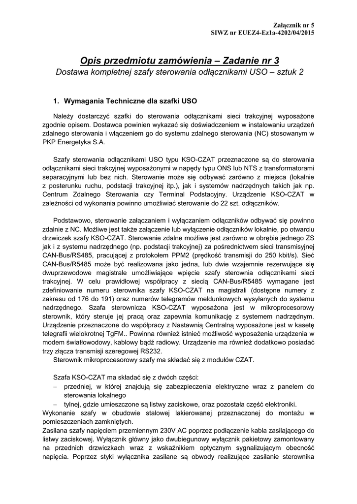 Załącznik nr 5 SIWZ nr EUEZ4-Ez1a-4202/04/2015 Opis przedmiotu zamówienia – Zadanie nr 3 Dostawa kompletnej szafy sterowania odłącznikami USO – sztuk 2 1. Wymagania Techniczne dla szafki USO Należy dostarczyć szafki do sterowania odłącznikami sieci trakcyjnej wyposażone zgodnie opisem. Dostawca powinien wykazać się doświadczeniem w instalowaniu urządzeń zdalnego sterowania i włączeniem go do systemu zdalnego sterowania (NC) stosowanym w PKP Energetyka S.A. Szafy sterowania odłącznikami USO typu KSO-CZAT przeznaczone są do sterowania odłącznikami sieci trakcyjnej wyposażonymi w napędy typu ONS lub NTS z transformatorami separacyjnymi lub bez nich. Sterowanie może się odbywać zarówno z miejsca (lokalnie z posterunku ruchu, podstacji trakcyjnej itp.), jak i systemów nadrzędnych takich jak np. Centrum Zdalnego Sterowania czy Terminal Podstacyjny. Urządzenie KSO-CZAT w zależności od wykonania powinno umożliwiać sterowanie do 22 szt. odłączników. Podstawowo, sterowanie załączaniem i wyłączaniem odłączników odbywać się powinno zdalnie z NC. Możliwe jest także załączenie lub wyłączenie odłączników lokalnie, po otwarciu drzwiczek szafy KSO-CZAT. Sterowanie zdalne możliwe jest zarówno w obrębie jednego ZS jak i z systemu nadrzędnego (np. podstacji trakcyjnej) za pośrednictwem sieci transmisyjnej CAN-Bus/RS485, pracującej z protokołem PPM2 (prędkość transmisji do 250 kbit/s). Sieć CAN-Bus/R5485 może być realizowana jako jedna, lub dwie wzajemnie rezerwujące się dwuprzewodowe magistrale umożliwiające wpięcie szafy sterownia odłącznikami sieci trakcyjnej. W celu prawidłowej współpracy z siecią CAN-Bus/R5485 wymagane jest zdefiniowanie numeru sterownika szafy KSO-CZAT na magistrali (dostępne numery z zakresu od 176 do 191) oraz numerów telegramów meldunkowych wysyłanych do systemu nadrzędnego. Szafa sterownicza KSO-CZAT wyposażona jest w mikroprocesorowy sterownik, który steruje jej pracą oraz zapewnia komunikację z systemem nadrzędnym. Urządzenie przeznaczone do współpracy z Nastawnią Centralną wyposażone jest w kasetę telegrafii wielokrotnej TgFM.. Powinna również istnieć możliwość wyposażenia urządzenia w modem światłowodowy, kablowy bądź radiowy. Urządzenie ma również dodatkowo posiadać trzy złącza transmisji szeregowej RS232. Sterownik mikroprocesorowy szafy ma składać się z modułów CZAT. Szafa KSO-CZAT ma składać się z dwóch części: przedniej, w której znajdują się zabezpieczenia elektryczne wraz z panelem do sterowania lokalnego tylnej, gdzie umieszczone są listwy zaciskowe, oraz pozostała część elektroniki. Wykonanie szafy w obudowie stalowej lakierowanej przeznaczonej do montażu w pomieszczeniach zamkniętych. Zasilana szafy napięciem przemiennym 230V AC poprzez podłączenie kabla zasilającego do listwy zaciskowej. Wyłącznik główny jako dwubiegunowy wyłącznik pakietowy zamontowany na przednich drzwiczkach wraz z wskaźnikiem optycznym sygnalizującym obecność napięcia. Poprzez styki wyłącznika zasilane są obwody realizujące zasilanie sterownika Załącznik nr 5 SIWZ nr EUEZ4-Ez1a-4202/04/2015 mikroprocesorowego, transformatora dostarczającego napięcia potrzebne do sterowania odłącznikami oraz gniazda wtykowego. Sygnał analogowy informujący o stanie odłącznika (pobierany z napędu odłącznika), przekazywany jest do sterownika mikroprocesorowego za pośrednictwem modułu pomiarowego CZAT. Na podstawie tych informacji sterownik określa czy odłącznik jest włączony, wyłączony czy też stan jego nie jest określony lub czy ewentualnie nie wystąpiła przerwa na kablu sterowniczym. Poza tym, w oparciu o te sygnały, sterownik mikroprocesorowy nadzoruje na bieżąco aktualne możliwości szafy informując o tym obsługę. Sterownik powinien: przed każdym sterowaniem automatycznie przydzielać wartość napięcia sterującego odłącznik w zależności od warunków elektrycznych panujących w obwodzie sterowania, podpowiadać użytkownikowi stan, w który należy odłącznik przełączyć (jeżeli jest wyłączony to podpowiada, że można go włączyć) - dzieje się to za pomocą diody świecącej się przy odpowiednim przycisku na panelu sterowania, blokować sterowanie odłącznikiem w przypadku jego uszkodzenia (np. uszkodzony kabel sterowniczy) informując o tym odpowiednim sygnałem, sprawdzać poprawność pracy transformatora dostarczającego napięć potrzebnych do sterowania odłącznikami. Meldunki zwrotne. Informacje dwustanowe (jednobitowe) o pracy szafy przekazywane są do sterownika mikroprocesorowego za pośrednictwem panelu sterowania. Są to informacje o: otwarciu pierwszych drzwiczek szafy (najniższy poziom dostępu np. dyżurny r-chu, lub serwis techniczny użytkownika) oraz jest to jednocześnie przełączenie szafy w tryb pracy „LOKALNIE" otwarciu drugich drzwiczek szafy (najwyższy poziom dostępu -serwis producenta, lub przez niego autoryzowany) przełączeniu urządzenia w tryb „PRACA SERWISOWA". Przełączenie szafy w tryb „LOKALNIE" powoduje niemożliwość sterowania zdalnego. Włączenie trybu pracy lokalnej sygnalizowane jest świeceniem odpowiedniej diody na panelu sterowania i napisem „LOK" oraz panelu CPU. Informacje o stanach odłączników „na załącz" lub „na wyłącz" przekazywane są do sterownika mikroprocesorowego w postaci dwubitowej za pośrednictwem wejść analogowych sterownika. Sterownik może odczytać maksymalnie 44 informacje dwubitowe. Dodatkowo kontrolowane są wszystkie drzwiczki (trzy informacje jednobitowe) oraz stan pracy urządzenia w trybie serwisowym. W module CZAT CPU powinien pracować program aplikacyjny, który realizuje: sterowanie załączaniem i wyłączaniem odłączników, kontrolę nad meldunkami jedno i dwustanowymi, współpracę z systemami nadrzędnymi, samokontrolę urządzenia. Dane techniczne: Zasilanie: 230V AC, 50Hz Pobór mocy w stanie czuwa