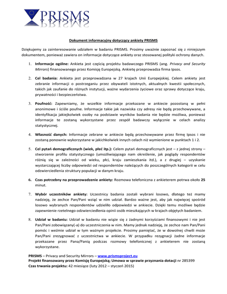 Dokument informacyjny dotyczący ankiety PRISMS Dziękujemy za zainteresowanie udziałem w badaniu PRISMS. Prosimy uważnie zapoznać się z niniejszym dokumentem, ponieważ zawiera on informacje dotyczące ankiety oraz stosowanej polityki ochrony danych. 1. Informacje ogólne: Ankieta jest częścią projektu badawczego PRISMS (ang. Privacy and Security Mirrors) finansowanego przez Komisję Europejską. Ankietę przeprowadza firma Ipsos. 2. Cel badania: Ankieta jest przeprowadzana w 27 krajach Unii Europejskiej. Celem ankiety jest zebranie informacji o postrzeganiu przez obywateli istotnych, aktualnych kwestii społecznych, takich jak zaufanie do różnych instytucji, ważne wydarzenia życiowe oraz sprawy dotyczące kraju, prywatności i bezpieczeństwa. 3. Poufność: Zapewniamy, że wszelkie informacje przekazane w ankiecie pozostaną w pełni anonimowe i ściśle poufne. Informacje takie jak nazwiska czy adresy nie będą przechowywane, a identyfikacja jakiejkolwiek osoby na podstawie wyników badania nie będzie możliwa, ponieważ informacje te zostaną wykorzystane przez zespół badawczy wyłącznie w celach analizy statystycznej. 4. Własność danych: Informacje zebrane w ankiecie będą przechowywane przez firmę Ipsos i nie zostaną ponownie wykorzystane w jakichkolwiek innych celach niż wymienione w punktach 1 i 2. 5. Cel pytań demograficznych (wiek, płeć itp.): Celem pytań demograficznych jest – z jednej strony – stworzenie profilu statystycznego (umożliwiającego nam określenie, jak poglądy respondentów różnią się w zależności od wieku, płci, kraju zamieszkania itd.), a z drugiej – uzyskanie wystarczającej liczby odpowiedzi od respondentów należących do poszczególnych kategorii w celu odzwierciedlenia struktury populacji w danym kraju. 6. Czas potrzebny na przeprowadzenie ankiety: Rozmowa telefoniczna z ankieterem potrwa około 25 minut. 7. Wybór uczestników ankiety: Uczestnicy badania zostali wybrani losowo, dlatego też mamy nadzieję, że zechce Pan/Pani wziąć w nim udział. Bardzo ważne jest, aby jak najwięcej spośród losowo wybranych respondentów udzieliło odpowiedzi w ankiecie. Dzięki temu możliwe będzie zapewnienie rzetelnego odzwierciedlenia opinii osób mieszkających w krajach objętych badaniem. 8. Udział w badaniu: Udział w badaniu nie wiąże się z żadnymi korzyściami finansowymi i nie jest Pan/Pani zobowiązany(-a) do uczestniczenia w nim. Mamy jednak nadzieję, że zechce nam Pan/Pani pomóc i weźmie udział w tym ważnym projekcie. Prosimy pamiętać, że w dowolnej chwili może Pan/Pani zrezygnować z uczestnictwa w ankiecie. W przypadku rezygnacji żadne informacje przekazane przez Pana/Panią podczas rozmowy telefonicznej z ankieterem nie zostaną wykorzystane. PRISMS – Privacy and Security Mirrors – www.prismsproject.eu Projekt finansowany przez Komisję Europejską; Umowa w sprawie przyznania dotacji nr 285399 Czas trwania projektu: 42 miesiące (luty 2012 – styczeń 2015) Koordynator naukowy projektu PRISMS: Michael Friedewald, Fraunhofer, [email protected] Partner projektu PRISMS odpowiedzialny za przeprowadzenie ankiety: Gideon Skinner, Ipsos, [email protected]