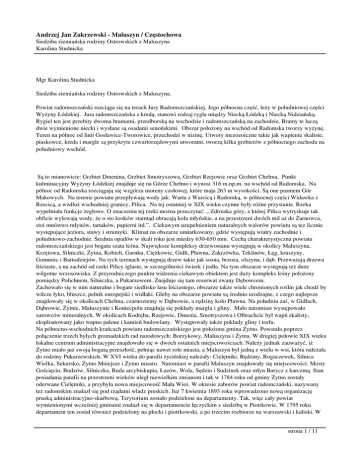 Andrzej Jan Zakrzewski - Maluszyn / Częstochowa Siedziba ziemiańska rodziny Ostrowskich z Maluszyna Karolina Studnicka Mgr Karolina Studnicka Siedziba ziemiańska rodziny Ostrowskich z Maluszyna. Powiat radomszczański rozciąga się na terach Jury Radomszczańskiej. Jego północna część, leży w południowej części Wyżyny Łódzkiej. Jura radomszczańska z kredą, stanowi rodzaj rygla między Niecką Łódzką i Niecką Nidziańską. Rygiel ten jest przebity dwoma bramami, przedborską na wschodzie i radomszczańską na zachodzie. Bramy te łaczą dwie wymienione niecki i wysłane są osadami senońskimi. Obszar położony na wschód od Radomska tworzy wyżynę. Teren na północ od linii Gosławice-Tworowice, przechodzi w nizinę. Utwory mezozoiczne takie jak wapienie skaliste, piaskowce, kreda i margle są przykryte czwartorzędowymi utworami, tworzą kilka grzbietów z północnego zachodu na południowy wschód. Są to mianowicie: Grzbiet Dmenina, Grzbiet Smotryszowa, Grzbiet Rzejowic oraz Grzbiet Chełma. Punkt kulminacyjny Wyżyny Łódzkiej znajduje się na Górze Chełmo i wynosi 316 m.np.m. na wschód od Radomska. Na północ od Radomska rozciągają się wzgórza moreny czołowej, które maja 263 m wysokości. Są one pasmem Gór Makowych. Na terenie powiatu przepływają wody jak: Warta z Warcicą i Radomką, w północnej części Widawka z Rzecicą, a wzdłuż wschodniej granicy, Pilica. Na tej ostatniej w XIX wieku czynne były różne przystanie. Rzeka wypełniała funkcje żeglowe. O znaczeniu tej rzeki można przeczytać: „ Zdroiska góry, z której Pilica wytryskuje tak obficie wylewają wody, że o sto kroków stamtąd obracają koła młyńskie, a na przestrzeni dwóch mil aż do Żarnowca, stoi mnóstwo młynów, tartaków, papierni itd.”. Ciekawym uzupełnieniem naturalnych walorów powiatu są tez licznie występujące jeziora, stawy i strumyki. Klimat na obszarze umiarkowany, gdzie występują wiatry zachodnie i południowo-zachodnie. Średnia opadów w skali roku jest miedzy 630-650 mm. Cechą charakterystyczna powiatu radomszczańskiego jest bogata szata leśna. Największe kompleksy drzewostanu występują w okolicy Maluszyna, Krzętowa, Silniczki, Żytna, Kobieli, Garnku, Ciężkowic, Gidli, Pławna, Zakrzówka, Teklinów, Łęg, kruszyny, Gomunic i Bartodziejów. Na tych terenach występują drzew takie jak sosna, brzoza, olszyna, i dąb. Przeważają drzewa liściaste, a na zachód od rzeki Pilicy iglaste, w szczególności świerk i jodła. Na tym obszarze występują też duże wilgotne wrzosowiska. Z przyrodniczego punktu widzenia ciekawym obiektem jest duży kompleks leśny położony pomiędzy Polichnem, Silniczka, a Pukarzowem. Znajduje się tam rezerwat zwany Dębowcem. Zachowało się w nim naturalne i bogate siedlisko lasu liściastego, obszarze także wiele chronionych roślin jak chodź by wilcze łyko, bluszcz, pełnik europejski i widłaki. Gleby na obszarze powiatu są średnio urodzajne, z czego najlepsze znajdowały się w okolicach Chełma, czarnoziemy w Dąbrowie, a rędziny koło Pławna. Na południu zaś, w Gidlach, Dąbrowie, Żytnie, Maluszynie i Koniecpolu znajdują się pokłady marglu i gliny. Mało natomiast występowało surowców mineralnych. W okolicach Kodręba, Rzejowic, Dmenia, Smotryszowa i Olbrachcic był wapń skalisty, eksploatowany jako wapno palone i kamień budowlany. Występowały także pokłady gliny i torfu. Na północno-wschodnich krańcach powiatu radomszczańskiego jest położona gmina Żytno. Powstała poprzez połączenie trzech byłych gromadzkich rad narodowych: Borzykowy, Maluszyna i Żytna. W drugiej połowie XIX wieku lokalne centrum administracyjne znajdowało się w dwóch ostatnich miejscowościach. Należy jednak zauważyć, iż Żytno miało już swoją bogatą przeszłość, pełniąc nawet role miasta, a Maluszyn był jedną z wielu w wsi, która należała do rodziny Pukarzewskich. W XVI wieku do parafii życińskiej należały: Cielętniki, Rędziny, Rogaczewek, Silnica Wielka, Sekursko, Żytno Mniejsze i Żytno miasto. Natomiast w parafii Maluszyn znajdowały się miejscowości: Mosty Gościęcin, Budzów, Silniczka, Ruda arcybiskupia, Łazów, Wola, Sędzin i Sudzinek oraz młyn Barycz z karczmą. Stan posiadania parafii na przestrzeni wieków uległ niewielkim zmianom i tak w 1784 roku od gminy Żytno zostały oderwane Cielętniki, a przybyła nowa miejscowość Mała Wieś. W okresie zaborów powiat radomczański, nazywany też radomskim znalazł się pod rządami władz pruskich. Już 7 kwietnia 1893 roku wprowadzono nową organizację pruską administracyjno-skarbową. Terytorium zostało podzielone na departamenty. Tak, więc cały powiat wymienionymi wcześniej gminami znalazł się w departamencie łęczyckim z siedzibą w Piotrkowie. W 1795 roku departament ten został również podzielony na płocki i piotrkowski, a po trzecim rozbiorze na warszawski i kaliski. W strona 1 / 11 Andrzej Jan Zakrzewski - Maluszyn / Częstochowa Siedziba ziemiańska rodziny Ostrowskich z Maluszyna Karolina Studnicka okresie powstania Księstwa Warszawskiego został 7 lutego 1807 roku wydany przez Fryderyka Augusta dekret o organach administracyjnych i ich powinnościach. Gmina uzyskała najniższy stopień administracji państwa i od tego momentu władze (świeckie) przestały się posługiwać podziałem na parafie. Na terenie gminy pozostały wszystkie wcześniej wymienione miejscowości, a jedynie przybyła wieś Ewina. W 1815 roku widać jednak szczególne powiększenie się dawnej parafii maluszyńskiej, która to składała się z następujących wsi: Maluszyn, Mosty, Kąty, Sudzinek, Ciężkowiczki, Pierzarki, Pukarzów, Silniczka, Polichno, Pągów, Sady, Wola Życieńska, Krzetów, Rogi, Łazów, Barycz, Budzów, Sędzin Duży, Rudka, Kruszyna, Trzebce, Pratkowice, Borowa, Radoszewnica, Łysiny, Borowce, Stanisławie, Łabądź i Wielgomłyny. Dotychczas obowiązujący porządek ad