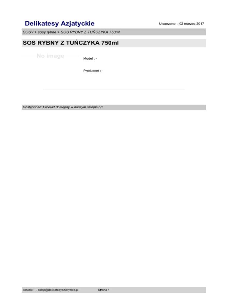 Delikatesy Azjatyckie Utworzono : 02 marzec 2017 SOSY > sosy rybne > SOS RYBNY Z TUŃCZYKA 750ml SOS RYBNY Z TUŃCZYKA 750ml No image Model : - Producent : - Dostępność: Produkt dostępny w naszym sklepie od kontakt : - [email protected] Strona 1