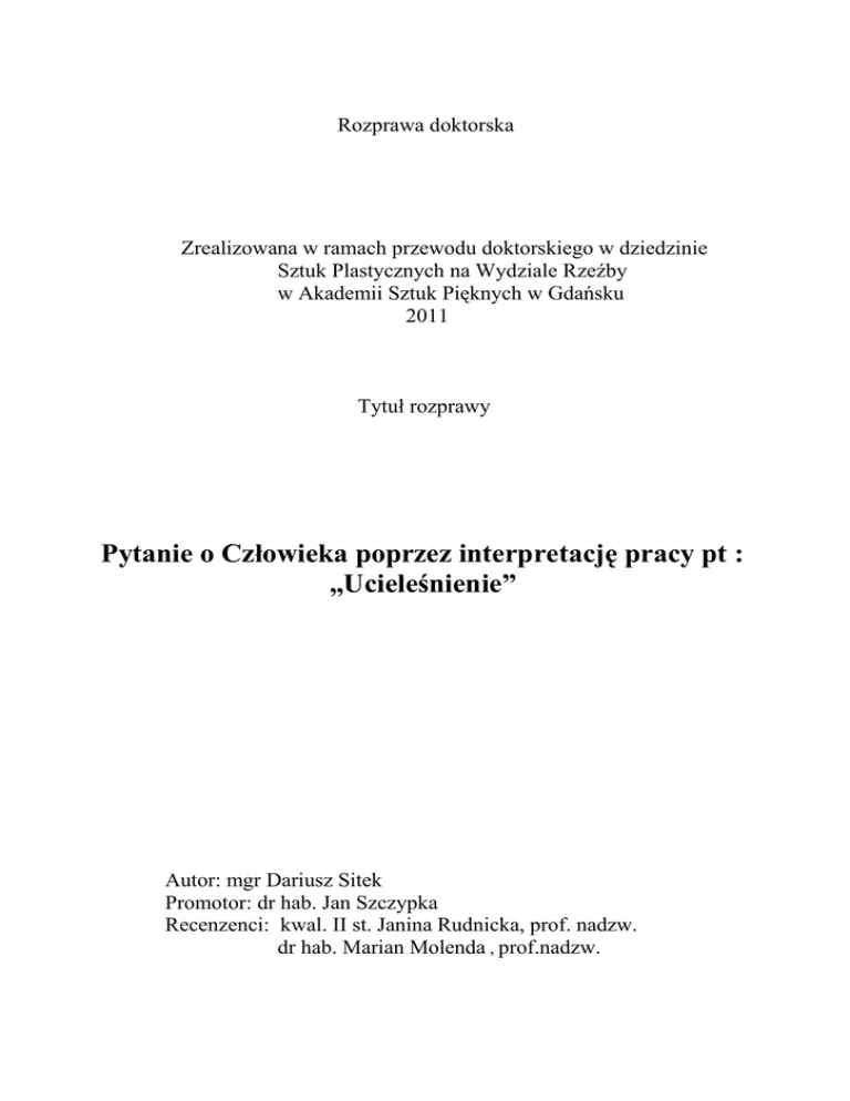 Rozprawa doktorska Zrealizowana w ramach przewodu doktorskiego w dziedzinie Sztuk Plastycznych na Wydziale Rzeźby w Akademii Sztuk Pięknych w Gdańsku 2011 Tytuł rozprawy Pytanie o Człowieka poprzez interpretację pracy pt : „Ucieleśnienie” Autor: mgr Dariusz Sitek Promotor: dr hab. Jan Szczypka Recenzenci: kwal. II st. Janina Rudnicka, prof. nadzw. dr hab. Marian Molenda , prof.nadzw. Pytanie o Człowieka poprzez interpretację pracy pt : „Ucieleśnienie” Realizacja pracy, pt : „Ucieleśnienie”, która powstawała w kontrolowanym przeze mnie procesie twórczym i która nawarstwiała się, multiplikowała, ewoluowała, zmusiła do refleksji, zadania sobie podstawowego pytania: Kim jest, kim może być człowiek wobec drugiego człowieka? Jest to zdecydowanie fundamentalne pytanie zarówno z dziedziny psychologii, socjologii jak i antropologii dotyczące kondycji ludzkiej, zadawane właściwie w każdym momencie naszej egzystencji - przełomu, historii, rewolucji, wojny, czy relacji ludzkich tych świadomych jak również nieuświadamianych, oficjalnych i tych najbardziej prywatnych, międzyosobowych. Poprzez swoją pracę chciałbym szczególnie przyjrzeć się charakterowi ludzkiego sposobu istnienia pod kątem psychologicznym dotyczącym relacji międzyludzkich, różnego rodzaju emocji, również tych skrajnych, czy nieuświadomionych, generowanych podczas konfrontacji z drugim człowiekiem, jak również spróbuję przyjrzeć się mechanizmowi naturalnych ludzkich odruchów. Ponieważ jako jednostka - ciało, człowiek istnieje, trwa w centrum świata tu i teraz, jako ciało materialne jest w określonym miejscu w przestrzeni. Z jednej strony przeżywa siebie od wewnątrz, z drugiej potrafi siebie zobiektywizować, spojrzeć na siebie z zewnątrz, jako inny pośród innych ciał. Te podstawowe zasady antropologiczne opisał m.in. Helmuth Plessner1niemiecki filozof i socjolog jako: [„ prawo ‘naturalnej sztuczności’- konieczności ‘uzupełnienia’ tej formy ‘kulturą’, prawo ‘zapośredniczonej bezpośredniości”- wyrażające pośredniość kontaktu człowieka ze światem, obiektywizowanie się jego wytworów i ekspresji, wreszcie prawo „utopijności usytuowania”- wyrażające poczucie nicości i przypadkowości, w którym zakorzeniona jest pierwotna religijność człowieka. Prawa te pokazują człowieka jako istotę „otwartą”, „utopijną”, która „jest”, ale się „nie posiada”]. Doświadczenie samego siebie - samointerpretacja dokonuje się zawsze za pośrednictwem innych. Droga wewnętrzna znajduje punkt oparcia na zewnątrz, w relacjach społecznych, praktykach, kontemplacjach duchowych czy najzwyklejszym odbiciu, które widzimy na co dzień w lustrze (odbijamy się w innym jak w lustrze). Dla całkowitego spełnienia się i ugruntowania ludzkiej osobowości taką drogę trzeba przebyć. 1. Helmuth Plessner, Pytanie o conditio humana, (wybór pism),Warszawa 1988, Państwowy Instytut Wydawniczy, str. 22 W sensie przenośnym i dosłownym osobowość realizuje się jako tytułowe Ucieleśnienie, egzystencja jednostki w sensie materialnym urzeczywistnia się jako wciąż ponawiany akt inkorporacji. Akt ten jest stworzeniem podstawy a zarazem miary do struktury społecznej, która nadaje status jednostce (lub odrzuca ją). Dzięki środowisku społecznemu następuje proces personifikacji osoby - wraz z narodzinami, a następnie, poprzez nadanie imienia danej osobie, proces integracji i podporządkowania społecznego. Jednostka zyskuje status i próbuje odnaleźć swoje miejsce w społeczeństwie, w pewnym ustalonym porządku społecznym, który wyznaczają : pochodzenie, religia, wyznania, przesądy narzucane przez rodzinę, szkołę, polityczne uwarunkowania sterujące całością życia - tworzące sieć, która więzi jednostkę i określa, wyznacza jej możliwości, i określa nowe role – zadania społeczne. Otóż w tym przyjęciu narzuceniu społecznych ról, kryje się niebezpieczeństwo, pewna dwuznaczność czytania roli jako maski, a sposobu działania, jako gry wynikającej z pewnych społecznych oczekiwań czy stosunku do grupy, której jednostka jest członkiem. Warto tu zaznaczyć pewną podstawową cechę ludzką, jaką jest zdolność przedstawiania, naśladowania ( np. aktorstwo, performance itp. ), lub wyrażania swych emocji za pomocą takich środków, jak : rzeźba, malarstwo, czy inne dziedziny sztuk, które ujawniają szerokie spektrum ludzkich możliwości! W innym znaczeniu pojęcie roli można odczytać w kontekście teatru, odgrywania pewnej roli, sztucznej kreacji. Pojęcie roli, zakłada, że ktoś gra, wcielił się w rolę - rola pozwala być osobie kimś innym niż jest, a kim ewentualnie chciała by być. Taką strategię zamiany roli, grania swojej roli, przyjmowania maski można obserwować bezpośrednio w życiu codziennym, czy polityce, gdzie reprezentowanie stanowi istotny składnik życia społecznego. Współczesne życie, które dzieje się tu i teraz, można określić jako rodzaj sceny, która nie jest wydzielona, jak to bywa w teatrze, raczej rozproszona, upowszechniona, dziejąca się wszędzie, jako życie publiczne ( na ulicy, w szkole, urzędzie, w domu, czy sztucznym telewizyjnym, wirtualnym życiu, którym żyje wielu ludzi). W tej sytuacji, każdy z nas odgrywa pewne role społeczne, będąc: artystą, poetą, urzędnikiem, lekarzem, politykiem, bezrobotnym, czy wchodząc w rolę matki lub ojca. Człowiek, utożsamiając się ze swoją życiową czy społeczną rolą, stwarza ją, kreuje mniej lub więcej świadomie, to zależy od wielu czynników. W tym miejscu chciałbym skupić się na pojęciu odgrywania roli, przybrania maski w negatywnym czy wręcz destrukcyjnym dla ludzkiej psychiki aspekcie. Interesuje mnie rodzaj zależności, która rozgrywa się na płaszczyźnie relacji osoby dominującej, podporządkowującej sobie otoczenie- a tak zwanej masy, jak również kwestia,