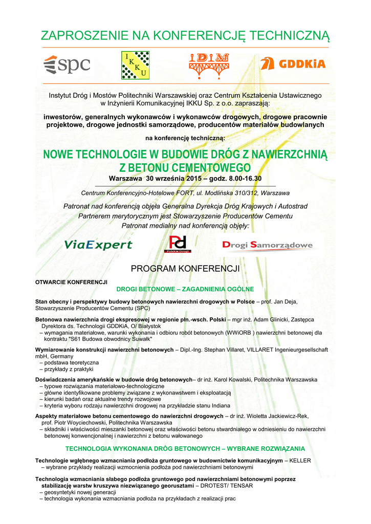 ZAPROSZENIE NA KONFERENCJĘ TECHNICZNĄ Instytut Dróg i Mostów Politechniki Warszawskiej oraz Centrum Kształcenia Ustawicznego w Inżynierii Komunikacyjnej IKKU Sp. z o.o. zapraszają: inwestorów, generalnych wykonawców i wykonawców drogowych, drogowe pracownie projektowe, drogowe jednostki samorządowe, producentów materiałów budowlanych na konferencję techniczną: NOWE TECHNOLOGIE W BUDOWIE DRÓG Z NAWIERZCHNIĄ Z BETONU CEMENTOWEGO Warszawa 30 września 2015 – godz. 8.00-16.30 Centrum Konferencyjno-Hotelowe FORT, ul. Modlińska 310/312, Warszawa Patronat nad konferencją objęła Generalna Dyrekcja Dróg Krajowych i Autostrad Partnerem merytorycznym jest Stowarzyszenie Producentów Cementu Patronat medialny nad konferencją objęły: PROGRAM KONFERENCJI OTWARCIE KONFERENCJI DROGI BETONOWE – ZAGADNIENIA OGÓLNE Stan obecny i perspektywy budowy betonowych nawierzchni drogowych w Polsce – prof. Jan Deja, Stowarzyszenie Producentów Cementu (SPC) Betonowa nawierzchnia drogi ekspresowej w regionie płn.-wsch. Polski – mgr inż. Adam Glinicki, Zastępca Dyrektora ds. Technologii GDDKiA, O/ Białystok – wymagania materiałowe, warunki wykonania i odbioru robót betonowych (WWiORB ) nawierzchni betonowej dla kontraktu "S61 Budowa obwodnicy Suwałk" Wymiarowanie konstrukcji nawierzchni betonowych – Dipl.-Ing. Stephan Villaret, VILLARET Ingenieurgesellschaft mbH, Germany – podstawa teoretyczna – przykłady z praktyki Doświadczenia amerykańskie w budowie dróg betonowych– dr inż. Karol Kowalski, Politechnika Warszawska – typowe rozwiązania materiałowo-technologiczne – główne identyfikowane problemy związane z wykonawstwem i eksploatacją – kierunki badań oraz aktualne trendy rozwojowe – kryteria wyboru rodzaju nawierzchni drogowej na przykładzie stanu Indiana Aspekty materiałowe betonu cementowego do nawierzchni drogowych – dr inż. Wioletta Jackiewicz-Rek, prof. Piotr Woyciechowski, Politechnika Warszawska – składniki i właściwości mieszanki betonowej oraz właściwości betonu stwardniałego w odniesieniu do nawierzchni betonowej konwencjonalnej i nawierzchni z betonu wałowanego TECHNOLOGIA WYKONANIA DRÓG BETONOWYCH – WYBRANE ROZWIĄZANIA Technologie wgłębnego wzmacniania podłoża gruntowego w budownictwie komunikacyjnym – KELLER – wybrane przykłady realizacji wzmocnienia podłoża pod nawierzchniami betonowymi Technologia wzmacniania słabego podłoża gruntowego pod nawierzchniami betonowymi poprzez stabilizację warstw kruszywa niezwiązanego georusztami – DROTEST/ TENSAR – geosyntetyki nowej generacji – technologia wykonania wzmacniania podłoża na przykładach z realizacji prac Technologia układania betonów nawierzchniowych – GOMACO Int. LTD. (UK) – postęp technologiczny, maszyny i urządzenia – technologia wykonania betonowań – praca układarek betonu – wykonanie krawężników i barier betonowych metodą betonowania ślizgowego Wykonanie nawierzchni dróg w technologii betonu wałowanego – LAFARGE – zastosowania technologii betonu wałowanego (drogi lokalne, dojazdowe, techniczne) – projektowanie i wykonanie mieszanki – przykład realizacji na podstawie placu manewrowego pod ruch ciężki o powierzchni 11000 m2 Ochrona antykorozyjna prętów stalowych w nawierzchniach dróg betonowych oraz obiektach infrastruktury drogowej – TOP BUILDING Odwodnienia liniowe nawierzchni dróg betonowych – nowe rozwiązanie – HAURATON Szczeliny dylatacyjne – najsłabsze ogniwo systemu realizacji nawierzchni betonowych – dr inż. Wiesław Dąbrowski, OAT – wymiarowanie, wykonanie i uszczelnianie szczelin dylatacyjnych Zimno-nakładane zalewy drogowe nowej generacji do szczelin dylatacyjnych – SABA OPIS KONFERENCJI ORGANIZATORZY KONFERENCJI: Instytut Dróg i Mostów Politechniki Warszawskiej oraz Centrum Kształcenia Ustawicznego w Inżynierii Komunikacyjnej IKKU Sp. z o.o. ADRESACI (SŁUCHACZE) KONFERENCJI: Jednostki GDDKiA, samorządowe jednostki administracji drogowej, pracownie projektowe dróg, generalni wykonawcy i wykonawcy dróg, producenci materiałów budowlanych oraz maszyn i urządzeń do budowy dróg. W szczególności zapraszamy dyrekcje ds. technicznych, projektantów, specjalistów planowania i przygotowania inwestycji, kierowników kontraktów, projektów i budów, inspektorów nadzoru budowlanego, a także inne osoby, które chcą pogłębić swoją wiedzę z zakresu konstrukcji i budowy dróg z nawierzchnią z betonu cementowego. CEL KONFERENCJI: Przedstawienie zasad projektowych oraz nowoczesnych rozwiązań technologicznych i materiałowo-technicznych budowy dróg z nawierzchnią z betonu cementowego. Wsparcie administracji drogowej i kadry technicznej, kadry projektowej i inżynierskiej w przygotowaniu i prowadzeniu inwestycji z zakresu budowy dróg betonowych. ZAKRES KONFERENCJI: Zakres konferencji obejmuje zagadnienia: ●warunków wykonania i odbioru robót dla dróg z nawierzchnią z betonu cementowego ●zasad projektowania i wykonania nawierzchni betonowych ●technologii betonu wałowanego ●technologii betonowania ślizgowego ●postępu w dziedzinie materiałowo-technicznej i technologii produkcji betonu cementowego ●technologii przygotowania podłoża ●technologii wykonania warstw betonowych ●maszyn i urządzeń stosowanych w wykonawstwie nawierzchni betonowych. Prezentowane będą nowoczesne rozwiązania i technologie stosowane w budownictwie drogowym. WARUNKI UCZESTNICTWA TERMIN I MIEJSCE KONFERENCJI: Konferencja odbędzie się w dniu 30.09.2015 w godzinach 8:00-16:30 w Centrum Konferencyjno-Hotelowym FORT w Warszawie, ul. Modlińska 310/312; Sala Szlachecka na II p. UCZESTNICTWO: Uczestnictwo w konferencji przedstawicieli jednostek samorządowych oraz uczelni, w limitowanej liczbie, jest bezpłatne, natomiast dla pozostałych podmiotów jest częściowo odpłatne w wysokości 350 zł + 23% VAT. Uczestnicy konferencji mają zapewnione przerwy kawowe, lunch i 