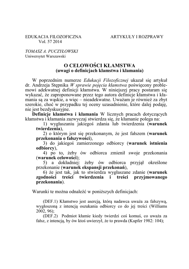 EDUKACJA FILOZOFICZNA Vol. 57 2014 ARTYKUŁY I ROZPRAWY TOMASZ A. PUCZYŁOWSKI Uniwersytet Warszawski O CELOWOŚCI KŁAMSTWA (uwagi o definicjach kłamstwa i kłamania) W poprzednim numerze Edukacji Filozoficznej ukazał się artykuł dr. Andrzeja Stępnika W sprawie pojęcia kłamstwa poświęcony problemowi adekwatnej definicji kłamstwa. W niniejszej pracy postaram się wykazać, że zaproponowane przez tego autora definicje kłamstwa i kłamania są za wąskie, a więc – nieadekwatne. Uważam je również za zbyt szerokie, choć w przypadku tej oceny uzasadnienie, które dalej podaję, nie jest bezdyskusyjne. Definicje kłamstwa i kłamania W licznych pracach dotyczących kłamstwa i kłamania zazwyczaj stwierdza się, że kłamanie polega na: 1) wygłaszaniu jakiegoś zdania lub twierdzenia (warunek twierdzenia), 2) o którym jest się przekonanym, że jest fałszem (warunek przekonania o fałszywości), 3) do jakiegoś zamierzonego odbiorcy (warunek istnienia odbiorcy), 4) po to, żeby ów odbiorca zmienił swoje przekonania (warunek celowości); 5) a dokładniej: żeby ów odbiorca przyjął określone przekonanie (warunek ekspansji przekonań), 6) że jest tak, jak to stwierdza wygłaszane zdanie (warunek zgodności treści twierdzenia i treści przyjmowanego przekonania). Warunki te można odnaleźć w poniższych definicjach: (DEF.1) Kłamstwo jest asercją, którą nadawca uważa za fałszywą, wygłoszoną z intencją oszukania odbiorcy co do jej treści (Williams 2002, 96); (DEF.2) Podmiot kłamie kiedy twierdzi coś komuś, co uważa za fałsz, z intencją, by ów ktoś uwierzył, że to prawda (Kupfer 1982: 104); Tomasz A. Puczyłowski 6 (DEF.3) Kłamanie jest to wygłaszanie twierdzenia uważanego za fałsz z intencją sprawienia, by inny przyjął je za prawdę (Primoratz 1984: 54); (DEF.4) Asercja nadawcy S do odbiorcy A, że p jest kłamstwem zawsze i tylko wtedy, gdy jednocześnie: (1) S jest przekonany, że p jest fałszem; (2) S chce (zamierza), żeby (i) A przyjął przekonanie, że p, (ii) A rozpoznał jego intencję (i), (iii) przekonanie A, że S jest przekonany, że p, było dla A powodem do tego, by (ii) stało się racją dla (i) (Faulkner 2007: 527-8) (DEF.5) Osoba X kłamie, ilekroć wygłasza zdanie Z, któremu przypisuje wartość logiczną W1, i czyni to w tym celu, aby odbiorcę owej wypowiedzi wprowadzić w błąd, mianowicie aby przypisał on tej wypowiedzi wartość logiczną W2, różną od W1 (Pelc 1990) (DEF.6) (osoba) L okłamuje (osobę) D = df Istnieje taki sąd p, że zarazem: (i) Albo L jest przekonany, że p nie jest prawdziwy, albo L jest przekonany, że p jest fałszywy, oraz (ii) L twierdzi p do D (Chisholm, Feehan 19771) Kłamstwo według Stępnika. Zaproponowane przez Andrzeja Stępnika (Stępnik 2013) definicyjne ujęcie czynności kłamania i jego wytworu – kłamstwa, odbiega od przytoczonych wyżej. Proponuje on następującą definicję sprawozdawczą kłamstwa i okłamywania: (DO) x okłamuje y-ka = x świadomie i rozmyślnie nadaje pewien komunikat k, którego odbiorcą jest y, który ma na celu wprowadzenie yka w błąd, bez uprzedniego uprzedzenia y-ka o zamiarze wprowadzenia w błąd; (DK) k jest kłamstwem = k jest komunikatem (aktem komunikacyjnym) nadanym przez pewnego x-a i odebranym przez pewnego y-ka, dzięki któremu x świadomie i rozmyślnie chce wprowadzić y-ka w błąd, bez uprzedniego uprzedzenia y-ka o zamiarze wprowadzenia w błąd. Zasadnicza różnica między przytoczonymi definicjami i (DO) polega na określeniu w tej ostatniej czynności kłamania nie jako czynności Przy czym: L twierdzi p do D =df L wypowiada p do D i czyni tak w sposób, który – jak L sądzi – usprawiedliwia D w przekonaniu (uzasadnia przekonanie D), że on, L, nie tylko akceptuje p, ale że również ma intencję spowodowania w D przekonania, że on, L, akceptuje p. 1 O celowości kłamstwa 7 związanej jedynie z twierdzeniem, dokonywaniem asercji, lub wypowiadaniem zdań podlegających wartościowaniu w kategoriach prawy i fałszu, ale – szerzej – jako czynności związanej z komunikowaniem, również niewerbalnym. W literaturze poświęconej kłamstwu i kłamaniu niekiedy w taki szerszy w stosunku do (DEF.1)-(DEF.6) sposób ujmuje się czynność kłamania lub jego wytwór – kłamstwo: (DEF.7) Osoba a kłamie osobie b, że p wtw a komunikuje osobie b, że p i jednocześnie a uważa, że nie-p. […] Lieabp = B*Ia(Cabp & BbBap) & Ba~p” (O’Neill) [Podaną formułę O’Neill proponuje odczytać: osoba a kłamie osobie b, że p zawsze i tylko wtedy, gdy a uważa, że nie-p, oraz wspólnym przekonaniem a i b jest to, że a ma intencję, by jednocześnie zakomunikować b, że p, jak i by b uważał, że a sądzi, iż p – przyp. T. P.]. (DEF.8) X kłamie 1 – ‘X świadomie informuje jakiegoś Y, że z, choć sądzi, że nie z, ponieważ chce żeby Y sądził, że z – Mówiący (N) traktuje z jako sąd poddający się wersyfikacji’ (Puzynina 1981: 108)2 (DEF.9) Kłamstwo jest to akt, którego intencją jest spowodowanie, aby jakaś inna osoba uwierzyła w coś, co kłamiący uważa za fałszywe. Wynika stąd, że kłamstwo musi być celowe, świadome i skierowane do innej osoby” (Zuckerman i Driver 1985: 130-131, za Tokarz M : 275)3. Pomimo wskazanej różnicy, jeden jest punkt wspólny wszystkim definicjom. We wszystkich przytoczonych definicjach ujawnia się wspólne przekonanie badaczy, że kłamanie jest w sposób konieczny związane z chęcią oszukania określonego odbiorcy, że celem kłamcy jest oszukanie odbiorcy. Stępnik np. stwierdza (Stępnik 2013: 115): Kłamca musi mieć świadomość wprowadzania w błąd i taki zamiar (czyli działać rozmyślnie, ze względu na taki cel) Warunek ten nie jest jednak konieczny – można, co wykażemy w dalszej części pracy, kłamać a zarazem nie zamierzać, żeby intencjonalny odbiorca komunikatu, wypowiedzi, czy asercji uznał, że jest tak, jak komunikat, wyp