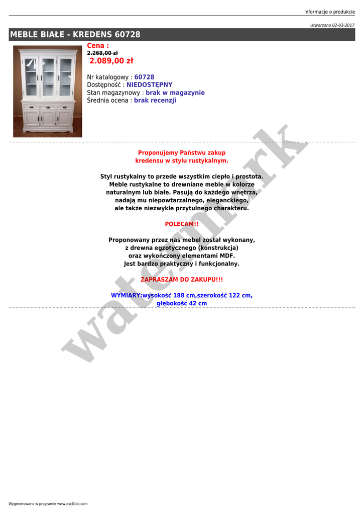 Informacje o produkcie Utworzono 02-03-2017 MEBLE BIAŁE - KREDENS 60728 Cena : 2.268,00 zł 2.089,00 zł er m ar k Nr katalogowy : 60728 Dostępność : NIEDOSTĘPNY Stan magazynowy : brak w magazynie Średnia ocena : brak recenzji Proponujemy Państwu zakup kredensu w stylu rustykalnym. Styl rustykalny to przede wszystkim ciepło i prostota. Meble rustykalne to drewniane meble w kolorze naturalnym lub białe. Pasują do każdego wnętrza, nadają mu niepowtarzalnego, eleganckiego, ale także niezwykle przytulnego charakteru. POLECAM!! Proponowany przez nas mebel został wykonany, z drewna egzotycznego (konstrukcja) oraz wykończony elementami MDF. Jest bardzo praktyczny i funkcjonalny. ZAPRASZAM DO ZAKUPU!!! w at WYMIARY:wysokość 188 cm,szerokość 122 cm, głębokość 42 cm Wygenerowano w programie www.oscGold.com