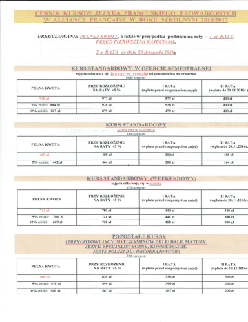 CENNIK KURSÓW J Ę ZYKA FRANCUSKIEGO PROWADZONYCH W ALLIANCE FRANCAISE W ROKU SZKOLNYM 2016/2017 UREGULOWANIEPE ŁNEJKWOTY, a takżew przypadku podzialu na raty PRZED PIERWSZYMI ZAJ ĘcIAMi, - 1-ej RATY, 2-a RATA do dnia 20 listopada 2016; KURS STANDARDOWY W OFERCIE SEMESTRALNEJ zaj ęcia odbywaj ą się dwa razy w tygodniu: od poniedzia ł ku do czwartku 60h1 semestr PRZY ROZŁOŻENIU NA RATY +5 % I RATA (wpłata przed rozpocz ęciem zaj ęć) II RATA (wpłata do 20.11.2016r.) 977 zł 577 zł 400 zł 5% zni żki: 884 zł 928 zł 528 zł 400 zł 10% zni żki: 837 zł 879 zł 479 zł 400 zł PEŁNA KWOTA 930 z ł KURS STANDARDOWY jeden raz W ty2odniu 30/i/semestr PEŁNA KWOTA 46` zl 5% zni żki: 442 zł PRZY ROZŁOŻENIU NA RATY +5 % I RATA (wpłata przed rozpocz ęciem zaj ęć) II RATA (wpłata do 20.11.2016r. 488 zł 300zł 188 zł 464 zł 300 zł 164 zł KURS STANDARDOWY (WEEKENDOWY) zaj ęcia odbywaj ą się w sobotę 45/i/semestr PEŁNA KWOTA 743 zł PRZY ROZ ŁOŻENIU NA RATY +5 % I RATA (wpłata przed rozpocz ęciem zaj ęć) II RATA (wpłata do 20.11.2016r. 780 zł 440 zł 340 zł 5% zniżki: 706 zł 741 zł 441 zł 300 zł 10% zniżki: 669 zł 702 zł 402 zł 300 zł POZOSTAŁE CY DO EGZAMINÓW D JĘ ZYK SPECJALISTYCZNY, KONWERSACJE, JĘZYK POLSKI DLA OBCOKRAJOWCÓJfl 30/ił semestr PEŁNA KWOTA PRZY ROZŁOŻENIU NA RATY +5 % I RATA (wpłata przed rozpoczęciem zaj ęć) II RATA (wpłata do 20.11.2016r. 600 zł 630 zł 330 zł 300 zł 5% zni żki: 570 z ł 599 zł 399 zł 200 zł 10% zniżki: 540 zł 567 zł 367 zł 200 zł