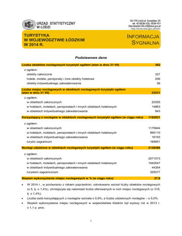 Podstawowe dane Liczba obiektów noclegowych turystyki ogółem (stan w dniu 31 VII) 362 z ogółem: obiekty całoroczne 327 hotele, motele, pensjonaty i inne obiekty hotelowe 206 obiekty indywidualnego zakwaterowania 56 Liczba miejsc noclegowych w obiektach noclegowych turystyki ogółem (stan w dniu 31 VII) 23231 z ogółem: w obiektach całorocznych 20355 w hotelach, motelach, pensjonatach i innych obiektach hotelowych 14863 w obiektach indywidualnego zakwaterowania 943 Korzystający z noclegów w obiektach noclegowych turystyki ogółem (w ciągu roku) 1192931 z ogółem: w obiektach całorocznych 1175844 w hotelach, motelach, pensjonatach i innych obiektach hotelowych w obiektach indywidualnego zakwaterowania 990110 16193 turyści zagraniczni 169951 Noclegi udzielone w obiektach noclegowych turystyki ogółem (w ciągu roku) 2138266 z ogółem: w obiektach całorocznych 2071073 w hotelach, motelach, pensjonatach i innych obiektach hotelowych 1542047 w obiektach indywidualnego zakwaterowania 44354 turystom zagranicznym 329377 Stopień wykorzystania miejsc noclegowych w % (w ciągu roku) 27,9 W 2014 r., w porównaniu z rokiem poprzednim, odnotowano wzrost liczby obiektów noclegowych (o 5, tj. o 1,4%), zmniejszyła się natomiast liczba oferowanych w nich miejsc noclegowych (o 318, tj. o 1,4%). Liczba osób korzystających z noclegów wzrosła o 5,9%, a liczba udzielonych noclegów – o 5,0%. Stopień wykorzystania miejsc noclegowych w województwie łódzkim był wyższy niż w 2013 r. o 1,1 p. proc. 1 Informacje metodologiczne Informacji o stanie oraz wykorzystaniu turystycznych obiektów noclegowych dostarcza badanie prowadzone przez Statystykę Publiczną w oparciu o sprawozdania KT-1 (sporządzane co miesiąc) i KT-1a (sporządzane w lipcu). Obserwacją statystyczną objęte są obiekty zbiorowego i indywidualnego zakwaterowania: obiekty hotelowe (hotele, motele, pensjonaty i inne obiekty hotelowe), domy wycieczkowe, schroniska, schroniska młodzieżowe, szkolne schroniska młodzieżowe, ośrodki wczasowe, ośrodki kolonijne, ośrodki szkoleniowo-wypoczynkowe, domy pracy twórczej, zespoły domków turystycznych, kempingi, pola biwakowe, hostele (od 2009 r.), zakłady uzdrowiskowe, pozostałe obiekty noclegowe, a także od 2010 r. – pokoje gościnne/kwatery prywatne oraz kwatery agroturystyczne posiadające 10 miejsc noclegowych i więcej. Zebrane tą drogą dane dostarczają informacji dotyczących m.in. liczby miejsc noclegowych w turystycznych obiektach zbiorowego zakwaterowania, liczby turystów korzystających z bazy noclegowej (włączając turystów zagranicznych), natężenia ruchu turystycznego w poszczególnych miesiącach roku, liczby pokoi wynajmowanych w obiektach i stopniu ich wykorzystania, a także zaplecza gastronomicznego, jakim dysponują obiekty turystyczne. Zgodnie z metodologią sprawozdań KT-1 oraz KT-1a, pojęcie „turysta”, o którym mowa w opracowaniu, oznacza osobę podróżującą do miejsca znajdującego się poza jej zwykłym otoczeniem na czas nie dłuższy niż 12 kolejnych miesięcy, jeśli podstawowym celem podróży nie jest podjęcie działalności zarobkowej wynagradzanej ze środków pochodzących z odwiedzanego miejsca oraz korzystającą z miejsc zbiorowego lub indywidualnego zakwaterowania w odwiedzanym miejscu przynajmniej przez jedną noc. Z kolei „korzystający z noclegów” to liczba osób (turystów), które rozpoczęły pobyt, tj. zostały zameldowane w obiekcie w danym miesiącu, przy czym osoby przebywające w obiekcie na przełomie miesięcy są liczone tylko jeden raz. Od 2012 r. zakres prezentowanych danych z badania bazy noclegowej został rozszerzony o pokoje gościnne i kwatery agroturystyczne posiadające 10 i więcej miejsc noclegowych. Według stanu na koniec lipca 2014 r. w województwie łódzkim funkcjonowały 362 obiekty turystyczne. Wśród nich 56 to obiekty indywidualnego zakwaterowania – pokoje gościnne, kwatery prywatne i kwatery agroturystyczne. Liczba obiektów noclegowych wzrosła o 1,4% w stosunku do roku poprzedniego. Wśród turystycznych obiektów noclegowych 206 należało do kategorii obiektów hotelowych. 2 STRUKTURA OBIEKTÓW TURYSTYCZNYCH ORAZ MIEJSC NOCLEGOWYCH WEDŁUG RODZAJÓW OBIEKTÓW W 2014 R. Stan w dniu 31 VII Hotele stanowiły 31,8% ogółu turystycznych obiektów noclegowych (115 obiektów). Kolejne pod względem liczby były inne obiekty hotelowe (78 obiektów, tj. 21,5% ogółu), pokoje gościnne/kwatery prywatne (30 obiektów, tj. 8,3%), kwatery agroturystyczne (26 obiektów, tj. 7,2%) oraz ośrodki szkoleniowo-wypoczynkowe (21 obiektów, tj. 5,8%). Największy wzrost liczby obiektów, w porównaniu z 2013 r., dotyczył pokoi gościnnych/kwater prywatnych (o 30,4%) oraz kwater agroturystycznych (o 23,8%). Największy spadek zanotowano w przypadku zespołu domków turystycznych (o 18,8%). Połowę ogółu hoteli stanowiły obiekty trzygwiazdkowe (57 obiektów, wzrost o 1 w stosunku do 2013 r.), a ponad 1/4 – dwugwiazdkowe (30 obiektów). W roku 2014 w województwie łódzkim funkcjonowało również 11 hoteli kategorii czterogwiazdkowej (wzrost o 2 obiekty w stosunku do 2013 r.), 10 hoteli kategorii jednogwiazdkowej i 7 hoteli znajdujących się w trakcie kategoryzacji. 31 lipca 2014 r. liczba oferowanych miejsc noclegowych wyniosła 23,2 tys. Kwatery prywatne i agroturystyczne oferowały 943 miejsca. Liczba miejsc noclegowych zmalała w porównaniu z rokiem poprzednim o 318, tj. o 1,4%, natomiast stopień ich wykorzystania wzrósł z 26,8% do 27,9%. Niezmiennie największą liczbą miejsc noclegowych dysponowały hotele – 11,5 tys., tj. 49,3% ogółu oferowanych miejsc. Kolejnymi pod względem liczby miejsc noclegowych były: inne obiekty hotelowe (3,0 tys., tj. 13,0% ogółu miejsc noclegowych), ośrodki szkoleniowo-wypoczynkowe (1,5 tys., tj. 6,6%) oraz zespoły domków turystycznych (1,3 tys., tj. 5,6%). 3 TABL. 1. BAZA NOCLEGOWA TURYSTYKI Stan w dniu 31 VII 2013 RODZAJ
