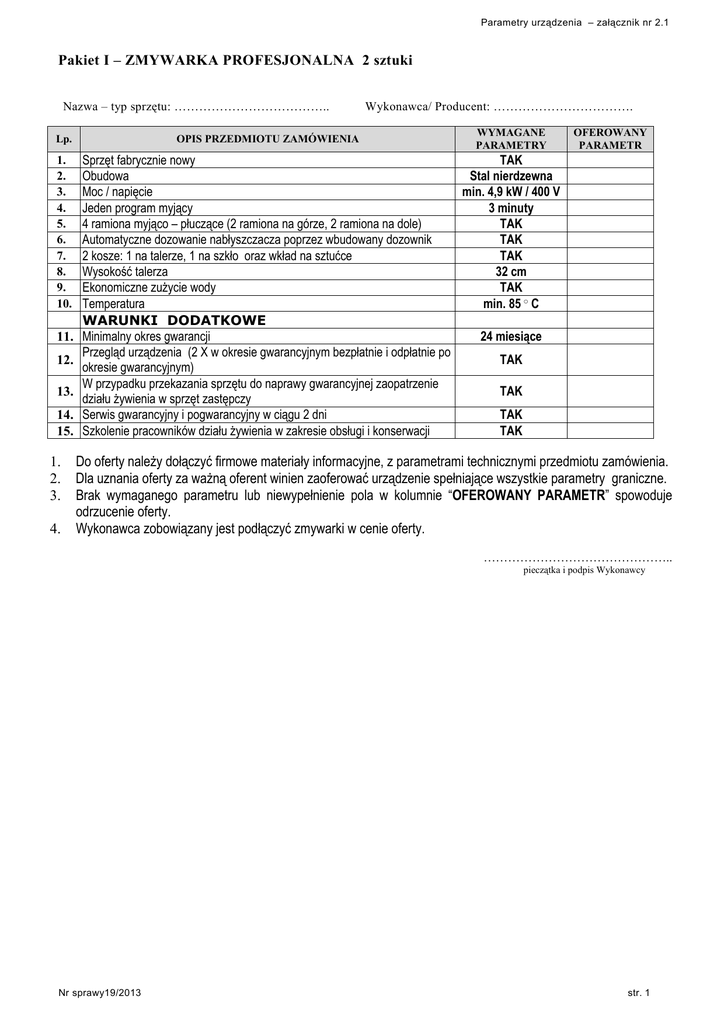 Pakiet I – ZMYWARKA PROFESJONALNA 2 sztuki 1. Do oferty