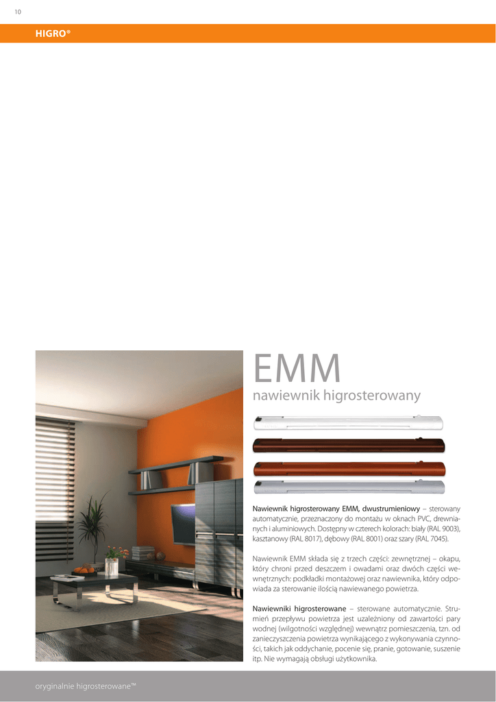 10 HIGRO® EMM nawiewnik higrosterowany Nawiewnik higrosterowany EMM, dwustrumieniowy – sterowany automatycznie, przeznaczony do montażu w oknach PVC, drewnianych i aluminiowych. Dostępny w czterech kolorach: biały (RAL 9003), kasztanowy (RAL 8017), dębowy (RAL 8001) oraz szary (RAL 7045). Nawiewnik EMM składa się z trzech części: zewnętrznej – okapu, który chroni przed deszczem i owadami oraz dwóch części wewnętrznych: podkładki montażowej oraz nawiewnika, który odpowiada za sterowanie ilością nawiewanego powietrza. Nawiewniki higrosterowane – sterowane automatycznie. Strumień przepływu powietrza jest uzależniony od zawartości pary wodnej (wilgotności względnej) wewnątrz pomieszczenia, tzn. od zanieczyszczenia powietrza wynikającego z wykonywania czynności, takich jak oddychanie, pocenie się, pranie, gotowanie, suszenie itp. Nie wymagają obsługi użytkownika. oryginalnie higrosterowane™ 11 HIGROsterowany nawiewnik EMM Nawiewnik EMM z możliwością przymknięcia (N1) Kod EMM707 EMM747 Biały RAL 9003 Kasztanowy RAL 8017 Okap EMM787 EMM737 EMM706 Szary RAL 7045 Biały RAL 9003 standardowy aereco (O1) Kolor Dębowy RAL 8001 EMM746 EMM786 EMM708 akustyczny do EMM (O2) Przepływ Kasztanowy RAL 8017 EMM748 EMM788 standardowy aereco (O1) Dębowy RAL 8001 Biały RAL 9003 Kasztanowy RAL 8017 Dębowy RAL 8001 5-29 m3/h Akustyka Dn,e,w 32 dB(A) 38 dB(A) Montaż nawiewnika w oknie N1 EMM bez możliwości przymknięcia (N1) + L1 + O1 32 dB(A) Otwory montażowe do nawiewnika EMM N1 + L1 + O2 280 mm 8-12 mm* 2 x 140 mm 8-12 mm* EMM707 okno PVC – nawiewnik EMM z okapem standardowym N1 + L1 + EMM706 okno PVC – nawiewnik EMM z okapem akustycznym O1 N1 + L1 + O2 EMM707 okno drewniane – nawiewnik EMM z okapem standardowym * informacje o montażu nawiewników w oknie aluminiowym oraz wpływ wymiaru otworu na przepływ powietrza – strona 35 EMM706 okno drewniane – nawiewnik EMM z okapem akustycznym Przepływ powietrza W zależności od ustawienia podkładki montażowej do której przymocowany jest nawiewnik EMM przepływ powietrza skierowany jest pionowo w górę lub ukośnie. Wybór kierunku przepływu strumienia uzależniony jest od odległości pomiędzy wylotem powietrza, a górną częścią otworu okiennego. Prawidłowa minimalna odległość między nawiewnikiem i ścianą to 3-5 cm. Przepływ w m3/h @ 10 Pa 60 50 40 30 20 10 EMM 5-29 0 10 20 30 40 50 60 70 80 90 100 A B Ustawienie blokady w pozycji otwartej A , przepustnica zmienia swoje położenie w zależności od wilgotności względnej w pomieszczeniu. Przepływ powietrza zawiera się w przedziale od 5 do 30 m³/h. Ustawieniu blokady w pozycji zamkniętej B , przepustnica ustawiona jest w pozycji przepływu minimalnego, nawiewnik dostarcza do 5 m³/h. Z tej opcji zaleca się korzystać wyłącznie przy niesprzyjających warunkach klimatycznych. Wilgotność względna w % Wymiary w mm 402 40 39.5 nawiewnik EMM (widok z góry) nawiewnik EMM – przepływ powietrza skierowany ukośnie 402 46 27 nawiewnik EMM – przepływ powietrza skierowany pionowo w górę podkładka montażowa do EMM www.aereco.com.pl 35 Współczynnik przenikania ciepła, montaż nawiewników okiennych Współczynnik przenikania ciepła dla okna z nawiewnikiem Zgodnie z obowiązującymi w Polsce przepisami (więcej informacji na stronie 22) nawiewniki okienne powinny stale doprowadzać powietrze do pomieszczeń. Nawet w pozycji zamkniętej objętość strumienia powietrza przepływającego przez nawiewnik powinien wynosić od 20 do 30% maksymalnej wydajności tego urządzenia. Współczynnik przenikania ciepła określany jest dla przegrody, która na stałe oddziela środowiska zewnętrzne i wewnętrzne, natomiast nawiewnik zgodnie z przepisami nigdy nie może być w szczelnie zamknięty, więc nie stanowi takiej przegrody. Metodologia badań nawiewników prowadzonych na potrzeby uzyskania Aprobaty Technicznej nie uwzględnia metod badań izolacyjności cieplnej nawiewników powietrza. Izolacyjność cieplna okien powinna być określana bez uwzględnienia wpływu zamontowanych nawiewników. Sposób montażu nawiewników okiennych Polska Norma PN-83/B-03430 Az3 2000 „Wentylacja w budynkach mieszkalnych zamieszkania zbiorowego i użyteczności publicznej. Wymagania” określa sposób montażu nawiewników następująco: „ …nawiewniki powietrza o regulowanym stopniu otwarcia usytuowane: – w górnej części okna (w ościeżnicy, ramie skrzydła, między ramą skrzydła a górną krawędzią szyby zespolonej), lub – w otworze okiennym (między nadprożem a górną krawędzią ościeżnicy, w obudowie rolety zewnętrznej), albo – w przegrodzie zewnętrznej ponad oknem.(…)” B A Zapis ten jednoznacznie wskazuje górną część okien (lub ścian) jako prawidłowe miejsce zamontowania nawiewników. Nawiewnik montowany jest w oknach PVC i drewnianych: w skrzydle i ramie okna. W przypadku okien PVC nawiewniki montuje się na przyldze okiennej bez uszkodzenia wzmocnienia stalowego okna. Nawiewniki montuje się w górnej części okien dzięki czemu powietrze z zewnątrz nie jest kierowane bezpośrednio na użytkownika i tym samym unika się nieprzyjemnego zjawiska przeciągu. Zamontowany nawiewnik nie powinien stanowić przeszkody w zamontowaniu i otwieraniu okna. W celu uniknięcia tego problemu sugerowane miejsce montażu nawiewnika to środek skrzydła B okna lub przesunięcie go w kierunku klamki A . Montaż po stronie zawiasów C sprawia, że przy otwieraniu okna nawiewnik może ulec uszkodzeniu. C Montaż nawiewnika EMM na oknie PVC 1 i drewnianym 2 Do montażu nawiewników w oknach aluminiowych stosuje się specjalną mufę teleskopową: Mufa teleskopowa do profili aluminiowych nawiewnik nawiewnik okap 1 okap podkładka montażowa 2 23,5 podkładka montażowa 12 370 50 - 70 Przykładowe otwory montażowe 280 mm 8-12 mm* 2 x 140 mm 348 38,8 1 8-12 mm* Ø5 390 353 mm 16 mm * Szerokość otworu zależy od rodzaju na