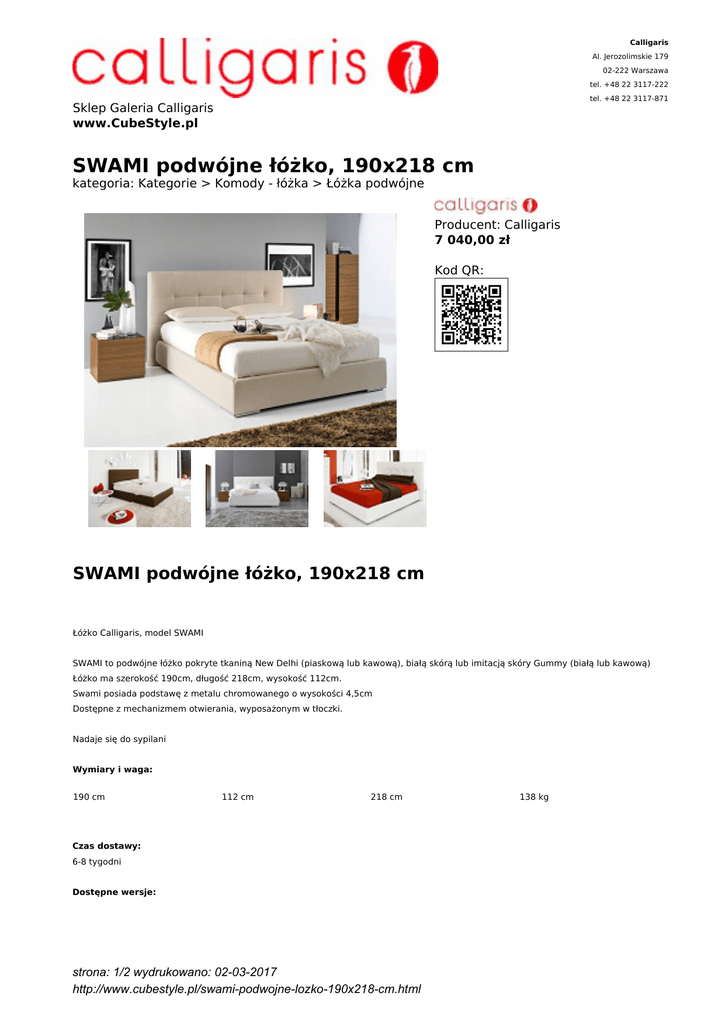 Calligaris Al. Jerozolimskie 179 02-222 Warszawa tel. +48 22 3117-222 tel. +48 22 3117-871 Sklep Galeria Calligaris www.CubeStyle.pl SWAMI podwójne łóżko, 190x218 cm kategoria: Kategorie > Komody - łóżka > Łóżka podwójne Producent: Calligaris 7 040,00 zł Kod QR: SWAMI podwójne łóżko, 190x218 cm Łóżko Calligaris, model SWAMI SWAMI to podwójne łóżko pokryte tkaniną New Delhi (piaskową lub kawową), białą skórą lub imitacją skóry Gummy (białą lub kawową) Łóżko ma szerokość 190cm, długość 218cm, wysokość 112cm. Swami posiada podstawę z metalu chromowanego o wysokości 4,5cm Dostępne z mechanizmem otwierania, wyposażonym w tłoczki. Nadaje się do sypilani Wymiary i waga: 190 cm 112 cm 218 cm Czas dostawy: 6-8 tygodni Dostępne wersje: strona: 1/2 wydrukowano: 02-03-2017 http://www.cubestyle.pl/swami-podwojne-lozko-190x218-cm.html 138 kg New Delhi Fabric True leather Imitation Leather Compartment strona: 2/2 wydrukowano: 02-03-2017 http://www.cubestyle.pl/swami-podwojne-lozko-190x218-cm.html