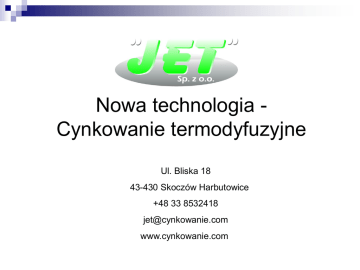 Nowa technologia Cynkowanie termodyfuzyjne Ul. Bliska 18 43-430 Skoczów Harbutowice +48 33 8532418 [email protected] www.cynkowanie.com Nowa technologia – cynkowanie termodyfuzyjne Pragniemy zaprezentować nowe rozwiązanie w dziedzinie ochrony drobnych elementów przed korozja – cynkowanie termodyfuzyjne. Uruchomilismy pierwszą w Polsce linię do cynkowania termodyfuzyjnego. Technologia termodyfuzyjna jest najnowszą technologią ochrony przed korozją. Cynkowanie termodyfuzyjne wyznacza nową jakość w ochronie przed korozją gwarantując nieporównywalnie lepszą powłokę od obecnie stosowanych zabezpieczeń antykorozyjnych. Mamy nadzieję że zainteresujemy Państwa naszą ofertą i zechcecie Państwo z niej skorzystać. Metody cynkowania Cynkowanie elektrolityczne - proces cynkowania przebiega w sposób elektrolityczny w temperaturze pokojowej. Cynkowanie ogniowe - wyroby stalowe po oczyszczeniu ich powierzchni zanurzane są w roztopionej kąpieli cynkowej w temperaturze 450 do 600 °C. Cynkowanie termodyfuzyjne (szerardyzacja) - proces cynkowania odbywa się w zamkniętych pojemnikach w których odbywa się proces termodyfuzji cynku w głąb struktur metalicznych żelaza. Proces cynkowania termodyfuzyjnego Proces bazuje na reakcji znajdujących się w pojemniku roboczym części stalowych cynkiem. Reakcja odbywa się w piecu elektrycznym w temperaturze 360 - 430 st. C. Rezultatem procesu jest powstanie zdyfundowanej warstwy cynku na zewnętrznej powierzchni zabezpieczanych wyrobów stalowych. Powstała w ten sposób warstwa powierzchniowa wykazuje niezwykle wysoka odporność na działanie korozji. Struktura warstwy powierzchniowej Warstwa powierzchniowa uzyskana w wyniku cynkowania termodyfuzyjnego składa się z różnych miedzykrystalicznych związków cynku i żelaza. WARSTWA PASYWJĄCA WARSTWA BOGATA W CYNK WARSTWA DYFUZYJNA CYNK - ŻELAZO Fe Zn7 +Zn Fe Zn7 Fe11 Zn40 STAL Przekrój warstwy (pod mikroskopem optycznym) Przykład: powiekszenie 200 x Solid solution Steel Zn in Fe Zalety technologii Mocne adhezyjne połączenie warstwy - bez złuszczeń i pęknięć. Wysoka odporność na korozje. Wysoka jakość pokrycia - ok. dwukrotnie dłuższy okres odporności na korozje od cynkowania ogniowego. Przykładowo powłoka klasy 35 przeznaczona do środowiska korozyjnego określona w normie na 30 mikometrów podczas gdy przy cynkowaniu ogniowym na 70 mikometrów. Wysoka trwałość uzyskanej powierzchni – bardzo dobra odporność na ścieranie. Jednolita grubość uzyskanej warstwy. Gładka powłoka – eliminuje narosty cynkowe i chropowatość. Kompleksowe pokrycie - powtarzalność obróbki. Uzyskanie doskonałego przygotowania powierzchni do lakierowania i do wulkanizacji. Możliwość uzyskania grubości warstwy cynkowanej w zakresie od 15 do 120 µm. Stosunkowo niska temperatura procesu - możliwość obróbki części specjalnych, jak np. sprężyn bez utraty ich własności mechanicznych i wytrzymałościowych stali. Możliwość cynkowania w kolorach: szarym, srebrnym, czarnym i zielonym. Proces przyjazny środowisku. Brak chromianowania. Porównanie różnych metod cynkowania Cechy charakterystyczne Czy jest możliwe pokrywanie cynkiem bez obróbki wstępnej? Odporność na korozję Grubość warstwy cynkowej (µm) Dokładność pokrycia Końcowa jakość i jednorodność obróbki Czy jest możliwa inna obróbka powierzchniowa (np. lakierowanie, pokrywanie warstwą gumy lub tworzywa sztucznego) bez dodatkowej wstępnej obróbki powierzchniowej? Czy proces jest procesem ekonomicznym z punktu widzenia zaangażowanie siły roboczej? Czy jest możliwa Grubość warstwy do obróbka małych 20 µm części? Grubość warstwy od 20 do 50 µm Grubość warstwy powyżej 50 µm Poziom skażenia lub zanieczyszczenia środowiska naturalnego Szkodliwość technologii dla zdrowia pracowników Cynkowanie ogniowe Nie Cynkowanie elektrolityczne Nie Cynkowanie dyfuzyjne Nie Powlekanie mechaniczne Nie Lakierowanie cynkowe Nie Cynkowanie termodyfuzyjne TAK Bardzo wysoka 50 – 120 Niska Niska Nie Niska 5 – 15 Wysoka Średnia + Nie Średnia + 5, 15, 30 Średnia Średnia + Tak Średnia + ok. 20 Średnia Średnia + Tak Średnia ok. 10 Wysoka Wysoka Nie dotyczy Bardzo wysoka 15 – 120 Wysoka Wysoka Tak Nie Nie Nie Nie Nie Tak Nie Nie Nie Nie Nie Tak Nie Nie Tak Nie Nie Tak Tak, ale tylko w Nie wirówce w kąpieli ceramicznej Bardzo wysoki Wysoki Nie Nie Nie Tak Średni + Średni + Wysoki Niski Bardzo wysoka Wysoka Średnia - Średnia - Średnia - Niska Porównanie metod cynkowania Grubosc warstwy µm Zmiana grubosci warstwy w mgle solnej 45 Próbki po 1500h w komorze solnej Cynkowanie termodyfuzyjne Cynkowanie elektrolityczne Cynkowanie elektrolityczne Cynkowanie ogniowe Cynkowanie ogniowe Czas przebywania w mgle solnej (godz.) 450 godz. Cynkowanie termodyfuzyjne Klasy powłoki – norma PN EN 13811 Zgodnie z normą PN EN 13811 powłoka termodyfuzyjna, może zostać nałożona wg następujących klas grubości: Klasa Min. grubość powłoki (um) Klasa 15 15 Klasa 30 30 Klasa 45 45 Zastosowanie Przeciętne warunki wewnętrzne. Odporność porównywalna do pokrycia galwanicznego Warunki zewnętrzne i wewnętrzne w środowisku bardziej agresywnym lub jeśli wymaga tego przedłużona żywotność powłoki. Środowisko silnie korozyjne, atmosfera przemysłowa. Odporność porównywalna co ocynku ogniowego Inne klasy powoki Dodatkowo możliwośc nakladania powok o wymiarach Klasa Min. grubość powłoki (um) Klasa 75 75 Klasa 90 90 Zastosowanie Warunki zewnętrzne podwyższona odporność antykorozyjna. Środowisko morskie Najwyższa ochrona antykorozyjna Zastosowanie: Budownictwo, Przemysł motoryzacyjny, autostrady, Energetyka, Asortyment: Śruby, wkręty, gwoździe Sprężyny Inne drobne elementy do długości 350mm Kolory: Szary Grafitowy