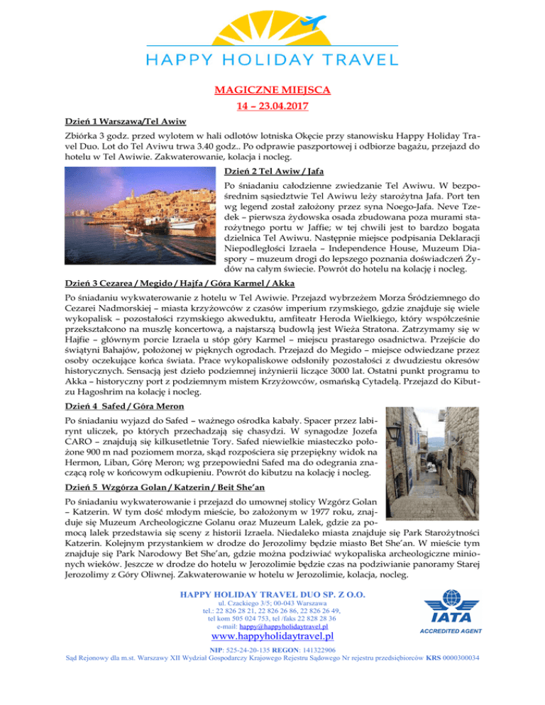 MAGICZNE MIEJSCA 14 – 23.04.2017 Dzień 1 Warszawa/Tel Awiw Zbiórka 3 godz. przed wylotem w hali odlotów lotniska Okęcie przy stanowisku Happy Holiday Travel Duo. Lot do Tel Aviwu trwa 3.40 godz.. Po odprawie paszportowej i odbiorze bagażu, przejazd do hotelu w Tel Awiwie. Zakwaterowanie, kolacja i nocleg. Dzień 2 Tel Awiw / Jafa Po śniadaniu całodzienne zwiedzanie Tel Awiwu. W bezpośrednim sąsiedztwie Tel Awiwu leży starożytna Jafa. Port ten wg legend został założony przez syna Noego-Jafa. Neve Tzedek – pierwsza żydowska osada zbudowana poza murami starożytnego portu w Jaffie; w tej chwili jest to bardzo bogata dzielnica Tel Awiwu. Następnie miejsce podpisania Deklaracji Niepodległości Izraela – Independence House, Muzeum Diaspory – muzeum drogi do lepszego poznania doświadczeń Żydów na całym świecie. Powrót do hotelu na kolację i nocleg. Dzień 3 Cezarea / Megido / Hajfa / Góra Karmel / Akka Po śniadaniu wykwaterowanie z hotelu w Tel Awiwie. Przejazd wybrzeżem Morza Śródziemnego do Cezarei Nadmorskiej – miasta krzyżowców z czasów imperium rzymskiego, gdzie znajduje się wiele wykopalisk – pozostałości rzymskiego akweduktu, amfiteatr Heroda Wielkiego, który współcześnie przekształcono na muszlę koncertową, a najstarszą budowlą jest Wieża Stratona. Zatrzymamy się w Hajfie – głównym porcie Izraela u stóp góry Karmel – miejscu prastarego osadnictwa. Przejście do świątyni Bahajów, położonej w pięknych ogrodach. Przejazd do Megido – miejsce odwiedzane przez osoby oczekujące końca świata. Prace wykopaliskowe odsłoniły pozostałości z dwudziestu okresów historycznych. Sensacją jest dzieło podziemnej inżynierii liczące 3000 lat. Ostatni punkt programu to Akka – historyczny port z podziemnym mistem Krzyżowców, osmańską Cytadelą. Przejazd do Kibutzu Hagoshrim na kolację i nocleg. Dzień 4 Safed / Góra Meron Po śniadaniu wyjazd do Safed – ważnego ośrodka kabały. Spacer przez labirynt uliczek, po których przechadzają się chasydzi. W synagodze Jozefa CARO – znajdują się kilkusetletnie Tory. Safed niewielkie miasteczko położone 900 m nad poziomem morza, skąd rozpościera się przepiękny widok na Hermon, Liban, Górę Meron; wg przepowiedni Safed ma do odegrania znaczącą rolę w końcowym odkupieniu. Powrót do kibutzu na kolację i nocleg. Dzień 5 Wzgórza Golan / Katzerin / Beit She’an Po śniadaniu wykwaterowanie i przejazd do umownej stolicy Wzgórz Golan – Katzerin. W tym dość młodym mieście, bo założonym w 1977 roku, znajduje się Muzeum Archeologiczne Golanu oraz Muzeum Lalek, gdzie za pomocą lalek przedstawia się sceny z historii Izraela. Niedaleko miasta znajduje się Park Starożytności Katzerin. Kolejnym przystankiem w drodze do Jerozolimy będzie miasto Bet She’an. W mieście tym znajduje się Park Narodowy Bet She’an, gdzie można podziwiać wykopaliska archeologiczne minionych wieków. Jeszcze w drodze do hotelu w Jerozolimie będzie czas na podziwianie panoramy Starej Jerozolimy z Góry Oliwnej. Zakwaterowanie w hotelu w Jerozolimie, kolacja, nocleg. HAPPY HOLIDAY TRAVEL DUO SP. Z O.O. ul. Czackiego 3/5; 00-043 Warszawa tel.: 22 826 28 21, 22 826 26 86, 22 826 26 49, tel kom 505 024 753, tel /faks 22 828 28 36 e-mail: [email protected] www.happyholidaytravel.pl NIP: 525-24-20-135 REGON: 141322906 Sąd Rejonowy dla m.st. Warszawy XII Wydział Gospodarczy Krajowego Rejestru Sądowego Nr rejestru przedsiębiorców KRS 0000300034 Dzień 6 Stara Jerozolima Po śniadaniu całodzienne zwiedzanie Starej Jerozolimy. Zobaczymy m.in. Ścianę Płaczu, Tunel Jerozolimski, Miasto Dawida, Wieżę Dawida – starożytną cytadelę wzniesioną w celu lepszej obrony Starej Jerozolimy, Burnt House – pozostałości domu z czasów Drugiej Świątyni, wykopaliska znajdują się sześć metrów poniżej obecnego poziomu ulicy, Cardo – zrekonstruowana główna ulica Jerozolimy z czasów rzymskich i bizantyjskich, ciągnąca się z północy na południe. Powrót do hotelu na kolację i nocleg. Dzień 7 Nowa Jerozolima Po śniadaniu wyjazd do Yad Vashem. Po południu zwiedzanie Muzeum Izraela, Knesseth, Budynki Parlamentu. Powrót do hotelu na kolację i nocleg. Dzień 8 Morze Martwe / Massada / Qumran Po śniadaniu wyjazd nad Morze Martwe, po drodze wjazd kolejką linową na Massadę. Powietrze nad morzem jest wyjątkowo suche, a temperatura wysoka. Z powodu depresji powietrze zawiera o 10%więcej tlenu, a brak miast i przemysłu decyduje o jego czystości. Wszystko to przyspiesza metabolizm i działa regenerująco na nasz organizm. W odległym o kilka kilometrów Qumran, znajdują się wykopaliska słynnych Zwojów znad Morza Martwego, uważane za jedno z najważniejszych odkryć w historii narodu żydowskiego. Powrót do Jerozolimy na kolację i nocleg. Dzień 9 Jerozolima Śniadanie i obiadokolacja w hotelu w Jerozolimie. Dzień wolny na zakupy, indywidualne zwiedzanie, odpoczynek. Dzień 10 Tel Awiw / Warszawa Nad ranem transfer na lotnisko do Tel Awiwu. Wylot do Warszawy ok 06.00. CENA: 4.995 PLN Cena zawiera: przelot rejsowymi liniami lotniczymi ELAL na trasie WAW – TLV - WAW hotele ***/**** wyżywienie: śniadania i obiadokolacje w formie bufetu licencjonowany przewodnik w języku polskim klimatyzowany autokar na całej trasie przejazdów ubezpieczenie AXA (KL 30.000 EURO, NW 4.000 EUR, bagaż podróżny 400 EUR) Cena nie zawiera: biletów wstępu, napiwków – ok. 60 USD dodatkowego ubezpieczenia od następstw chorób przewlekłych ok. 350 PLN dodatkowego ubezpieczenia od kosztów rezygnacji – 3 % wartości imprezy dopłata do pokoju jednoosobowego – 360 USD Uwaga!!! Program jest ramowy i kolejność zwiedzania może ulec zmianie! Realizacja programu przy min. 20 osobach. HAPPY HOLIDAY TRAVEL DUO SP. Z O.O. ul. Czackiego 3/5; 00-043 Warszawa tel.: 22 826 28 21, 22 826 26 86, 22 826 26 49, tel kom 505 024 753, tel /faks 22 828 28 36 e-mail: [email protected] w