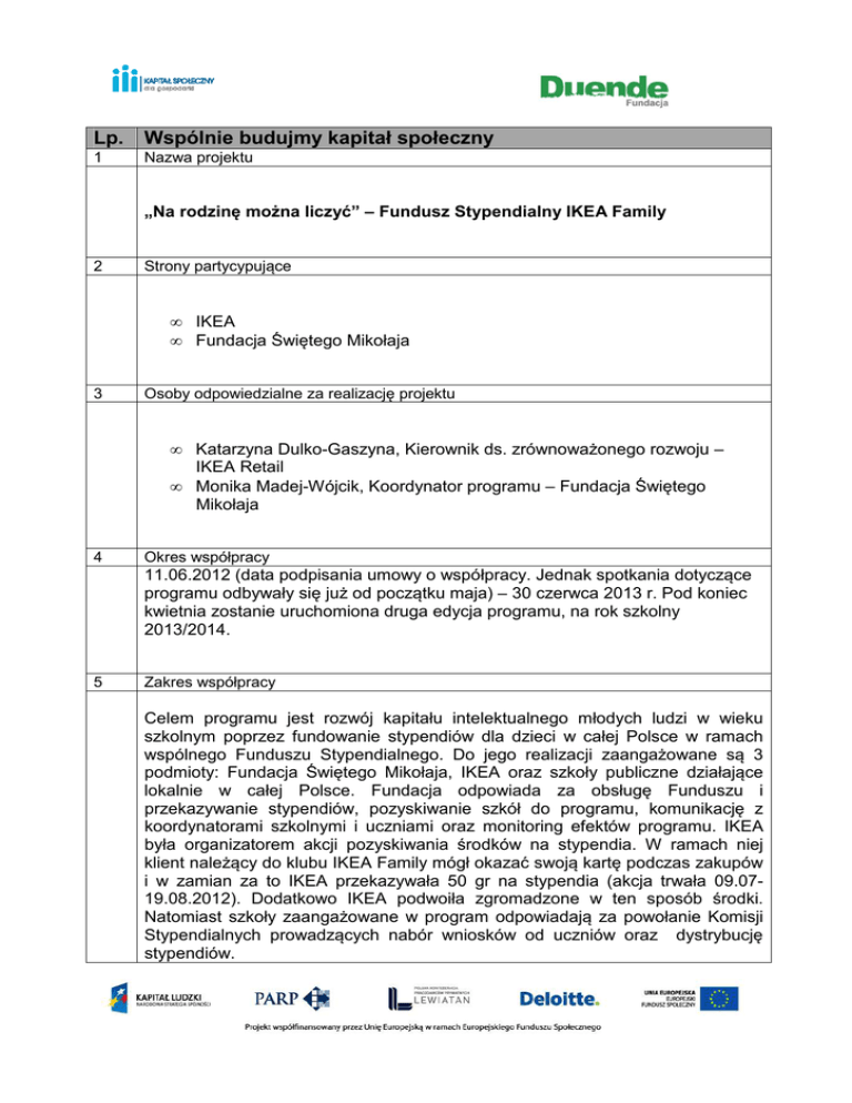 Lp. Wspólnie budujmy kapitał społeczny 1 Nazwa projektu „Na rodzinę można liczyć” – Fundusz Stypendialny IKEA Family 2 Strony partycypujące • • 3 Osoby odpowiedzialne za realizację projektu • • 4 IKEA Fundacja Świętego Mikołaja Katarzyna Dulko-Gaszyna, Kierownik ds. zrównoważonego rozwoju – IKEA Retail Monika Madej-Wójcik, Koordynator programu – Fundacja Świętego Mikołaja Okres współpracy 11.06.2012 (data podpisania umowy o współpracy. Jednak spotkania dotyczące programu odbywały się już od początku maja) – 30 czerwca 2013 r. Pod koniec kwietnia zostanie uruchomiona druga edycja programu, na rok szkolny 2013/2014. 5 Zakres współpracy Celem programu jest rozwój kapitału intelektualnego młodych ludzi w wieku szkolnym poprzez fundowanie stypendiów dla dzieci w całej Polsce w ramach wspólnego Funduszu Stypendialnego. Do jego realizacji zaangażowane są 3 podmioty: Fundacja Świętego Mikołaja, IKEA oraz szkoły publiczne działające lokalnie w całej Polsce. Fundacja odpowiada za obsługę Funduszu i przekazywanie stypendiów, pozyskiwanie szkół do programu, komunikację z koordynatorami szkolnymi i uczniami oraz monitoring efektów programu. IKEA była organizatorem akcji pozyskiwania środków na stypendia. W ramach niej klient należący do klubu IKEA Family mógł okazać swoją kartę podczas zakupów i w zamian za to IKEA przekazywała 50 gr na stypendia (akcja trwała 09.0719.08.2012). Dodatkowo IKEA podwoiła zgromadzone w ten sposób środki. Natomiast szkoły zaangażowane w program odpowiadają za powołanie Komisji Stypendialnych prowadzących nabór wniosków od uczniów oraz dystrybucję stypendiów. 6 Beneficjenci projektu Program „Na rodzinę można liczyć” dedykowany jest zdolnym dzieciom, którym brakuje środków finansowych na rozwinięcie swoich talentów i pasji. Chcemy wyrównywać szanse edukacyjne tych dzieci, a także wzmocnić ich kapitał intelektualny, który może przyczynić się do poprawy ich sytuacji w przyszłości, a także do wzmocnienia potencjału lokalnych społeczności, które stoją naprzeciw wyzwań nowej rzeczywistości gospodarki opartej na wiedzy. Z badań przeprowadzonych w Polsce w 2010 roku wynika, że co piąte dziecko żyje w biedzie*, a 14% dzieci żyje w skrajnym ubóstwie**. Bieda doświadczana w dzieciństwie wpływa na całe życie, a jedną z głównych jej przyczyn i skutków jest właśnie brak edukacji. Co więcej, to właśnie brak środków finansowych często jest barierą uniemożliwiającą rozwój potencjału intelektualnego dzieci i młodzieży. Według ustaleń Instytutu Badań Edukacyjnych jedną z głównych determinant sukcesu edukacyjnego dzieci jest poziom statusu ekonomicznospołecznego ich rodziców. Badacze definiując na potrzeby badania status ekonomiczno-społeczny poprzez poziom wykształcenia zaobserwowali, że gdy choć przynajmniej jedno z rodziców skończyło wyższą uczelnie, to szanse uzyskania wyższego wykształcenia przez dziecko wynoszą 73%. Szanse te maleją, gdy rodzice nie mają wykształcenia wyższego. Na przykład dla dzieci osób z wykształceniem podstawowym nieukończonym wynoszą zaledwie 9%. W przytaczanych powyżej badaniach dla obu zmiennych policzony został współczynnik determinacji, który wyniósł 28%. Porównując go z podobnymi współczynnikami dotyczącymi zależności pomiędzy poziomem wykształcenia rodziców, a wynikami w testach inteligencji, zauważymy że wpływ wykształcenia rodziców na poziom wykształcenia dzieci jest najmocniejszy***. Te dane dotyczą jedynie udziału w edukacji formalnej, udział we wszystkich zajęciach dodatkowych i kursach ze względu na poziom statusu ekonomiczno-społecznego rodziców wygląda jeszcze gorzej. Chcąc przerwać ten „zaklęty krąg” zdecydowaliśmy się wspierać zdolnych i zaangażowanych uczniów. Jesteśmy przekonani, że gromadzony w trakcie edukacji kapitał intelektualny zapewnia mobilność w ramach struktury społecznej oraz stwarza szansę na lepsze ulokowanie na rynku pracy w dorosłym życiu. * Główny Urząd Statystyczny, raport „Ubóstwo w Polsce w 2010 r.” ** UNICEF, raport „Ubóstwo dzieci” 2012 *** Instytut Badań Edukacyjnych „Społeczeństwo w drodze do wiedzy. Raport o stanie edukacji 2010” 7 Opis projektu Dzięki współpracy pomiędzy IKEA a Fundacją Świętego Mikołaja w czerwcu 2012 roku został założony Fundusz Stypendialny skierowany do zdolnych dzieci i młodzieży, którym brakuje środków finansowych, aby móc rozwinąć swoje talenty i pasje. Istotnym kryterium przyznawania stypendium jest również zaangażowanie społeczne uczniów, ponieważ chcemy wspierać osoby aktywne i przyczyniające się do wzmocnienia potencjału swoich lokalnych społeczności. O stypendia mogą ubiegać się uczniowie V i VI klas szkół podstawowych, a także gimnazjów i szkół ponadgimnazjalnych. Ważne dla nas również jest, aby w procesie decyzyjnym w trakcie przyznawania stypendiów, wiodącą rolę pełniły podmioty lokalne, dlatego koordynowanie prac komisji stypendialnych przekazaliśmy szkołom (zasada subsydiarności). Dzięki temu możemy być pewni, że stypendium trafi do właściwych osób, a także że kwestia rozwoju kapitału intelektualnego i przeciwdziałania nierównościom edukacyjnym jest obecna w dyskursie społeczności lokalnych. Do udziału w programie pozyskano 108 szkół z całej Polski. Zaangażowani w pozyskiwanie środków na Fundusz Stypendialny byli również pracownicy sklepów IKEA z całej Polski, a także uczestnicy klubu IKEA Family. Ze względu na owocną współpracę pomiędzy partnerami planowana już teraz jest kolejna edycja programu, a także wystawa prezentująca naszych stypendystów we wszystkich sklepach IKEA (początek: maj 2013). 8 Efekt współpracy • Do programu przystąpiło 108 szkół z całej Polski. • IKEA przekazała 293 539 zł na stypendia dla zdolnych uczniów z ni