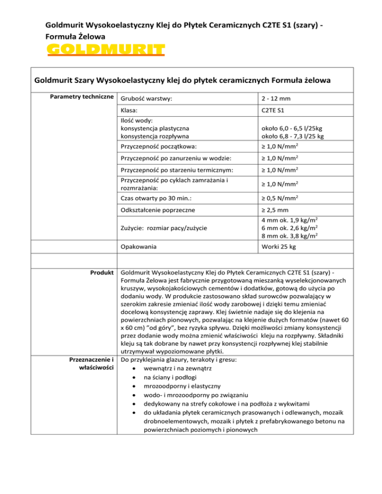 Goldmurit Wysokoelastyczny Klej do Płytek Ceramicznych C2TE S1 (szary) Formuła Żelowa Goldmurit Szary Wysokoelastyczny klej do płytek ceramicznych Formuła żelowa Parametry techniczne Grubość warstwy: 2 - 12 mm Klasa: C2TE S1 Ilość wody: konsystencja plastyczna konsystencja rozpływna około 6,0 - 6,5 l/25kg około 6,8 - 7,3 l/25 kg Przyczepność początkowa: ≥ 1,0 N/mm2 Przyczepność po zanurzeniu w wodzie: ≥ 1,0 N/mm2 Przyczepność po starzeniu termicznym: ≥ 1,0 N/mm2 Przyczepność po cyklach zamrażania i rozmrażania: ≥ 1,0 N/mm2 Czas otwarty po 30 min.: ≥ 0,5 N/mm2 Odkształcenie poprzeczne ≥ 2,5 mm Zużycie: rozmiar pacy/zużycie 4 mm ok. 1,9 kg/m2 6 mm ok. 2,6 kg/m2 8 mm ok. 3,8 kg/m2 Opakowania Worki 25 kg Produkt Goldmurit Wysokoelastyczny Klej do Płytek Ceramicznych C2TE S1 (szary) Formuła Żelowa jest fabrycznie przygotowaną mieszanką wyselekcjonowanych kruszyw, wysokojakościowych cementów i dodatków, gotową do użycia po dodaniu wody. W produkcie zastosowano skład surowców pozwalający w szerokim zakresie zmieniać ilość wody zarobowej i dzięki temu zmieniać docelową konsystencję zaprawy. Klej świetnie nadaje się do klejenia na powierzchniach pionowych, pozwalając na klejenie dużych formatów (nawet 60 x 60 cm) ”od góry”, bez ryzyka spływu. Dzięki możliwości zmiany konsystencji przez dodanie wody można zmienić właściwości kleju na rozpływny. Składniki kleju są tak dobrane by nawet przy konsystencji rozpływnej klej stabilnie utrzymywał wypoziomowane płytki. Przeznaczenie i Do przyklejania glazury, terakoty i gresu: właściwości wewnątrz i na zewnątrz na ściany i podłogi mrozoodporny i elastyczny wodo- i mrozoodporny po związaniu dedykowany na strefy cokołowe i na podłoża z wykwitami do układania płytek ceramicznych prasowanych i odlewanych, mozaik drobnoelementowych, mozaik i płytek z prefabrykowanego betonu na powierzchniach poziomych i pionowych Goldmurit Wysokoelastyczny Klej do Płytek Ceramicznych C2TE S1 (szary) Formuła Żelowa do przyklejania na powierzchniach z betonu, anhydrytu, płyt gipsowo kartonowych, gipsowo włókninowych, tynkach wapienno cementowych i gipsowych, na balkonach tarasach i fasadach do podłoży ogrzewanych i schładzanych (ogrzewanie podłogowe i ścienne, pomieszczenia chłodni) na podłoża użytkowane w warunkach dużej amplitudy temperatur do renowacji starych podłoży ceramicznych metodą „płytki na płytki” odporny na temperatury od -20ºC do +80ºC Podłoże Podłoże musi być nośne, suche, czyste, wolne od kurzu, nie przemarznięte i wolne od resztek środków antyadhezyjnych. Stare powłoki malarskie, oleje, tłuszcze i inne resztki osłabiające przyczepność muszą zostać usunięte. Podłoża gipsowe i anhydrytowe zagruntować gruntem uniwersalnym Goldmurit. W przypadku podłoży silnie pylących należy je zagruntować wodnym gruntem głęboko penetrującym Goldmurit. Wilgotność podłoża nie może przekraczać 3 % CM dla podłoży cementowych, 0,5 % CM dla podłoży anhydrytowych i dla tynków gipsowych nie więcej niż 1 % CM. Obróbka Zawartość worka rozrobić z odpowiednią ilością czystej wody (zgodnie z zaleceniami) za pomocą mieszadła wolnoobrotowego, aż do uzyskania jednakowej konsystencji wolnej od grudek. Po ok. 5 min. należy ponownie krótko zamieszać uzyskaną masę. Klej powinien uzyskać żelowatą konsystencję. Docelową konsystencję, dopasowaną do upodobań, można uzyskać odpowiednio zmieniając ilość wody. Z naszego doświadczenia wynika iż odpowiednia ilość do klejenia okładzin ściennych to około 6,3 L/25kg. Tak przygotowana zaprawa jest zdatna do użycia przez ok. trzy godziny. W przypadku częściowego związania zaprawy niedopuszczalne jest ponowne jej rozrabianie wodą. Przygotowana zaprawa nie powinna być również mieszana z wodą czy suchą zaprawą w celu zmiany konsystencji. Zaprawę należy nakładać pacą zębatą o odpowiednim rozmiarze dostosowanym do gabarytów płytek. Nie należy nakładać kleju na powierzchnie większą niż 1,5 m2. Płytki należy układać przed rozpoczęciem procesu tworzenia „naskórka”, tzn. przed upływem max. 30 min od nałożenia kleju. Ułożoną glazurę lub terakotę docisnąć mocno do podłoża tak, aby cała powierzchnia płytki pokryta była klejem. Spoiny należy oczyścić z resztek kleju zanim ten stwardnieje. Próby usunięcia związanego kleju mogą doprowadzić do uszkodzenia powierzchni glazury. Uwaga Klej nie nadaje się do wyrównywania podłoża. W razie takiej konieczności należy użyć zaprawy wyrównawczej Goldmurit. Podczas nakładania i wiązania Goldmurit Wysokoelastyczny Klej do Płytek Ceramicznych C2TE S1 (szary) Formuła Żelowa należy chronić go przed nadmiernym nasłonecznieniem, silnym wiatrem, mrozem i opadami deszczu. Podczas prac należy przestrzegać ogólnych reguł sztuki budowlanej. Temperatura stosowania Temperatura powietrza, podłoża jak i produktu powinna zawierać się w granicach 5-25 °C. Niższa lub wyższa temperatura od optymalnej wpływa negatywnie na właściwości produktu. Szczególnie należy chronić produkt przed przemrożeniem i bezpośrednim słońcem w pierwszych 24h po nałożeniu. Goldmurit Wysokoelastyczny Klej do Płytek Ceramicznych C2TE S1 (szary) Formuła Żelowa Czas wysychania Płytki przyklejone Goldmurit Wysokoelastycznym Klejem do Płytek Ceramicznych C2TE S1 (szary) - Formuła Żelowa po ok. 24 godzinach można spoinować. Pełne obciążanie może nastąpić nie wcześniej niż po 14 dniach. Warunki obróbki Temperatura powietrza, podłoża jak i produktu powinna zawierać się w granicach 5-25 °C. Niższa lub wyższa temperatura od optymalnej wpływa negatywnie na właściwości produktu. Podłoże musi być nie przemarznięte, suche i zabezpieczone przed wpływem bezpośredniego działania promieni słońca, i silnego wiatru. W trakcie aplikacji i obróbki należy stosować się do