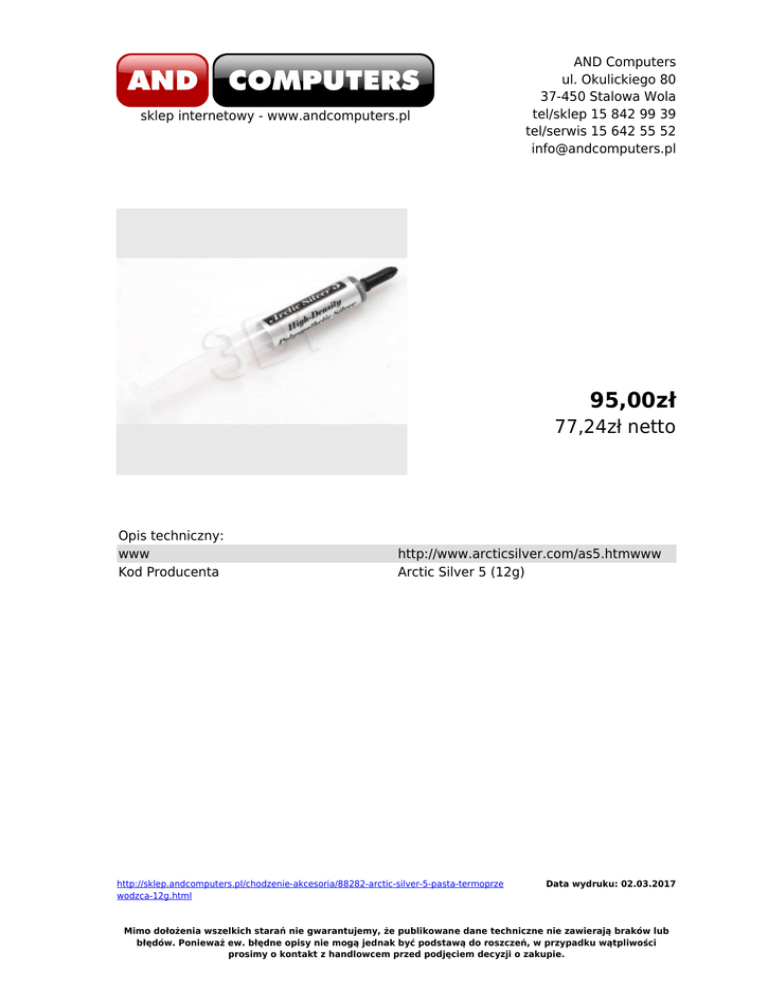 sklep internetowy - www.andcomputers.pl AND Computers ul. Okulickiego 80 37-450 Stalowa Wola tel/sklep 15 842 99 39 tel/serwis 15 642 55 52 [email protected] 95,00zł 77,24zł netto Opis techniczny: www Kod Producenta http://www.arcticsilver.com/as5.htmwww Arctic Silver 5 (12g) http://sklep.andcomputers.pl/chodzenie-akcesoria/88282-arctic-silver-5-pasta-termoprze wodzca-12g.html Data wydruku: 02.03.2017 Mimo dołożenia wszelkich starań nie gwarantujemy, że publikowane dane techniczne nie zawierają braków lub błędów. Ponieważ ew. błędne opisy nie mogą jednak być podstawą do roszczeń, w przypadku wątpliwości prosimy o kontakt z handlowcem przed podjęciem decyzji o zakupie.