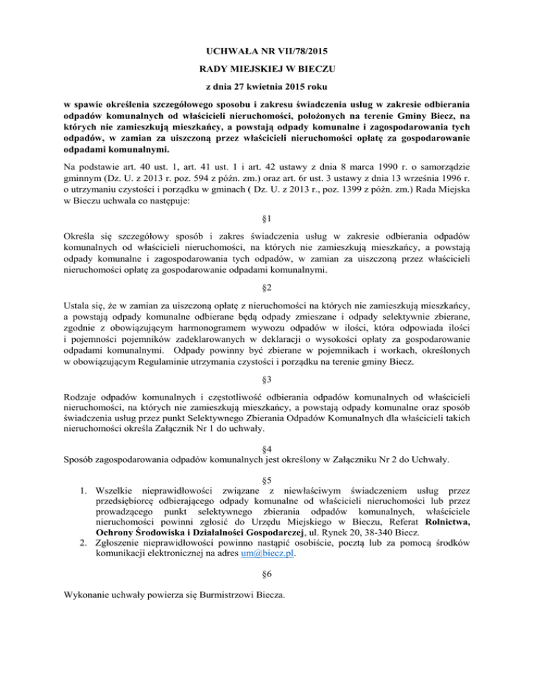 UCHWAŁA NR VII/78/2015 RADY MIEJSKIEJ W BIECZU z dnia 27 kwietnia 2015 roku w spawie określenia szczegółowego sposobu i zakresu świadczenia usług w zakresie odbierania odpadów komunalnych od właścicieli nieruchomości, położonych na terenie Gminy Biecz, na których nie zamieszkują mieszkańcy, a powstają odpady komunalne i zagospodarowania tych odpadów, w zamian za uiszczoną przez właścicieli nieruchomości opłatę za gospodarowanie odpadami komunalnymi. Na podstawie art. 40 ust. 1, art. 41 ust. 1 i art. 42 ustawy z dnia 8 marca 1990 r. o samorządzie gminnym (Dz. U. z 2013 r. poz. 594 z późn. zm.) oraz art. 6r ust. 3 ustawy z dnia 13 września 1996 r. o utrzymaniu czystości i porządku w gminach ( Dz. U. z 2013 r., poz. 1399 z późn. zm.) Rada Miejska w Bieczu uchwala co następuje: §1 Określa się szczegółowy sposób i zakres świadczenia usług w zakresie odbierania odpadów komunalnych od właścicieli nieruchomości, na których nie zamieszkują mieszkańcy, a powstają odpady komunalne i zagospodarowania tych odpadów, w zamian za uiszczoną przez właścicieli nieruchomości opłatę za gospodarowanie odpadami komunalnymi. §2 Ustala się, że w zamian za uiszczoną opłatę z nieruchomości na których nie zamieszkują mieszkańcy, a powstają odpady komunalne odbierane będą odpady zmieszane i odpady selektywnie zbierane, zgodnie z obowiązującym harmonogramem wywozu odpadów w ilości, która odpowiada ilości i pojemności pojemników zadeklarowanych w deklaracji o wysokości opłaty za gospodarowanie odpadami komunalnymi. Odpady powinny być zbierane w pojemnikach i workach, określonych w obowiązującym Regulaminie utrzymania czystości i porządku na terenie gminy Biecz. §3 Rodzaje odpadów komunalnych i częstotliwość odbierania odpadów komunalnych od właścicieli nieruchomości, na których nie zamieszkują mieszkańcy, a powstają odpady komunalne oraz sposób świadczenia usług przez punkt Selektywnego Zbierania Odpadów Komunalnych dla właścicieli takich nieruchomości określa Załącznik Nr 1 do uchwały. §4 Sposób zagospodarowania odpadów komunalnych jest określony w Załączniku Nr 2 do Uchwały. §5 1. Wszelkie nieprawidłowości związane z niewłaściwym świadczeniem usług przez przedsiębiorcę odbierającego odpady komunalne od właścicieli nieruchomości lub przez prowadzącego punkt selektywnego zbierania odpadów komunalnych, właściciele nieruchomości powinni zgłosić do Urzędu Miejskiego w Bieczu, Referat Rolnictwa, Ochrony Środowiska i Działalności Gospodarczej, ul. Rynek 20, 38-340 Biecz. 2. Zgłoszenie nieprawidłowości powinno nastąpić osobiście, pocztą lub za pomocą środków komunikacji elektronicznej na adres [email protected]. §6 Wykonanie uchwały powierza się Burmistrzowi Biecza. §7 Uchwała wchodzi w życie po upływie 14 dni od dnia jej ogłoszenia w Dzienniku Urzędowym Województwa Małopolskiego, z mocą obowiązującą od dnia 1 lipca 2015 roku. Przewodniczący Rady Miejskiej w Bieczu /-/ Grzegorz Nosal Załącznik Nr 1 do Uchwały Nr VII/78/2015 Rady Miejskiej w Bieczu z dnia 27 kwietnia 2015 roku CZĘSTOTLIWOŚĆ ODBIORU ODPADÓW KOMUNALNYCH Z NIERUCHOMOŚCI NA KTÓRYCH NIE ZAMIESZKUJĄ MIESZKAŃCY A POWSTAJĄ ODPADY KOMUNALNE GRUPA ODPADÓW PODSTAWOWA TEREN RODZAJ ODPADÓW zmieszane odpady biodegradowalne w tym opakowania ulegające biodegradacji tworzywa sztuczne wielomateriałowe metal szkło papier, tektura DODATKOWA odpady wielkogabarytowe zużyte opony odpady elektryczne i elektroniczne odpady budowlane i rozbiórkowe przeterminowane leki baterie i akumulatory chemikalia WIEJSKI I MIEJSKI ŚCISŁA ZABUDOWA MIEJSKA raz na dwa tygodnie dwa razy w tygodniu Możliwość dostarczenia selektywnie zbieranych odpadów komunalnych do punktu selektywnego zbierania odpadów komunalnych (PSZOK) zgodnie z obowiązującym cennikiem PSZOK raz na 2 tygodnie Całorocznie w punkcie selektywnego zbierania odpadów komunalnych zgodnie z obowiązującym cennikiem PSZOK Możliwość dostarczenia selektywnie zbieranych odpadów komunalnych do punktu selektywnego zbierania odpadów komunalnych (PSZOK) zgodnie z obowiązującym cennikiem PSZOK raz na 2 tygodnie Całorocznie w punkcie selektywnego zbierania odpadów komunalnych zgodnie z obowiązującym cennikiem PSZOK Załącznik Nr 2 do Uchwały Nr VII/78/2015 Rady Miejskiej w Bieczu z dnia 27 kwietnia 2015 roku Sposób zagospodarowania odpadów komunalnych ODPAD Zmieszane Biodegradowalne Tworzywa sztuczne Wielomateriałowe Metal Szkło Papier Odpady wielkogabarytowe Odpady elektryczny i elektroniczne Baterie i akumulatory Chemikalia PROCES ODZYSKU R1, R15 R1, R3, R10 R1, R5, R14, R15 R1, R5, R14, R15 R4, R5 R5, R14, R15 R1, R3, R14, R15 R1, R5, R15 R5, R14, R15 R6 R2, R6 PROCES UNIESZKODLIWIANIA D1, D10, D11 D10, D11 D10, D11 D10, D11 D10, D12 D1, D10, D11 D5, D16 PROCESY ODZYSKU R1 Wykorzystanie jako paliwa lub innego środka wytwarzania energii R2 Regeneracja lub odzyskiwanie rozpuszczalników R3 Recykling lub regeneracja substancji organicznych, które nie są stosowane jako rozpuszczalniki (włączając kompostowanie i inne biologiczne procesy przekształcania) R4 Recykling lub regeneracja metali i związków metali R5 Recykling lub regeneracja innych materiałów nieorganicznych R6 Regeneracja kwasów lub zasad R10 Rozprowadzanie na powierzchni ziemi w celu nawożenia lub ulepszania gleby R12 Wymiana odpadów w celu poddania któremukolwiek z działań wymienionych w punktach odR1doR11 R14 Inne działania polegające na wykorzystaniu odpadów w całości lub części R15 Przetwarzanie odpadów, w celu ich przygotowania do odzysku, w tym do recyklingu PROCESY UNIESZKODLIWIANIA ODPADÓW D1 Składowanie na składowiskach odpadów obojętnych D5 Składowanie na składowiskach odpadów niebezpiecznych lub na składowiskach odpadów innych niż niebezpieczne D10 Termiczne przekształcanie odpadów w instalacjach lub urządzeniach zlokalizowanych 