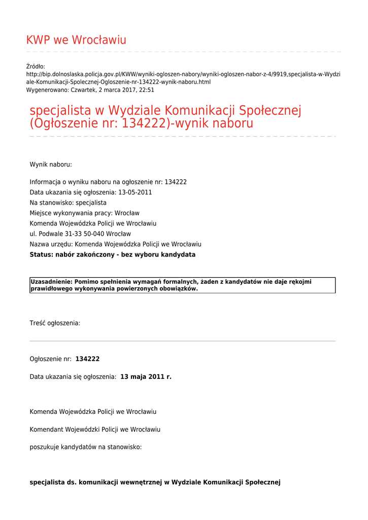 KWP we Wrocławiu Źródło: http://bip.dolnoslaska.policja.gov.pl/KWW/wyniki-ogloszen-nabory/wyniki-ogloszen-nabor-z-4/9919,specjalista-w-Wydzi ale-Komunikacji-Spolecznej-Ogloszenie-nr-134222-wynik-naboru.html Wygenerowano: Czwartek, 2 marca 2017, 22:51 specjalista w Wydziale Komunikacji Społecznej (Ogłoszenie nr: 134222)-wynik naboru Wynik naboru: Informacja o wyniku naboru na ogłoszenie nr: 134222 Data ukazania się ogłoszenia: 13-05-2011 Na stanowisko: specjalista Miejsce wykonywania pracy: Wrocław Komenda Wojewódzka Policji we Wrocławiu ul. Podwale 31-33 50-040 Wrocław Nazwa urzędu: Komenda Wojewódzka Policji we Wrocławiu Status: nabór zakończony - bez wyboru kandydata Uzasadnienie: Pomimo spełnienia wymagań formalnych, żaden z kandydatów nie daje rękojmi prawidłowego wykonywania powierzonych obowiązków. Treść ogłoszenia: Ogłoszenie nr: 134222 Data ukazania się ogłoszenia: 13 maja 2011 r. Komenda Wojewódzka Policji we Wrocławiu Komendant Wojewódzki Policji we Wrocławiu poszukuje kandydatów na stanowisko: specjalista ds. komunikacji wewnętrznej w Wydziale Komunikacji Społecznej Komendy Wojewódzkiej Policji we Wrocławiu Wymiar etatu: 1 Liczba stanowisk pracy: 1 Miejsce wykonywania pracy: Wrocław Komenda Wojewódzka Policji we Wrocławiu ul. Podwale 31-33 50-040 Wrocław Zakres zadań wykonywanych na stanowisku pracy: - tworzenie koncepcji w zakresie innowacyjnych metod komunikacji wewnętrznej wraz z wykorzystaniem i uzupełnieniem skuteczności metod już funkcjonujących, celem lepszego przepływu informacji wewnątrz organizacji - wykorzystanie funkcjonujących kanałów komunikacji zewnętrznej do przejęcia, edycji i wprowadzenia w kanały komunikacji wewnętrznej komunikatów ważnych ze względu na funkcjonowanie instytucji, celem doinformowania w danych sprawach pracowników organizacji - samodzielne redagowanie tekstów dziennikarskich i komunikatów w ramach kanałów komunikacji wewnętrznej tj. strony intranetowej oraz biuletynów drukowanych, celem pełnego przekazu aktualnych wewnątrz organizacji informacji - realizacja materiałów fotograficznych, filmowych, prezentacji wizualnych w ramach funkcjonowania Wydziału, w kontekście zagadnień komunikacji wewnętrznej, celem dokumentacji i/lub promocji działań organizacji - prowadzenie korespondencji listownej i elektronicznej (przy wykorzystaniu poczty internetowej i intranetowej) z jednostkami Policji na terenie kraju - monitorowanie forów internetowych pod kątem umieszczenia na ich łamach informacji związanych z pracą instytucji, celem możliwego przy wykorzystaniu technologii monitorowania oceny społecznej pracy organizacji - monitoring działań oficerów prasowych funkcjonujących w ramach województwa oraz przygotowywanie statystyk pod kątem zadanych kryteriów, celem oceny aktywności, skuteczności i jakości ich pracy - administrowanie stroną intranetową organizacji w zakresie działań redakcyjnych, nie informatycznych, celem aktualizacji istniejącego już serwisu oraz budowaniem nowych elementów strony Wymagania związane ze stanowiskiem pracy niezbędne wykształcenie: wyższe: dziennikarskie, komunikacja społeczna, PR doświadczenie zawodowe: 3 lata doświadczenia zawodowego pozostałe wymagania niezbędne: - znajomość prawa szczególnie prasowego i ustawy o radiofonii i telewizji, ustawy o dostępie do informacji publicznej - znajomość zasad funkcjonowania instytucji, w tym znajomość ustawy o Policji oraz struktur instytucji - praktyka w działaniach „dziennikarskich” - udokumentowane zawodowe działania związane z tworzeniem nowatorskich rozwiązań w zakresie tworzenia i/lub wykorzystania kanałów komunikacji Wymagania dodatkowe: - udokumentowana praktyczna znajomość zagadnień PR, komunikacji wewnętrznej i zewnętrznej, zasad tworzenia tekstów dziennikarskich, zdjęć i filmów oraz praw związanych z funkcjonowaniem mediów - umiejętność pracy w zespole - umiejętność obsługi urządzeń biurowych i wymaganego do pracy na stanowisku oprogramowania komputerowego ( w tym m.in.: pakiet office, adobe photoshop, pinnacle studio) Wymagana dokumenty i oświadczenia: - życiorys i list motywacyjny - oświadczenie kandydata o wyrażeniu zgody na przetwarzanie danych osobowych do celów rekrutacji, - oświadczenie kandydata o korzystaniu z pełni praw publicznych - oświadczenie kandydata o nieskazaniu prawomocnym wyrokiem za umyślne przestępstwo lub umyślne przestępstwo skarbowe - kopia dokumentów potwierdzających wykształcenie, - kopia dokumentu potwierdzającego posiadanie polskiego obywatelstwa lub oświadczenie o posiadaniu obywatelstwa polskiego Kopie innych dokumentów i oświadczenia: - kopie świadectw pracy, dokumentów potwierdzających wymagany staż, kwalifikacje itp. Termin składania dokumentów: 23 maja 2011r. Miejsce składania dokumentów: Komenda Wojewódzka Policji we Wrocławiu Wydział Kadr Sekcja Doboru ul. Podwale 31-33 50-040 Wrocław Inne informacje: W aplikacji kandydaci powinni wskazać numer ogłoszenia o naborze.Kandydaci, którzy spełnią wymogi określone w ogłoszeniu, zostaną poinformowani telefonicznie lub drogą elektroniczną o terminie kolejnego etapu naboru. Aplikacje niekompletne, nie zawierające wskazanych dokumentów lub złożone/nadesłane po terminie nie będą rozpatrywane. Do udziału w naborze zachęca się osoby niepełnosprawne. KWP we Wrocławiu nie ponosi odpowiedzialności za treść ogłoszeń o prowadzonych naborach, publikowanych w komercyjnych portalach internetowych lub innych źródłach informacji o podobnym charakterze. Metryczka Data publikacji 11.07.2011 Data modyfikacji 17.06.2016 Rejestr zmian Podmiot udostępniający informację: Biuletyn Informacji Publicznej Osoba wytwarzająca/odpowiadająca za informację: Joanna Strąk Osoba udostępniająca informację: Krzysztof Morzyński Wydział Prezydialny KWP we Wrocławiu Osoba modyfikująca informację: Krzysztof Morzyń