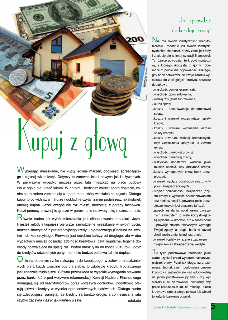 Jak sprawdzić ile kosztuje kredyt Nie ma dwóch identycznych kredyto- Kupuj z głową Wybierając mieszkanie, nie kupuj jedynie marzeń, opowieści sprzedającego i pięknej wizualizacji. Dotyczy to zarówno lokali nowych jak i używanych. W pierwszym wypadku możesz przez lata mieszkać na placu budowy lub w ogóle nie ujrzeć lokum. W drugim - będziesz musiał sporo dopłacić, zanim stara rudera zamieni się w apartament, który widziałeś na zdjęciu. Dlatego kupuj to co widzisz w naturze i dokładnie czytaj, zanim podpiszesz jakąkolwiek umowę kupna. Jeżeli czegoś nie rozumiesz, skorzystaj z porady fachowca. Koszt pomocy prawnej to grosze w porównaniu do kwoty jaką możesz stracić. Równie trudne jak wybór mieszkania jest sfinansowanie transakcji. Jeżeli jesteś młody i kupujesz pierwsze samodzielne mieszkanie w swoim życiu, możesz skorzystać z preferencyjnego kredytu hipotecznego (Rodzina na swoim) lub komercyjnego. Pierwszy jest odrobinę tańszy od drugiego, ale w obu wypadkach musisz posiadać zdolność kredytową, czyli regularne, legalne dochody pozwalające na spłatę rat. Wybór masz tylko do końca 2012 roku, gdyż do kredytów udzielonych po tym terminie budżet państwa już nie dopłaci. O ile na obecnym rynku należącym do kupującego, w zalewie mieszkaniowych ofert, każdy znajdzie coś dla siebie, to zdobycie kredytu hipotecznego jest znacznie trudniejsze. Główna przeszkoda to wysokie wymagania stawiane przez banki, które pod wpływem rekomendacji Komisji Nadzoru Finansowego domagają się od kredytobiorców coraz wyższych dochodów. Dodatkowo oferują głównie kredyty w wysoko oprocentowanych złotówkach. Dlatego zanim się zdecydujesz, pamiętaj, że kredyty są bardzo drogie, a comiesięczna rata szybko zaczyna ciążyć jak kamień u szyi. redakcja biorców. Podobnie jak dwóch identycznych nieruchomości. Każdy z nas jest inny i znajduje się w innej sytuacji finansowej. Te różnice powodują, że kredyt hipoteczny, z którego skorzystał znajomy, Tobie może zupełnie nie odpowiadać. Dlatego, gdy bank potwierdzi, że Twoje zarobki wystarczą do zaciągnięcia kredytu, sprawdź dodatkowo: wysokość comiesięcznej raty, wysokość oprocentowania, rodzaj raty (stała lub zmienna), okres spłaty, koszty i konsekwencje nieterminowej spłaty, koszty i warunki wcześniejszej spłaty kredytu, koszty i warunki wydłużenia okresu spłaty kredytu, koszty i warunki wakacji kredytowych, czyli zawieszenia spłaty rat na pewien okres, wysokość bankowej prowizji, wysokość bankowej marży, wszystkie dodatkowe warunki jakie musisz spełnić, aby otrzymać kredyt, koszty wymaganych przez bank ubezpieczeń, warunki wypłaty odszkodowania z w/w polis ubezpieczeniowych stopień opłacalności ubezpieczeń (często kredyt z wyższym oprocentowaniem bez konieczności kupowania polis ubezpieczeniowych jest znacznie tańszy), sposób ustalania opłat usług związanych z kredytem (o wiele korzystniejsze są wpisane w umowie, niż w tabeli opłat i prowizji; zmiana pierwszych wymaga Twojej zgody, a drugie bank w każdej chwili może zmienić jednostronnie), warunki i opłaty związane z żądaniem zwiększenia zabezpieczenia kredytu. T o tylko podstawowe informacje jakie warto uzyskać przed wyborem najkorzystniejszej oferty. Pytaj tak długo, aż zrozumiesz. Jednak zanim podpiszesz umowę kredytową zastanów się nad odpowiedzią na jedno podstawowe pytanie - czy wystarczy ci sił, cierpliwości i pieniędzy, aby przez kilkadziesiąt lat, co miesiąc, płacić kredytową ratę, z czego połowa lub więcej to jedynie bankowe odsetki. 5
