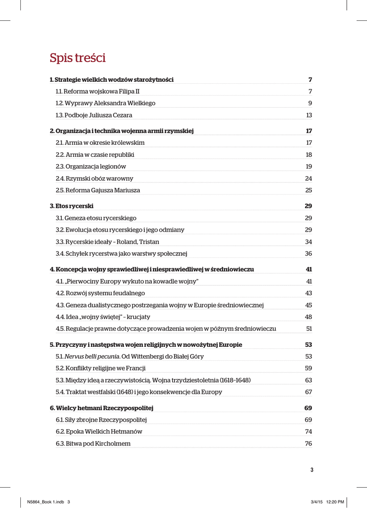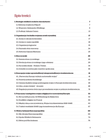 Spis treści 1. Strategie wielkich wodzów starożytności 7 1.1. Reforma wojskowa Filipa II 7 1.2. Wyprawy Aleksandra Wielkiego 9 1.3. Podboje Juliusza Cezara 13 2. Organizacja i technika wojenna armii rzymskiej 17 2.1. Armia w okresie królewskim 17 2.2. Armia w czasie republiki 18 2.3. Organizacja legionów 19 2.4. Rzymski obóz warowny 24 2.5. Reforma Gajusza Mariusza 25 3. Etos rycerski 29 3.1. Geneza etosu rycerskiego 29 3.2. Ewolucja etosu rycerskiego i jego odmiany 29 3.3. Rycerskie ideały – Roland, Tristan 34 3.4. Schyłek rycerstwa jako warstwy społecznej 36 4. Koncepcja wojny sprawiedliwej i niesprawiedliwej w średniowieczu 41 4.1. „Pierwociny Europy wykuto na kowadle wojny” 41 4.2. Rozwój systemu feudalnego 43 4.3. Geneza dualistycznego postrzegania wojny w Europie średniowiecznej 45 4.4. Idea „wojny świętej” – krucjaty 48 4.5. Regulacje prawne dotyczące prowadzenia wojen w późnym średniowieczu 51 5. Przyczyny i następstwa wojen religijnych w nowożytnej Europie 53 5.1. Nervus belli pecunia. Od Wittenbergi do Białej Góry 53 5.2. Konflikty religijne we Francji 59 5.3. Między ideą a rzeczywistością. Wojna trzydziestoletnia (1618–1648) 63 5.4. Traktat westfalski (1648) i jego konsekwencje dla Europy 67 6. Wielcy hetmani Rzeczypospolitej 69 6.1. Siły zbrojne Rzeczypospolitej 69 6.2. Epoka Wielkich Hetmanów 74 6.3. Bitwa pod Kircholmem 76 3 N5864_Book 1.indb 3 3/4/15 12:20 PM 6.4. Bitwa pod Kłuszynem 79 6.5. Bitwa pod Chocimiem 81 7. Czarna i biała legenda napoleońska 84 7.1. Kampania włoska 1796–1797 84 7.2. Bitwa pod Austerlitz 87 7.3. Legenda napoleońska 90 8. Pax Romana, Pax Britanica, Pax Americana – koncepcje ładu światowego 96 8.1. Pax Romana 96 8.2. Pax Britanica 98 8.3. Pax Americana 103 8.4. Rola Stanów Zjednoczonych we współczesnym świecie 108 9. Międzynarodowe prawo o wojnie 112 9.1. Geneza prawa wojennego 112 9.2. Prawo wojenne w pierwszej połowie XX w. 117 9.3. Prawo wojenne w drugiej połowie XX w. 119 10. Przyszłość ludzkości i świata 127 10.1. Ruch pacyfistyczny 127 10.2. Postapokalipsa 131 10.3. Wojna atomowa 134 10.4. Katastrofy naturalne 136 10.5. Interwencja obcych 137 10.6. Świat po apokalipsie 138 Indeks osobowy 141 Indeks pojęć 143 4 N5864_Book 1.indb 4 3/4/15 12:20 PM
