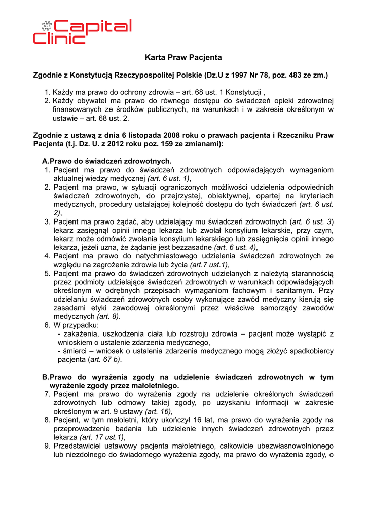 Karta Praw Pacjenta Zgodnie z Konstytucją Rzeczypospolitej Polskie (Dz.U z 1997 Nr 78, poz. 483 ze zm.) 1. Każdy ma prawo do ochrony zdrowia – art. 68 ust. 1 Konstytucji , 2. Każdy obywatel ma prawo do równego dostępu do świadczeń opieki zdrowotnej finansowanych ze środków publicznych, na warunkach i w zakresie określonym w ustawie – art. 68 ust. 2. Zgodnie z ustawą z dnia 6 listopada 2008 roku o prawach pacjenta i Rzeczniku Praw Pacjenta (t.j. Dz. U. z 2012 roku poz. 159 ze zmianami): A.Prawo do świadczeń zdrowotnych. 1. Pacjent ma prawo do świadczeń zdrowotnych odpowiadających wymaganiom aktualnej wiedzy medycznej (art. 6 ust. 1), 2. Pacjent ma prawo, w sytuacji ograniczonych możliwości udzielenia odpowiednich świadczeń zdrowotnych, do przejrzystej, obiektywnej, opartej na kryteriach medycznych, procedury ustalającej kolejność dostępu do tych świadczeń (art. 6 ust. 2), 3. Pacjent ma prawo żądać, aby udzielający mu świadczeń zdrowotnych (art. 6 ust. 3) lekarz zasięgnął opinii innego lekarza lub zwołał konsylium lekarskie, przy czym, lekarz może odmówić zwołania konsylium lekarskiego lub zasięgnięcia opinii innego lekarza, jeżeli uzna, że żądanie jest bezzasadne (art. 6 ust. 4), 4. Pacjent ma prawo do natychmiastowego udzielenia świadczeń zdrowotnych ze względu na zagrożenie zdrowia lub życia (art.7 ust.1), 5. Pacjent ma prawo do świadczeń zdrowotnych udzielanych z należytą starannością przez podmioty udzielające świadczeń zdrowotnych w warunkach odpowiadających określonym w odrębnych przepisach wymaganiom fachowym i sanitarnym. Przy udzielaniu świadczeń zdrowotnych osoby wykonujące zawód medyczny kierują się zasadami etyki zawodowej określonymi przez właściwe samorządy zawodów medycznych (art. 8). 6. W przypadku: - zakażenia, uszkodzenia ciała lub rozstroju zdrowia – pacjent może wystąpić z wnioskiem o ustalenie zdarzenia medycznego, - śmierci – wniosek o ustalenia zdarzenia medycznego mogą złożyć spadkobiercy pacjenta (art. 67 b). B.Prawo do wyrażenia zgody na udzielenie świadczeń zdrowotnych w tym wyrażenie zgody przez małoletniego. 7. Pacjent ma prawo do wyrażenia zgody na udzielenie określonych świadczeń zdrowotnych lub odmowy takiej zgody, po uzyskaniu informacji w zakresie określonym w art. 9 ustawy (art. 16), 8. Pacjent, w tym małoletni, który ukończył 16 lat, ma prawo do wyrażenia zgody na przeprowadzenie badania lub udzielenie innych świadczeń zdrowotnych przez lekarza (art. 17 ust.1), 9. Przedstawiciel ustawowy pacjenta małoletniego, całkowicie ubezwłasnowolnionego lub niezdolnego do świadomego wyrażenia zgody, ma prawo do wyrażenia zgody, o której mowa w art. 17 ust. 1. W przypadku braku przedstawiciela ustawowego prawo to, w odniesieniu do badania, może wykonać opiekun faktyczny (art.17 ust.2), 10.Pacjent małoletni, który ukończył 16 lat, osoba ubezwłasnowolniona albo pacjent chory psychicznie lub upośledzony umysłowo, lecz dysponujący dostatecznym rozeznaniem, ma prawo do wyrażenia sprzeciwu co do udzielenia świadczenia zdrowotnego, pomimo zgody przedstawiciela ustawowego lub opiekuna faktycznego. W takim przypadku wymagane jest zezwolenie sądu opiekuńczego (art. 17 ust.3), 11.Zgoda oraz sprzeciw, o których mowa w art. 17, mogą być wyrażone ustnie albo poprzez takie zachowanie osób wymienionych w tych przepisach, które w sposób niebudzący wątpliwości wskazuje na wolę poddania się proponowanym przez lekarza czynnościom albo brak takiej woli (art. 17 ust. 4). 12.W przypadku zabiegu operacyjnego albo zastosowania metody leczenia lub diagnostyki stwarzających podwyższone ryzyko dla pacjenta, zgodę, o której mowa w art. 17 ust. 1, wyraża się w formie pisemnej. Do wyrażania zgody oraz sprzeciwu stosuje się art. 17 ust. 2 i 3 (art.18 ust. 1), 13.Przed wyrażeniem zgody na zabieg operacyjny albo zastosowania metody leczenia lub diagnostyki stwarzających podwyższone ryzyko dla pacjenta, pacjent ma prawo do uzyskania informacji, o której mowa w art. 9 ust. 2. (art. 18 ust. 2), 14.Zasady przeprowadzenia badania lub udzielenia innych świadczeń zdrowotnych przez lekarza pomimo braku zgody albo wobec zgłoszenia sprzeciwu, o których mowa w art. 17 i 18, określają przepisy art. 33 i art. 34 ust. 6 ustawy z dnia 5 grudnia 1996 r. o zawodach lekarza i lekarza dentysty (art.19). C.Prawo do informacji. 15.Pacjent ma prawo do dostępu do informacji o prawach pacjenta (art.11), 16.Pacjent ma prawo do informacji o swoim stanie zdrowia (art. 9 ust. 1), 17.Pacjent ma prawo do uzyskania od lekarza przystępnej informacji o stanie zdrowia, rozpoznaniu, proponowanych oraz możliwych metodach diagnostycznych i leczniczych, dających się przewidzieć następstwach ich zastosowania albo zaniechania, wynikach leczenia oraz rokowaniu (art. 9 ust. 2), 18.Pacjent ma prawo do wyrażenia zgody na udzielenie informacji, o których mowa w art. 9 ust. 2 innym osobom (art. 9 ust. 3), 19.Pacjent może również żądać aby lekarz nie udzielił mu informacji, o której mowa w art.9 ust. 2 (art. 9 ust. 4), 20.Po uzyskaniu informacji o stanie zdrowia pacjent ma prawo przedstawić lekarzowi swoje zdanie w tym zakresie (art. 9 ust. 5), 21.Pacjent ma prawo do uzyskania informacji o której mowa w art. 9 ust. 2 od lekarza w zakresie i formie potrzebnej do prawidłowego przebiegu procesu diagnostycznego lub terapeutycznego (art. 9 ust.7), 22.Pacjent ma prawo do uzyskania od pielęgniarki informacji o jego pielęgnacji i zabiegach pielęgniarskich (art. 9 ust. 8), 23.Pacjent ma prawo do dostatecznie wczesnej informacji o zamiarze odstąpienia przez lekarza od leczenia pacjenta i wskazania przez tego lekarza możliwości uzyskania świadczenia zdrowotnego u innego lekarza lub podmiotu udzielającego świadczeń zdrowotnych (art. 10), 24.Pacjent ma prawo do informacji o rodzaju i zakresie świadczeń zdrowotnych udzielanych przez podmiot udzielający świadczeń zdr
