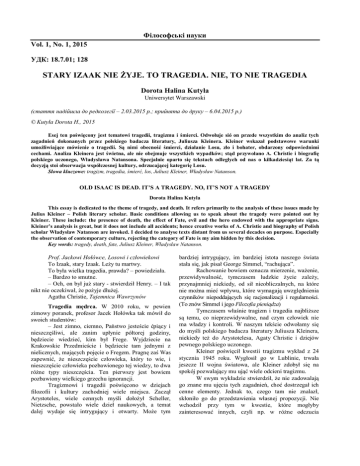 Філософські науки Vol. 1, No. 1, 2015 УДК: 18.7.01; 128 STARY IZAAK NIE ŻYJE. TO TRAGEDIA. NIE, TO NIE TRAGEDIA Dorota Halina Kutyła Uniwersytet Warszawski (стаття надійшла до редколегії – 2.03.2015 р.; прийнята до друку – 6.04.2015 р.) © Kutyła Dorota H., 2015 Esej ten poświęcony jest tematowi tragedii, tragizmu i śmierci. Odwołuje sió on przede wszystkim do analiz tych zagadnień dokonanych przez polskiego badacza literatury, Juliusza Kleinera. Kleiner wskazał podstawowe warunki umożliwiające mówienie o tragedii. Są nimi obecność śmierci, działanie Losu, zło i bohater, obdarzony odpowiednimi cechami. Analiza Kleinera jest świetna, ale nie obejmuje wszystkich wypadków; stąd przywołano A. Christie i biografię polskiego uczonego, Władysława Natansona. Specjalnie oparto się tekstach odległych od nas o kilkadziesiąt lat. Za tą decyzją stoi obserwacja współczesnej kultury, odrzucającej kategorię Losu. Słowa kluczowe: tragizm, tragedia, śmierć, los, Juliusz Kleiner, Władysław Natanson. OLD ISAAC IS DEAD. IT’S A TRAGEDY. NO, IT’S NOT A TRAGEDY Dorota Halina Kutyla This essay is dedicated to the theme of tragedy, and death. It refers primarily to the analysis of these issues made by Julius Kleiner – Polish literary scholar. Basic conditions allowing us to speak about the tragedy were pointed out by Kleiner. These include: the presence of death, the effect of Fate, evil and the hero endowed with the appropriate signs. Kleiner’s analysis is great, but it does not include all accidents; hence creative works of A. Christie and biography of Polish scholar Władysław Natanson are invoked. I decided to analyse texts distant from us several decades on purpose. Especially the observation of contemporary culture, rejecting the category of Fate is my aim hidden by this decision. Key words: tragedy, death, fate, Juliusz Kleiner, Władysław Natanson. Prof. Jackowi Hołówce, Losowi i człowiekowi To Izaak, stary Izaak. Leży tu martwy. To była wielka tragedia, prawda? – powiedziała. – Bardzo to smutne. – Och, on był już stary - stwierdził Henry. – I tak nikt nie oczekiwał, że pożyje dłużej. Agatha Christie, Tajemnica Wawrzynów Tragedia mędrca. W 2010 roku, w pewien zimowy poranek, profesor Jacek Hołówka tak mówił do swoich studentów: – Jest zimno, ciemno, Państwo jesteście ćpiący i nieszczęśliwi, ale zanim upłynie półtorej godziny, będziecie wiedzieć, kim był Frege. Wyjdziecie na Krakowskie Przedmieście i będziecie tam jednymi z nielicznych, mających pojęcie o Fregem. Pragnę zaś Was zapewnić, że nieszczęście człowieka, który to wie, i nieszczęście człowieka pozbawionego tej wiedzy, to dwa różne typy nieszczęścia. Ten pierwszy jest bowiem pozbawiony wielkiego grzechu ignorancji. Tragizmowi i tragedii poświęcono w dziejach filozofii i kultury zachodniej wiele miejsca. Zaczął Arystoteles, wiele cennych myśli dołożył Scheller, Nietzsche, powstało wiele dzieł naukowych, a temat dalej wydaje się intrygujący i otwarty. Może tym bardziej intrygujący, im bardziej istota naszego świata stała się, jak pisał George Simmel, “rachująca”. Rachowanie bowiem oznacza mierzenie, ważenie, przewidywalność, tymczasem ludzkie życie zależy, przynajmniej niekiedy, od sił nieobliczalnych, na które nie można mieć wpływu, które wymagają uwzględnienia czynników niepoddających się racjonalizacji i regularności. (To znów Simmel i jego Filozofia pieniądza) Tymczasem właśnie tragizm i tragedia najbliższe są temu, co nieprzewidywalne, nad czym człowiek nie ma władzy i kontroli. W naszym tekście odwołamy się do myśli polskiego badacza literatury Juliusza Kleinera, niekiedy też do Arystotelesa, Agaty Christie i dziejów pewnego polskiego uczonego. Kleiner poświęcił kwestii tragizmu wykład z 24 stycznia 1945 roku. Wygłosił go w Lublinie, trwała jeszcze II wojna światowa, ale Kleiner zdobył się na spokój pozwalający mu ująć wiele odcieni tragizmu. W swym wykładzie stwierdził, że nie zadowalają go znane mu ujęcia tych zagadnień, choć dostrzegał ich cenne elementy. Jednak to, czego tam nie znalazł, skłoniło go do przedstawienia własnej propozycji. Nie wchodził przy tym w kwestie, które mogłyby zainteresować innych, czyli np. w różne odczucia 72 Dorota Halina Kutyła tragizmu, w to, że prawdopodobnie starożytny Grek nie przejąłby się tragedią Gretchen Goethego. Natomiast zaczął Kleiner, co specjalnie nie dziwi, od Arystotelesa. Wrócił do niego o tyle, że dostrzegł źródła tragizmu nie w stosunku do rzeczywistości doświadczanej przez człowieka, ale w teatrze, w twórczości dramatycznej. Arystoteles nie pozostawił nam wątpliwości, że tak tragedia, jak komedia “narodziły się z improwizacji”, tragedia z dytyrambu, komedia z pieśni fallicznych. W doskonałej, w pełni rozwiniętej wersji, tragedia stała się czymś, co Arystoteles mógł opisać następująco: “Tragedia jest to naśladowcze przedstawienie akcji poważnej, skończonej i posiadającej (odpowiednią) wielkość, wyrażone w języku ozdobnym, …przedstawienie w formie dramatycznej …które przez wzbudzenie litości i trwogi doprowadza do “oczyszczenia” (katharsis) tych uczuć” (Cytaty z Arystotelesa pochodzą z Poetyki) [1]. Z powiązaniem tragiczności z tragedią Kleiner byłby się zgodził, z innymi elementami już nie do końca. W przeciwieństwie do Arystotelesa mówiącego o winie tragicznej, zbłądzeniu (hamartia), Kleiner wprost zmierza do celu i powiada, że: Tragedia jest dramatem śmierci. [DHK – podkr. moje] Uwypuklijmy tę myśl. Mimo historii (wykład odbywa się w I 1945 roku) myśl Kleinera zawieszona jest w jakimś wiecznym teraz, będącym poza czasem i przestrzenią; nie odnosi się wprost do doświadczeń II wojny. Centrum jego myśli ogniskuje się natomiast wokół śmie