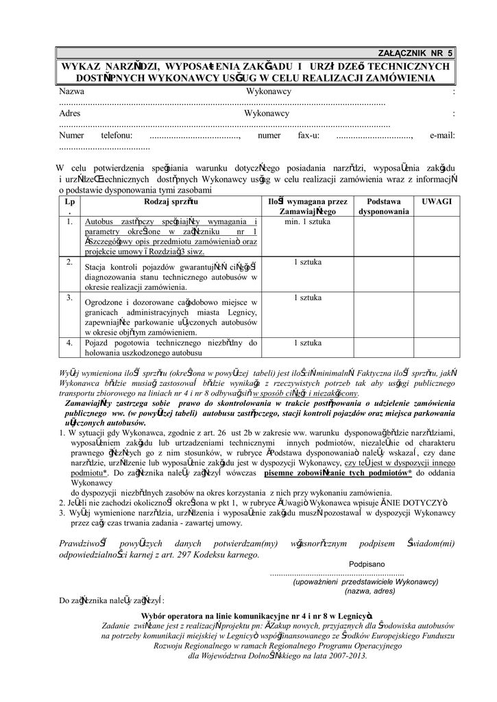 ZAŁĄCZNIK NR 5 WYKAZ NARZĘDZI, WYPOSAŻENIA ZAKŁADU I URZĄDZEŃ TECHNICZNYCH DOSTĘPNYCH WYKONAWCY USŁUG W CELU REALIZACJI ZAMÓWIENIA Nazwa Wykonawcy ........................................................................................................................................ Adres Wykonawcy .......................................................................................................................................... Numer telefonu: ....................................., numer fax-u: ..............................., ...................................... : : e-mail: W celu potwierdzenia spełniania warunku dotyczącego posiadania narzędzi, wyposażenia zakładu i urządzeń technicznych dostępnych Wykonawcy usług w celu realizacji zamówienia wraz z informacją o podstawie dysponowania tymi zasobami Lp . 1. 2. 3. 4. Rodzaj sprzętu Autobus zastępczy spełniający wymagania i parametry określone w załączniku nr 1 „Szczegółowy opis przedmiotu zamówienia” oraz projekcie umowy –Rozdział 3 siwz. Ilość wymagana przez Zamawiającego min. 1 sztuka Podstawa dysponowania UWAGI 1 sztuka Stacja kontroli pojazdów gwarantującą ciągłość diagnozowania stanu technicznego autobusów w okresie realizacji zamówienia. 1 sztuka Ogrodzone i dozorowane całodobowo miejsce w granicach administracyjnych miasta Legnicy, zapewniające parkowanie użyczonych autobusów w okresie objętym zamówieniem. Pojazd pogotowia technicznego niezbędny do holowania uszkodzonego autobusu 1 sztuka Wyżej wymieniona ilość sprzętu (określona w powyższej tabeli) jest ilością minimalną. Faktyczna ilość sprzętu, jaką Wykonawca będzie musiał zastosować będzie wynikała z rzeczywistych potrzeb tak aby usługi publicznego transportu zbiorowego na liniach nr 4 i nr 8 odbywał się w sposób ciągły i niezakłócony. Zamawiający zastrzega sobie prawo do skontrolowania w trakcie postępowania o udzielenie zamówienia publicznego ww. (w powyższej tabeli) autobusu zastępczego, stacji kontroli pojazdów oraz miejsca parkowania użyczonych autobusów. 1. W sytuacji gdy Wykonawca, zgodnie z art. 26 ust 2b w zakresie ww. warunku dysponował będzie narzędziami, wyposażeniem zakładu lub urtzadzeniami technicznymi innych podmiotów, niezależnie od charakteru prawnego łączących go z nim stosunków, w rubryce „Podstawa dysponowania” należy wskazać, czy dane narzędzie, urządzenie lub wyposażenie zakładu jest w dyspozycji Wykonawcy, czy też jest w dyspozycji innego podmiotu*. Do załącznika należy załączyć wówczas pisemne zobowiązanie tych podmiotów* do oddania Wykonawcy do dyspozycji niezbędnych zasobów na okres korzystania z nich przy wykonaniu zamówienia. 2. Jeżeli nie zachodzi okoliczność określona w pkt 1, w rubryce „Uwagi” Wykonawca wpisuje „ NIE DOTYCZY” 3. Wyżej wymienione narzędzia, urządzenia i wyposażenie zakładu muszą pozostawać w dyspozycji Wykonawcy przez cały czas trwania zadania - zawartej umowy. Prawdziwość powyższych danych potwierdzam(my) odpowiedzialności karnej z art. 297 Kodeksu karnego. własnoręcznym podpisem świadom(mi) Podpisano ............................................................. (upoważnieni przedstawiciele Wykonawcy) (nazwa, adres) Do załącznika należy załączyć: Wybór operatora na linie komunikacyjne nr 4 i nr 8 w Legnicy”. Zadanie związane jest z realizacją projektu pn: „Zakup nowych, przyjaznych dla środowiska autobusów na potrzeby komunikacji miejskiej w Legnicy” współfinansowanego ze środków Europejskiego Funduszu Rozwoju Regionalnego w ramach Regionalnego Programu Operacyjnego dla Województwa Dolnośląskiego na lata 2007-2013. informacje o podstawie do dysponowania tymi zasobami (rubryka nr 3) potwierdzone np. oświadczeniem Wykonawcy o własności; oświadczeniem innego podmiotu -właściciela o wynajmie, leasingu, dzierżawie, użyczeniu, udostępnieniu itp.; oryginalnymi zobowiązaniami podmiotów udostępniających Wykonawcy potencjał techniczny zgodnie z art. 26 ust. 2b. ustawy Pzpz o jego udostępnieniu. Wybór operatora na linie komunikacyjne nr 4 i nr 8 w Legnicy”. Zadanie związane jest z realizacją projektu pn: „Zakup nowych, przyjaznych dla środowiska autobusów na potrzeby komunikacji miejskiej w Legnicy” współfinansowanego ze środków Europejskiego Funduszu Rozwoju Regionalnego w ramach Regionalnego Programu Operacyjnego dla Województwa Dolnośląskiego na lata 2007-2013.