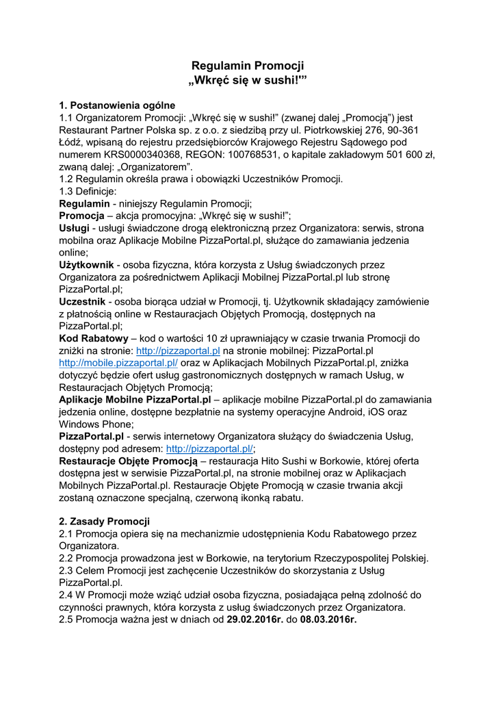 Regulamin Promocji „Wkręć się w sushi!'” 1. Postanowienia ogólne 1.1 Organizatorem Promocji: „Wkręć się w sushi!” (zwanej dalej „Promocją”) jest Restaurant Partner Polska sp. z o.o. z siedzibą przy ul. Piotrkowskiej 276, 90-361 Łódź, wpisaną do rejestru przedsiębiorców Krajowego Rejestru Sądowego pod numerem KRS0000340368, REGON: 100768531, o kapitale zakładowym 501 600 zł, zwaną dalej: „Organizatorem”. 1.2 Regulamin określa prawa i obowiązki Uczestników Promocji. 1.3 Definicje: Regulamin - niniejszy Regulamin Promocji; Promocja – akcja promocyjna: „Wkręć się w sushi!”; Usługi - usługi świadczone drogą elektroniczną przez Organizatora: serwis, strona mobilna oraz Aplikacje Mobilne PizzaPortal.pl, służące do zamawiania jedzenia online; Użytkownik - osoba fizyczna, która korzysta z Usług świadczonych przez Organizatora za pośrednictwem Aplikacji Mobilnej PizzaPortal.pl lub stronę PizzaPortal.pl; Uczestnik - osoba biorąca udział w Promocji, tj. Użytkownik składający zamówienie z płatnością online w Restauracjach Objętych Promocją, dostępnych na PizzaPortal.pl; Kod Rabatowy – kod o wartości 10 zł uprawniający w czasie trwania Promocji do zniżki na stronie: http://pizzaportal.pl na stronie mobilnej: PizzaPortal.pl http://mobile.pizzaportal.pl/ oraz w Aplikacjach Mobilnych PizzaPortal.pl, zniżka dotyczyć będzie ofert usług gastronomicznych dostępnych w ramach Usług, w Restauracjach Objętych Promocją; Aplikacje Mobilne PizzaPortal.pl – aplikacje mobilne PizzaPortal.pl do zamawiania jedzenia online, dostępne bezpłatnie na systemy operacyjne Android, iOS oraz Windows Phone; PizzaPortal.pl - serwis internetowy Organizatora służący do świadczenia Usług, dostępny pod adresem: http://pizzaportal.pl/; Restauracje Objęte Promocją – restauracja Hito Sushi w Borkowie, której oferta dostępna jest w serwisie PizzaPortal.pl, na stronie mobilnej oraz w Aplikacjach Mobilnych PizzaPortal.pl. Restauracje Objęte Promocją w czasie trwania akcji zostaną oznaczone specjalną, czerwoną ikonką rabatu. 2. Zasady Promocji 2.1 Promocja opiera się na mechanizmie udostępnienia Kodu Rabatowego przez Organizatora. 2.2 Promocja prowadzona jest w Borkowie, na terytorium Rzeczypospolitej Polskiej. 2.3 Celem Promocji jest zachęcenie Uczestników do skorzystania z Usług PizzaPortal.pl. 2.4 W Promocji może wziąć udział osoba fizyczna, posiadająca pełną zdolność do czynności prawnych, która korzysta z usług świadczonych przez Organizatora. 2.5 Promocja ważna jest w dniach od 29.02.2016r. do 08.03.2016r. 2.6 Kod Rabatowy, który otrzyma Uczestnik Promocji, będzie upoważniał do zniżki w wysokości 10 zł przy dokonaniu zamówienia jedzenia za min. 30 zł z Restauracji Objętych Promocją, oferujących płatność online na stronie: http://pizzaportal.pl, na stronie mobilnej PizzaPortal.pl: http://mobile.pizzaportal.pl/ oraz w Aplikacjach Mobilnych PizzaPortal.pl, w wyżej wymienionym okresie. 2.7 Jedna osoba może skorzystać z Kodu Rabatowego tylko raz, podczas składania jednego zamówienia. 2.8 Kod Rabatowy jest dostępny na stronie internetowej: http://pizzaportal.pl/borkowo/ w czasie trwania akcji. 2.9 Aby wziąć udział w Promocji należy w okresie jej trwania: a) na stronie PizzaPortal.pl lub w Aplikacji Mobilnej PizzaPortal.pl, lub na stronie mobilnej złożyć zamówienie jedzenia o wartości min. 30 zł, w Restauracjach Objętych Promocją, dostępnych na PizzaPortal.pl, oznaczonych specjalną, czerwoną ikonką rabatu. b) po wprowadzaniu adresu dostawy i wyborze Restauracji Objętej Promocją, oznaczoną specjalną, czerwoną ikonką rabatu, należy wprowadzić Kod Rabatowy. c) wartość zamówienia zostanie pomniejszona o 10 zł, d) pozostałą różnicę należy dopłacić płatnością online. 2.10 Treść Kodu Rabatowego należy wpisać w pole „kod promocyjny”, instrukcja użycia Kodu Rabatowego jest dostępna na: http://blog.pizzaportal.pl/wpcontent/uploads/2015/02/pp_obsluga_androida_manual.png, http://blog.pizzaportal.pl/wp-content/uploads/2015/02/pp_obsluga_ios_manual.png, http://blog.pizzaportal.pl/wpcontent/uploads/2015/02/nokia_lumia_kod_rabatowy_manual.png. 2.11 Kod Rabatowy zadziała tylko po wpisaniu go w pole „kod promocyjny”. Kod Rabatowy wpisany w pole „wiadomość”, w którym podaje się dodatkowe informacje dla restauracji, nie będzie aktywny, suma zamówienia nie pomniejszy się o jego wartość. Restauracja ani Organizator nie uznają ważności takiego Kodu. 2.12 Kody Rabatowe nie podlegają wymianie na gotówkę. 2.13 Kodu Rabatowego nie można zrealizować bezpośrednio w Restauracjach Objętych Promocją. 2.14 Po upływie terminu ważności Kodu Rabatowego, nie będzie on przedłużany lub zamieniany na ekwiwalent pieniężny. 2.15 Promocja nie łączy się z innymi promocjami oraz rabatami na PizzaPortal.pl. 2.16 Przystąpienie do Promocji jest równoznaczne z akceptacją Regulaminu. 2.17 Promocja jest skierowana wyłącznie do Użytkowników PizzaPortal.pl. Restauratorzy współpracujący z Organizatorem w ramach PizzaPortal.pl, pracownicy restauracji współpracujących z Organizatorem w ramach PizzaPortal.pl oraz współpracownicy Organizatora nie mogą brać udziału w Promocji. 2.18 Wykorzystanie Kodów Rabatowych podlega weryfikacji przez Organizatora, w celu wykrycia ewentualnych nadużyć lub naruszeń Regulaminu. 2.19 Przystąpienie do Promocji jest równoznaczne z akceptacją Regulaminu. 2.20 Pełny regulamin Kodów Rabatowych na PizzaPortal.pl jest dostępny na stronie: http://pizzaportal.pl/voucher-policy/. 3. Postanowienia końcowe 3.1 Reklamacje dotyczące Promocji można zgłaszać mailowo na prowadzony w tym celu przez Organizatora adres: [email protected], w tytule maila należy wpisać: „Wkręć się w sushi!”. 3.2 Reklamacje rozpatrywane będą niezwłocznie, jednakże w terminie nie dłuższym niż 14 dni od ich otrzymania przez Or