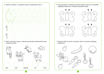 4. Napisz po śladzie, a następnie poćwicz zapisywanie cyfry 1. 6. Dorysuj każdemu motylowi po jednej ozdobie, tak by ich skrzydełka wyglądały identycznie. Pokoloruj wszystkie motyle. 5. Policz zwierzęta i wpisz w okienka pod spodem odpowiednie liczby. Pokoloruj rysunki. 7. Pokoloruj tylko te owoce i warzywa, które na rysunku występują pojedynczo. ryba pies papuga 4 kot mysz 5 1. Pokoloruj rysunek zgodnie z oznaczeniami. Jaka to cyfra? niebieski zielony 3. Pokoloruj rysunek. żółty 2. Przeczytaj wierszyk i wklej naklejkę z cyfrą, która się w nim pojawia. Odwiedziło ten zakątek małe stadko: sześć kaczątek, by wykąpać się w kałuży, bo pływanie kaczkom służy. Dwie się chlapią, obok czwórka suszy sobie kacze piórka. Zakwakało dziobów sześć: – Gospodyni, daj nam jeść! 26 27