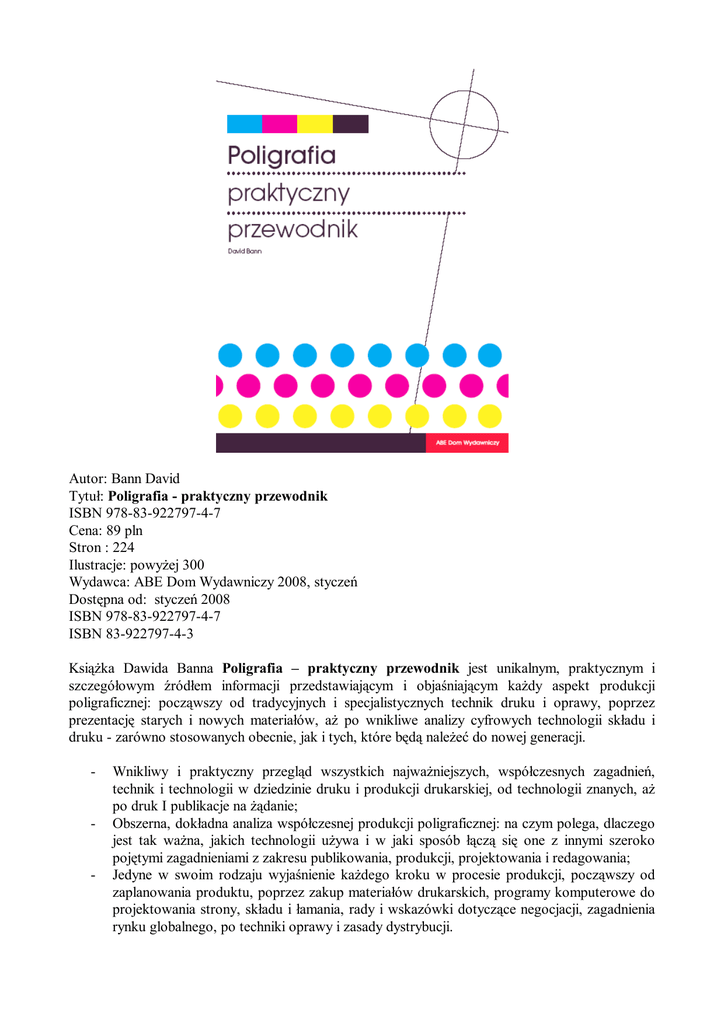 Autor: Bann David Tytuł: Poligrafia - praktyczny przewodnik ISBN 978-83-922797-4-7 Cena: 89 pln Stron : 224 Ilustracje: powyżej 300 Wydawca: ABE Dom Wydawniczy 2008, styczeń Dostępna od: styczeń 2008 ISBN 978-83-922797-4-7 ISBN 83-922797-4-3 Książka Dawida Banna Poligrafia – praktyczny przewodnik jest unikalnym, praktycznym i szczegółowym źródłem informacji przedstawiającym i objaśniającym każdy aspekt produkcji poligraficznej: począwszy od tradycyjnych i specjalistycznych technik druku i oprawy, poprzez prezentację starych i nowych materiałów, aż po wnikliwe analizy cyfrowych technologii składu i druku - zarówno stosowanych obecnie, jak i tych, które będą należeć do nowej generacji. - - - Wnikliwy i praktyczny przegląd wszystkich najważniejszych, współczesnych zagadnień, technik i technologii w dziedzinie druku i produkcji drukarskiej, od technologii znanych, aż po druk I publikacje na żądanie; Obszerna, dokładna analiza współczesnej produkcji poligraficznej: na czym polega, dlaczego jest tak ważna, jakich technologii używa i w jaki sposób łączą się one z innymi szeroko pojętymi zagadnieniami z zakresu publikowania, produkcji, projektowania i redagowania; Jedyne w swoim rodzaju wyjaśnienie każdego kroku w procesie produkcji, począwszy od zaplanowania produktu, poprzez zakup materiałów drukarskich, programy komputerowe do projektowania strony, składu i łamania, rady i wskazówki dotyczące negocjacji, zagadnienia rynku globalnego, po techniki oprawy i zasady dystrybucji. Spis treści Wstęp Poligrafia w XXI wieku Rys historyczny Druk na żądanie Nowe media Poligrafia a ochrona środowiska Przygotowanie do druku Przebieg produkcji poligraficznej Podstawy edytorstwa Ilustracje w poligrafii Obrazy półtonowe Teoria koloru i separacja koloru Zarządzanie kolorem Skanowanie Skład tekstu Kroje pisma i fonty Aplikacje i zestawy designerskie Komputery i urządzenia peryferyjne Formaty zapisu plików Korekta i przygotowanie płyt Wymiana plików Rodzaje odbitek próbnych Analiza kolorowych odbitek próbnych Kontrola koloru w druku Impozycja i przygotowanie płyt Metoda CTP Integracja technologii CTP i PDF Płyty drukowe dla pozostałych technik druku Techniki druku Wprowadzenie do procesów drukarskich Litografia offsetowa Druk cyfrowy Grawiura Sitodruk Typografia Inne procesy Papier i farba Papier i farba Jak powstaje papier? Rodzaje papieru Parametry techniczne i wymiarowe papieru Potencjalne wady papieru Papier a ochrona środowiska Farby i tonery Prace wykończeniowe Prace wykończeniowe Złamywanie Rodzaje opraw i materiały Inne metody wykończeniowe Stemplowanie i nadruki Pakowanie i dystrybucja Współpraca z drukarnią Wybór drukarni Międzynarodowi dostawcy Specyfikacje Kontrola jakości Harmonogram i składanie zamówień Podstawy prawne działania Zakończenie Słownik poligraficzny Międzynarodowe formaty papieru Inne miary papieru Tabele konwersji Wybrana bibliografia i źródła ilustracji Skorowidz Podziękowania od autora ( fragment wstępu ) We wstępie do pierwszego wydania tej książki (z 1986 r.) zaznaczyłem, że pomimo lawinowego rozwoju mediów elektronicznych, drukarstwo długo jeszcze pozostanie wiodącym narzędziem środków masowego przekazu. Dziś, dwadzieścia lat po ukazaniu się owego podręcznika, nadal macie przed sobą tekst wydrukowany na papierze, nie zaś dostępny w postaci informacji czy książki elektronicznej. Co sprawia, że drukarstwo utrzymuje się w tak dobrej kondycji, zamiast powędrować na śmietnik historii? Powodów jest wiele. Książki, magazyny, plakaty, gazety codzienne, broszury, ulotki i inne materiały wydrukowane mają swoje zalety: nie wymagają specjalnych urządzeń, aby się z nimi zapoznać; nie ulegają awariom; łatwo je przenosić z miejsca na miejsce, a także utylizować. Miłośnicy tradycyjnych, papierowych książek i gazet docenią to, że mogą je zabrać ze sobą i przeczytać w dowolnym miejscu, a także bez trudu powrócić do przeczytanych już fragmentów. Także reklamodawcy inwestują w oferowanie swoich produktów i usług za pośrednictwem materiałów dostępnych drukiem, bo tych nie sposób wyłączyć czy zablokować tak, jak blokuje się niektóre reklamy internetowe. Paradoksalnie, ani rozwój telewizji, ani rosnąca popularność i dostęp do globalnej sieci nie tylko nie wyparły drukarstwa jako dziedziny przestarzałej, ale nawet przyczyniły się do jego rozwoju. Dzięki Internetowi znacznie wzrosła sprzedaż „zwykłych”, papierowych książek, plakatów i magazynów z całego świata. Popularność telewizji stworzyła zapotrzebowanie na niezliczone tomy na temat programów, seriali, filmów i bohaterów szklanego ekranu. Inne dziedziny, w których drukarstwo znajduje zastosowanie bronią się same: ulice dekorują potężne drukowane reklamy, a najrozmaitsze produkty, które kupujemy, dostępne są w coraz to bardziej urozmaiconych opakowaniach – małych arcydziełach drukarstwa użytkowego... David Bann Rys historyczny ( fragment rozdziału ) Drukarstwo rozwijało się w sposób nieregularny. W historii tej dziedziny zapisały się zarówno długie wieki zastoju, jak i krótkotrwałe być może, ale bardzo owocne okresy gwałtownego postępu. Do takich momentów zwrotnych należały, między innymi, wytłoczenie sławnej Biblii Gutenberga z 1456 r. i lawinowy wzrost liczby warsztatów drukarskich około roku 1850. Historia drukarstwa zaczyna się w Chinach i sięga VI w. Wtedy właśnie, na fali technologicznego postępu, odkryto możliwość drukowania za pomocą drewnianych klocków, na których techniką drzeworytu wycinano lustrzane odbicie tekstu lub ilustracji. Najstarsza spośród znanych książek wydanych drukiem – Sutra Diamentowa – powstała w 868 r. Zdobycze chińskiej wynalazczości były stale udoskonalane. W XI w. dzięki wynalazcy nazwiskiem Pi Sheng można już było drukować za pomocą odrębnych czcionek wykon