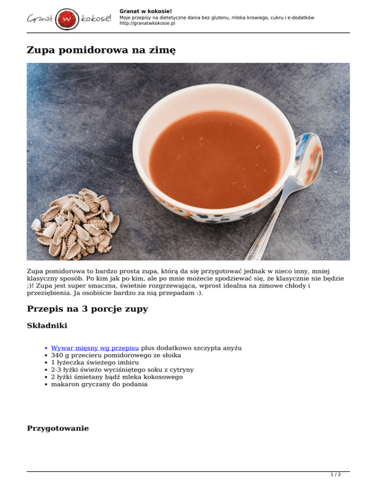 Granat w kokosie! Moje przepisy na dietetyczne dania bez glutenu, mleka krowiego, cukru i e-dodatków http://granatwkokosie.pl Zupa pomidorowa na zimę Zupa pomidorowa to bardzo prosta zupa, którą da się przygotować jednak w nieco inny, mniej klasyczny sposób. Po kim jak po kim, ale po mnie możecie spodziewać się, że klasycznie nie będzie ;)! Zupa jest super smaczna, świetnie rozgrzewająca, wprost idealna na zimowe chłody i przeziębienia. Ja osobiście bardzo za nią przepadam :). Przepis na 3 porcje zupy Składniki Wywar mięsny wg przepisu plus dodatkowo szczypta anyżu 340 g przecieru pomidorowego ze słoika 1 łyżeczka świeżego imbiru 2-3 łyżki świeżo wyciśniętego soku z cytryny 2 łyżki śmietany bądź mleka kokosowego makaron gryczany do podania Przygotowanie 1/2 Granat w kokosie! Moje przepisy na dietetyczne dania bez glutenu, mleka krowiego, cukru i e-dodatków http://granatwkokosie.pl 1. Wywar przygotowujemy wg przepisu z dodatkiem szczypty anyżu. 2. Kiedy wywar będzie gotowy, na tarce o drobnych oczkach ścieramy imbir i dodajemy do zupy. 3. Następnie dodajemy przecier pomidorowy i sok z cytryny. 4. Na sam koniec dodajemy mleko bądź śmietankę kokosową. 5. Wszystko jeszcze chwilkę gotujemy. 6. W razie potrzeby dodajemy soli i pieprzu do smaku. 7. Podajemy z ugotowanym w dowolny sposób (na miękko lub al dente) makaronem gryczanym. Może się przydać Makaron gryczany kupuję najczęściej w sklepie DrPelca. Imbir to mocna i specyficzna przyprawa, dlatego w zależności od tego jak bardzo za nią przepadacie, dodajcie tyle, aby nie zdominowała smaku Waszej zupy :). Szczypta anyżu nadaje wywarowi niezwykłego, delikatnego smaku, więc nie rezygnujcie z niego. Sok z cytryny to też Wasza inicjatywa. Ja lubię kwaśną zupę pomidorową. Jeśli Wy za taką nie przepadacie, dodajcie mniej soku. To co, życzę dużo zdrowia i nie zapominajcie o naturalnych sposobach na zimowe przeziębienia ;). 2/2 Powered by TCPDF (www.tcpdf.org)