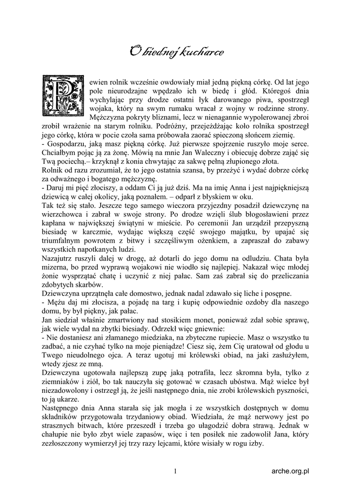 O biednej kucharce ewien rolnik wcześnie owdowiały miał jedną piękną córkę. Od lat jego pole nieurodzajne wpędzało ich w biedę i głód. Któregoś dnia wychylając przy drodze ostatni łyk darowanego piwa, spostrzegł wojaka, który na swym rumaku wracał z wojny w rodzinne strony. Mężczyzna pokryty bliznami, lecz w nienagannie wypolerowanej zbroi zrobił wrażenie na starym rolniku. Podróżny, przejeżdżając koło rolnika spostrzegł jego córkę, która w pocie czoła sama próbowała zaorać spieczoną słońcem ziemię. - Gospodarzu, jaką masz piękną córkę. Już pierwsze spojrzenie ruszyło moje serce. Chciałbym pojąc ją za żonę. Mówią na mnie Jan Waleczny i obiecuję dobrze zająć się Twą pociechą.– krzyknął z konia chwytając za sakwę pełną złupionego złota. Rolnik od razu zrozumiał, że to jego ostatnia szansa, by przeżyć i wydać dobrze córkę za odważnego i bogatego mężczyznę. - Daruj mi pięć złociszy, a oddam Ci ją już dziś. Ma na imię Anna i jest najpiękniejszą dziewicą w całej okolicy, jaką poznałem. – odparł z błyskiem w oku. Tak też się stało. Jeszcze tego samego wieczora przyjezdny posadził dziewczynę na wierzchowca i zabrał w swoje strony. Po drodze wzięli ślub błogosławieni przez kapłana w największej świątyni w mieście. Po ceremonii Jan urządził przepyszną biesiadę w karczmie, wydając większą część swojego majątku, by upajać się triumfalnym powrotem z bitwy i szczęśliwym ożenkiem, a zapraszał do zabawy wszystkich napotkanych ludzi. Nazajutrz ruszyli dalej w drogę, aż dotarli do jego domu na odludziu. Chata była mizerna, bo przed wyprawą wojakowi nie wiodło się najlepiej. Nakazał więc młodej żonie wysprzątać chatę i uczynić z niej pałac. Sam zaś zabrał się do przeliczania zdobytych skarbów. Dziewczyna uprzątnęła całe domostwo, jednak nadal zdawało się liche i posępne. - Mężu daj mi złocisza, a pojadę na targ i kupię odpowiednie ozdoby dla naszego domu, by był piękny, jak pałac. Jan siedział właśnie zmartwiony nad stosikiem monet, ponieważ zdał sobie sprawę, jak wiele wydał na zbytki biesiady. Odrzekł więc gniewnie: - Nie dostaniesz ani złamanego miedziaka, na zbyteczne rupiecie. Masz o wszystko tu zadbać, a nie czyhać tylko na moje pieniądze! Ciesz się, żem Cię uratował od głodu u Twego nieudolnego ojca. A teraz ugotuj mi królewski obiad, na jaki zasłużyłem, wtedy zjesz ze mną. Dziewczyna ugotowała najlepszą zupę jaką potrafiła, lecz skromna była, tylko z ziemniaków i ziół, bo tak nauczyła się gotować w czasach ubóstwa. Mąż wielce był niezadowolony i ostrzegł ją, że jeśli następnego dnia, nie zrobi królewskich pyszności, to ją ukarze. Następnego dnia Anna starała się jak mogła i ze wszystkich dostępnych w domu składników przygotowała trzydaniowy obiad. Wiedziała, że mąż nerwowy jest po strasznych bitwach, które przeszedł i trzeba go ułagodzić dobra strawą. Jednak w chałupie nie było zbyt wiele zapasów, więc i ten posiłek nie zadowolił Jana, który zezłoszczony wymierzył jej trzy razy lejcami, które wisiały w rogu izby. 1 arche.org.pl - Spójrz na te lejce i zapamiętaj sobie do czego będą służyć, kiedy nie będziesz dobrze gotować! Kolejnego południa Anna poprosiła męża o złocisza, by pójść na targ i kupić odpowiednie dla niego jedzenie. Jan jednak znów siedząc i licząc swoje złocisze odparł, że nie da złamanego miedziaka, a żona sama powinna uprawiać ziemię i hodować zwierzęta, by wykarmić męża. Wygonił ją z chałupy i kazał nie wracać, aż nie przyniesie porządnego jadła. Dziewczyna obeszła więc pole i las, zbierając co tylko jadalne. Jako że w domu nauczona była, jak przetrwać w biedzie, uzbierała całkiem sporo jadalnych roślin, a nawet udało jej się złapać rannego ptaka, z którego postanowiła ugotować potrawkę. - Wiem żeś ranny i biedny, ale co ja mam biedna począć, gdy boję się mego męża drobny ptaszku. – powiedziała do niego i ze łzami w oczach ukręciła mu głowę. Pod wieczór potrawa była gotowa, jednak w domu zabrakło soli, toteż Jan uniósł się i wymierzył kolejne razy rzemiennymi lejcami. Rano Anna obudziła się zbolała i struchlała ze strachu przed kolejnym dniem w fartuchu kucharki. Od razu zalała się łzami i rozpaczała nad swoim losem. Wielkie krople płynęły jej po policzkach, a jedna spłynęła do ust. Dziewczyna poczuła słony smak. - Ah! Co za pomysł! – krzyknęła do siebie i podstawiła pod twarz rondelek, do którego spływały łzy. Tak długo myślała o swoim losie, aż rondelek łzami się napełnił. Na tej słonej wodzie ugotuję bulion – pomyślała. Tego dnia Jan był spokojny i pochwalił nawet swoją żonę za pyszną potrawkę z delikatnego ptasiego mięsa. Kolejny dzień przyniósł młodej żonie inne jednak zmartwienie. Okazało się, że zgubiła ostatnie krzesiwo i nie miała jak napalić w piecu i gotować. Z drżeniem poszła do męża poprosiła o kilak miedziaków na porządne krzesiwo, które kupi w sąsiedniej wsi. Jan oglądał właśnie ze wszystkich stron wielką złota monetę i obracał ją z satysfakcją w palcach. Jedno tylko srogie na nią spojrzenie sprawiło, że wybiegła z domu, by nie poczuć woni wilgotnych rzemieni. Przestraszona biegła co sił, aż potknęła się o kamień i boleśnie upadła tuż przy drodze. - Durny kamień! – krzyknęła – jesteś tak głupi jak mój mąż! – pochwyciła w obie ręce kamień i z całą złością, która w niej zawrzała uderzała nim o drugi leżący kamień. Tłukła nim krzycząc tak zapamiętale, że w pewnym momencie spomiędzy kamieni wylatywać zaczęły iskry, od których zajęła się kępka suchej trawy. Dziewczyna z niedowierzaniem, ale i ulgą patrzała na powstający płomień. Po chwili uspokoiła się, zabrała płonące źdźbła i pobiegła do domu, by rozpalić