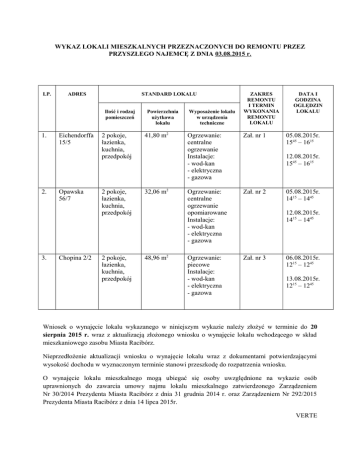 WYKAZ LOKALI MIESZKALNYCH PRZEZNACZONYCH DO REMONTU PRZEZ PRZYSZŁEGO NAJEMCĘ Z DNIA 03.08.2015 r. LP. ADRES STANDARD LOKALU Ilość i rodzaj pomieszczeń 1. 2. 3. Eichendorffa 15/5 Opawska 56/7 Chopina 2/2 Powierzchnia użytkowa lokalu 2 pokoje, łazienka, kuchnia, przedpokój 41,80 m2 2 pokoje, łazienka, kuchnia, przedpokój 32,06 m2 2 pokoje, łazienka, kuchnia, przedpokój 48,96 m2 Wyposażenie lokalu w urządzenia techniczne ZAKRES REMONTU I TERMIN WYKONANIA REMONTU LOKALU Ogrzewanie: centralne ogrzewanie Instalacje: - wod-kan - elektryczna - gazowa Zał. nr 1 Ogrzewanie: centralne ogrzewanie opomiarowane Instalacje: - wod-kan - elektryczna - gazowa Zał. nr 2 Ogrzewanie: piecowe Instalacje: - wod-kan - elektryczna - gazowa Zał. nr 3 DATA I GODZINA OGLĘDZIN LOKALU 05.08.2015r. 1545 – 1615 12.08.2015r. 1545 – 1615 05.08.2015r. 1415 – 1445 12.08.2015r. 1415 – 1445 06.08.2015r. 1215 – 1245 13.08.2015r. 1215 – 1245 Wniosek o wynajęcie lokalu wykazanego w niniejszym wykazie należy złożyć w terminie do 20 sierpnia 2015 r. wraz z aktualizacją złożonego wniosku o wynajęcie lokalu wchodzącego w skład mieszkaniowego zasobu Miasta Racibórz. Nieprzedłożenie aktualizacji wniosku o wynajęcie lokalu wraz z dokumentami potwierdzającymi wysokość dochodu w wyznaczonym terminie stanowi przeszkodę do rozpatrzenia wniosku. O wynajęcie lokalu mieszkalnego mogą ubiegać się osoby uwzględnione na wykazie osób uprawnionych do zawarcia umowy najmu lokalu mieszkalnego zatwierdzonego Zarządzeniem Nr 30/2014 Prezydenta Miasta Racibórz z dnia 31 grudnia 2014 r. oraz Zarządzeniem Nr 292/2015 Prezydenta Miasta Racibórz z dnia 14 lipca 2015r. VERTE Wniosek, o którym mowa powyżej może zostać złożony na maksymalnie dwa lokale (należy wskazać kolejność). W przypadku złożenia przez gospodarstwo domowe jednoosobowe wniosku o wynajęcie lokalu większego niż lokal jednopokojowy, wnioski te pozostaną rozpatrzone negatywnie. W przypadku wpływu większej ilości wniosków o wynajęcie wskazanego lokalu mieszkalnego, zgoda na zawarcie umowy najmu lokalu mieszkalnego zostanie wyrażona osobie, która zajmuje najwyższe miejsce na wykazie osób uprawnionych do zawarcia umowy najmu lokalu mieszkalnego w 2015 r. i spełnia kryteria określone w Uchwale Nr XLIII/619/2014 Rady Miasta Racibórz z dnia 24 września 2014 r. w sprawie zasad wynajmowania lokali wchodzących w skład mieszkaniowego zasobu Gminy Miasta Racibórz. Wynik rozstrzygnięcia złożonych wniosków o wynajęcie lokalu mieszkalnego zostanie podany do publicznej wiadomości w dniu 27 sierpnia 2015 r. poprzez ogłoszenie na tablicach ogłoszeń Urzędu Miasta Racibórz oraz w Biuletynie Informacji Publicznej. wz. Prezydenta Miasta Wojciech Krzyżek Zastępca Prezydenta