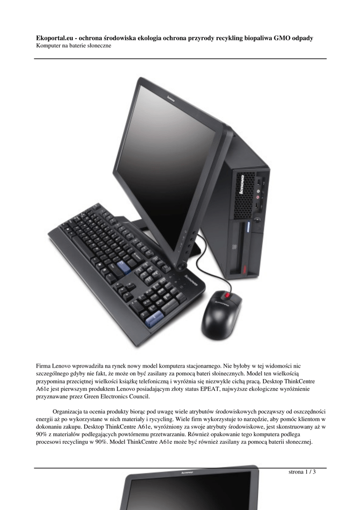 Ekoportal.eu - ochrona środowiska ekologia ochrona przyrody recykling biopaliwa GMO odpady Komputer na baterie słoneczne Firma Lenovo wprowadziła na rynek nowy model komputera stacjonarnego. Nie byłoby w tej widomości nic szczególnego gdyby nie fakt, że może on być zasilany za pomocą bateri słoinecznych. Model ten wielkością przypomina przeciętnej wielkości książkę telefoniczną i wyróżnia się niezwykle cichą pracą. Desktop ThinkCentre A61e jest pierwszym produktem Lenovo posiadającym złoty status EPEAT, najwyższe ekologiczne wyróżnienie przyznawane przez Green Electronics Council. Organizacja ta ocenia produkty biorąc pod uwagę wiele atrybutów środowiskowych począwszy od oszczędności energii aż po wykorzystane w nich materiały i rycycling. Wiele firm wykorzystuje to narzędzie, aby pomóc klientom w dokonaniu zakupu. Desktop ThinkCentre A61e, wyróżniony za swoje atrybuty środowiskowe, jest skonstruowany aż w 90% z materiałów podlegających powtórnemu przetwarzaniu. Również opakowanie tego komputera podlega procesowi recyclingu w 90%. Model ThinkCentre A61e może być również zasilany za pomocą baterii słonecznej. strona 1 / 3 Ekoportal.eu - ochrona środowiska ekologia ochrona przyrody recykling biopaliwa GMO odpady Komputer na baterie słoneczne Nowy desktop Lenovo dzięki 85% efektywnemu źródłu zasilania przewyższa wymagania amerykańskiej normy Energy Star 4.0 ustanowionej przez Environmental Protection Agency (EPA). Będąc pierwszym desktopem na rynku wykorzystującym energooszczędne procesory dwurdzeniowe AMD Athlon 64 X2 lub jednordzeniowe procesory AMD Sempron, komputer pozwala użytkownikom zaoszczędzić aż do 50% kosztów zużycia energii rocznie w porównaniu z poprzednimi modelami. Według danych pochodzących z rynku amerykańskiego, użytkownik tego desktopa mógłby zaoszczędzić rocznie ponad $20 kosztów zużycia energii i ograniczyć emisję dwutlenku węgla o ilość porównywalną do tej, która jest emitowana do atmosfery podczas dwóch powrotnych lotów z Bostonu do Nowego Jorku. Klient wykorzystujący zaledwie 50 desktopów ThinkCentre A61e mógłby zaoszczędzić ponad $1,000 rocznie i to tylko z tytułu kosztów zużycia energii. Natomiast duże przedsiębiorstwo wykorzystujące 50,000 takich desktopów mogłoby wygenerować ponad $1 milion oszczędności z tytułu rocznych kosztów zużycia energii i ograniczyć emisję dwutlenku węgla o ponad 9000 ton. - Maksymalnie efektywne wykorzystanie energii i świadomość proekologiczna dotyczy wszystkich aspektów naszego życia począwszy od żarówek, których używamy w naszych domach przez samochody hybrydowe aż po przyjazne środowisku technologie, które wykorzystujemy w naszej działalności biznesowej. Lenovo koncentruje się na dostarczaniu produktów przyjaznych środowisku, wykorzystujących energooszczędne technologie a desktop ThinkCentre A61e wyraźnie to potwierdza - powiedział Marek Borówka, Dyrektor Generalny Lenovo Technology Polska. Z uwagi na rosnące ceny energii, coraz ważniejsze staje się identyfikowanie sposobów kontrolowania tych zmiennych kosztów poprzez stosowanie bardziej wydajnej technologii. - Firmy Lenovo i AMD podjęły wspólne działania, aby zapewnić klientom najbezpieczniejsze, innowacyjne i najbardziej energooszczędne rozwiązanie, które pomoże im najlepiej zaspokoić potrzeby biznesowe użytkowników powiedział Greg White, Vice Prezes i Dyrektor Generalny ds. korporacyjnych, Dział Desktopów, AMD strona 2 / 3 Ekoportal.eu - ochrona środowiska ekologia ochrona przyrody recykling biopaliwa GMO odpady Komputer na baterie słoneczne (NYSE:AMD). - Desktop Lenovo ThinkCentre A61e stanowi kamień milowy we współpracy obydwu firm, które ustanawiają nowy poziom zarówno we wzornictwie komputerów, jak i energooszczędności - dodał. Źródło: Lenovo Polska strona 3 / 3