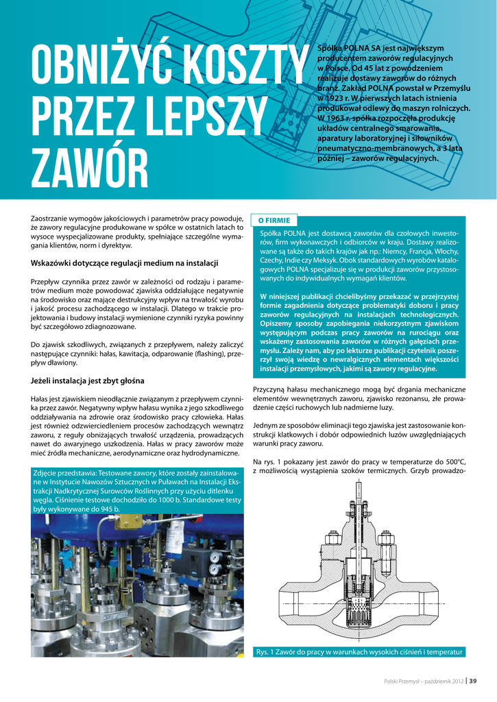 oBniżyć koszty przez lepszy zawór Zaostrzanie wymogów jakościowych i parametrów pracy powoduje, że zawory regulacyjne produkowane w spółce w ostatnich latach to wysoce wyspecjalizowane produkty, spełniające szczególne wymagania klientów, norm i dyrektyw. Wskazówki dotyczące regulacji medium na instalacji Przepływ czynnika przez zawór w zależności od rodzaju i parametrów medium może powodować zjawiska oddziałujące negatywnie na środowisko oraz mające destrukcyjny wpływ na trwałość wyrobu i jakość procesu zachodzącego w instalacji. Dlatego w trakcie projektowania i budowy instalacji wymienione czynniki ryzyka powinny być szczegółowo zdiagnozowane. Do zjawisk szkodliwych, związanych z przepływem, należy zaliczyć następujące czynniki: hałas, kawitacja, odparowanie (flashing), przepływ dławiony. Jeżeli instalacja jest zbyt głośna Hałas jest zjawiskiem nieodłącznie związanym z przepływem czynnika przez zawór. Negatywny wpływ hałasu wynika z jego szkodliwego oddziaływania na zdrowie oraz środowisko pracy człowieka. Hałas jest również odzwierciedleniem procesów zachodzących wewnątrz zaworu, z reguły obniżających trwałość urządzenia, prowadzących nawet do awaryjnego uszkodzenia. Hałas w pracy zaworów może mieć źródła mechaniczne, aerodynamiczne oraz hydrodynamiczne. Zdjęcie przedstawia: Testowane zawory, które zostały zainstalowane w Instytucie Nawozów Sztucznych w Puławach na Instalacji Ekstrakcji Nadkrytycznej Surowców Roślinnych przy użyciu ditlenku węgla. Ciśnienie testowe dochodziło do 1000 b. Standardowe testy były wykonywane do 945 b. Spółka POLNA SA jest największym producentem zaworów regulacyjnych w Polsce. Od 45 lat z powodzeniem realizuje dostawy zaworów do różnych branż. Zakład POLNA powstał w Przemyślu w 1923 r. W pierwszych latach istnienia produkował odlewy do maszyn rolniczych. W 1963 r. spółka rozpoczęła produkcję układów centralnego smarowania, aparatury laboratoryjnej i siłowników pneumatyczno-membranowych, a 3 lata później – zaworów regulacyjnych. O firmie Spółka POLNA jest dostawcą zaworów dla czołowych inwestorów, firm wykonawczych i odbiorców w kraju. Dostawy realizowane są także do takich krajów jak np.: Niemcy, Francja, Włochy, Czechy, Indie czy Meksyk. Obok standardowych wyrobów katalogowych POLNA specjalizuje się w produkcji zaworów przystosowanych do indywidualnych wymagań klientów. W niniejszej publikacji chcielibyśmy przekazać w przejrzystej formie zagadnienia dotyczące problematyki doboru i pracy zaworów regulacyjnych na instalacjach technologicznych. Opiszemy sposoby zapobiegania niekorzystnym zjawiskom występującym podczas pracy zaworów na rurociągu oraz wskażemy zastosowania zaworów w różnych gałęziach przemysłu. Zależy nam, aby po lekturze publikacji czytelnik poszerzył swoją wiedzę o newralgicznych elementach większości instalacji przemysłowych, jakimi są zawory regulacyjne. Przyczyną hałasu mechanicznego mogą być drgania mechaniczne elementów wewnętrznych zaworu, zjawisko rezonansu, złe prowadzenie części ruchowych lub nadmierne luzy. Jednym ze sposobów eliminacji tego zjawiska jest zastosowanie konstrukcji klatkowych i dobór odpowiednich luzów uwzględniających warunki pracy zaworu. Na rys. 1 pokazany jest zawór do pracy w temperaturze do 500°C, z możliwością wystąpienia szoków termicznych. Grzyb prowadzo- Rys. 1 Zawór do pracy w warunkach wysokich ciśnień i temperatur Polski Przemysł – październik 2012 | 39 Odnawialne źródła energii: ZAWÓR REDUKCJI CIŚNIENIA PARY PRZEGRZANEJ STOSOWANY MIĘDZY INNYMI W ELEKTROWNIACH OPALANYCH BIOMASĄ W elektrowniach oraz elektrociepłowniach zasilanych biomasą często istnieje konieczność zredukowania ciśnienia pary przegrzanej oraz schłodzenia jej do temperatury bliskiej temperaturze nasycenia. Jednym z elementów stacji redukcyjno-schładzających są zawory redukcji ciśnienia pary wodnej. Zrealizowaliśmy szereg projektów i dostaw w tym zakresie. Jedną z takich realizacji jest wykonanie zaworów dla USS Koszyce na Słowacji. Nasze rozwiązania pozwoliły na zredukowanie ciśnienia pary z 94 b w temperaturze 540°C do ciśnienia 15 b przy regulacji przepływu na poziomie 80 t/h. ny jest w gnieździe i klatce. Na zwiększenie luzów między grzybem a klatką, bez niebezpieczeństwa wystąpienia drgań i utraty szczelności, pozwala zastosowanie stalowego pierścienia sprężystego. Możliwość wystąpienia drgań mechanicznych można również ograniczać przez zmianę masy grzyba i kierunku przepływu czynnika. Hałas aerodynamiczny powstaje wskutek zamiany energii mechanicznej przepływu czynników ściśliwych na energię akustyczną. Źródłem hałasu jest wzrost prędkości przepływu spowodowany rozprężaniem medium, często przekraczający prędkość dźwięku. Zmniejszenie poziomu hałasu można uzyskać przez odpowiednią instalację (izolacja na rurociągu wylotowym, zwiększenie grubości ścianki rurociągu), względnie przez dobór właściwej konstrukcji zaworu. Najważniejszym i najbardziej skutecznym sposobem jest zastosowanie wielootworowych struktur regulacyjnych w zaworze w postaci perforowanych grzybów (rys. 2) lub klatek (rys. 3). Ustawniki pozycyjne ABB Wśród wielu producentów ustawników pozycyjnych, jednym z wyróżniających się na świecie jest firma ABB. Dzięki swojemu długoletniemu doświadczeniu i szeregu badań przeprowadzonych w laboratoriach udało się stworzyć produkt odznaczający się jednym z najwyższych współczynników wydajności/jakości/do ceny. Do takiej grupy z pewnością należy zaliczyć ustawniki TZID-C i jego wszystkie odmiany. Rys. 2 Grzyb wielootworowy perforowany Rozbicie pojedynczej strugi na dużą liczbę małych, właściwie dobranych strumieni wpływa na obniżenie poziomu hałasu nawet o 10 dBA. Kolejnym sposobem zmniejszenia hałasu aerodynamicznego (o mniej