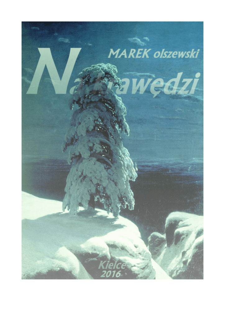 Na krawędzi MAREK olszewski Kielce 2016 © 2016. Materiał jest chroniony prawem zgodnie z ustawą o prawie autorskim i prawach pokrewnych, Dz.U. 1994 nr 24 poz. 83 z dnia 4 lutego 1994 r. Spis wierszy 1. Nokturn noworoczny 2. Na krawędzi (języki obce) 3. Madame, moja Madame 4. Grzechów nie żałuję 5. Jak Toccata i fuga d-moll... 6. Rewolucje (zbrodnie na niewinności) 7. Komunikaty pozawerbalne 8. Challenge 9. Bezosobowe reality 10. Pomiędzy wymiarami 3D 11. Encyklopedia sensu… 12. Bajka o zasypianiu 13. Bajka o spełnianiu 14. Bajka o zapominaniu 15. Dysplazje i metaplazje Nokturn noworoczny Gdzie jesteś panno wyrozumiała, której spojrzeć bym mógł w głębiny, szukać odbicia niewypowiedzianych słów? Gdzie noc nie zakończona, tam i ja; jak ten pies pomiędzy krawężnikami oślepiony blaskiem nadjeżdżającej śmierci; jak ćma otoczona niewidzialnym murem. Przygnieciony oddycham już tylko z obowiązku. 1 sty. 2016 Na krawędzi (języki obce) Nie jestem modlitwą powszednią, magicznym skryptem tylko dla dorosłych. Nie piszę nagim paznokciem po piersiach figlarnych łamigłówek - już zapomniałem jak to jest. Jak oblodzona sosna Na dzikiej północy*, na krawędzi, wypatruję nienadchodzącej odwilży; ptaka, który usiadłby przy ramieniu i nucił w niepoznanym języku kojące kołysanki; głupiutkiej melodii o szczerym, błękitnozielonym spojrzeniu. Nie jestem modlitwą powszednią, magicznym skryptem, jestem wierszem o trudnej, nierozumianej treści. _____________________________________ * Iwan Szyszkin - "Na dzikiej północy" 1891 18 sty. 2016 Madame, moja Madame A kiedy za oknem Pan Bóg zasieje zielone dywany, będę stąpał po nich dwiema parami bosych stóp, bo człowiek nie jest stworzony do umierania w samotności. Madame, moja Madame - ta, której nie ma. Narysuj się na planie każdej z kartek kalendarza, w porannym odbiciu w łazienkowym zwierciadle i przy drugim komplecie sztućców i talerzy - naprzeciw. Śnij mi się każdej nocy i pozwól się śnić, by nawet po zachodzie w oczach uniesienia mogły nieprzerwanie trwać. Ogień, motyle i to sympatyczne ćwierkanie echem odbijające się pod warstwą wrażliwej odzieży - znasz to? Takie samo, jak wówczas, gdy za pierwszym razem odkrywałaś potęgę zmysłowości. Pan Bóg za oknem zasieje zielone dywany, ale nie poprowadzi (ciągnąc za uszy) starych koni, by odnalazły się ponad horyzontami. 09 lut. 2016 Grzechów nie żałuję Spowiadam się Panu, Panie Doktorze, z marzeń niespełnionych, niekoniecznie moralnych i przyzwoitych. Spowiadam się z każdego imienia, spojrzenia, dotyku i ust, przy których smaku mógłbym naiwnie zasypiać jak stary wiersz w równie starym skoroszycie. Gdybym tylko odnalazł te właściwe. 15 mar. 2016 Jak Toccata i fuga d-moll... Może niekoniecznie pająk - trudno spojrzeć mu w oczy, rybki wydają się nijakie - nieme wideo, jak w starym kinie. Świerszcz? Grałby długimi wieczorami - te bywają najtrudniejsze. Jak Toccata i fuga d-moll, V symfonia Beethovena w rockowym wydaniu, albo, ot, irlandzkie pogrywanie. Przyjaciela warto posłuchać. 16 mar. 2016 Rewolucje (zbrodnie na niewinności) Imienia doszukuję się w śladach na klawiaturze, twarzy w odbiciach na nierdzewnej stali i rysach czasoprzestrzeni… Pierwsze promienie wiosny oplatają usta, budząc ze snu wrażenia, których już nie pamiętam. Nie do końca przekonany, że chcę jeszcze przez to przechodzić, zamykam się w betonowej celi. Pod gruboskórnym płaszczem bezpieczniej (pomiędzy sezonami pomaga zachować równowagę). Wolę słuchać ptaków - nie przeszkadzają żyć, nie stymulują oddechu, pulsu żebrami niesionego do krzyża. Bólu pojawiającego się, gdy iluzja okazuje się nieprawdą. Nie czytaj mnie, nie czytaj - mogę się okazać jedną kartką na planie trzystu sześćdziesięciu pięciu dni, pomyłką matematyczno-fizycznych obliczeń. Prawidłowego algorytmu nie odkrył jeszcze nikt. 19 mar. 2016 Komunikaty pozawerbalne Ucieczka na pustynię owocuje nadwrażliwością niezdolną do przetrwania. Janina Górecka - "Mnich" - 2016 Wbijające się w płuca, grubo ciosane ziarna piasku przypominają, że oddech może smakować wilgocią, kropelka po kropelce, zbieraną z krawędzi kobiecych ust. Ciężko się zasypia, jeszcze trudniej utrzymuje sen spokojnym. Obrazy marzeń przeplatają się ze wspomnieniami, jak czarne aksamitki wokół białych i szkarłatnych, kolczastych róż. Wyobrażenie stacza się w zapadnię. Kiedy upadam na kolana, dwie pary drobnych dłoni pomagają się podnieść i iść. Masa ołowianego krzyża tężeje, a ja nie jestem Jezusem w kwiecie wieku i nie mam ojca - on też nie zdołał unieść tego balastu. Zostało już tylko wsłuchiwać się z nadzieją w szum ukryty pomiędzy wersami, bo to nie fatamorgana. Wartości zapisane czarnym węglem w odziedziczonych rysach twarzy tracą już swój blask i urok. Pragnienie krępuje zdolność logicznego myślenia. 25 mar. 2016 Challenge Za dnia stare zegary powracają do życia, liczby ścigają się, natrętnie przypominając o sobie. Horyzonty rozdzierają ziemię, izolując Europę od Ameryki. Morza i oceany nabierają głębokości; gwiazdy skwierczą, opadając na dno. Let's... Nadzy i bezbronni jak wiersze po burzy wchłaniamy pierwsze promienie zmierzchu, nie oddzielając zmysłów od wymysłów. Możemy odpuścić sobie wszystko, uprościć wstępną grę, oswajanie dłoni i to całe przeplatanie włosów przez palce. Ale póki co, wplątani w bezosobowe reality gramy, udając, że tak jest normalnie. _____________________________________ challenge (ang.) - wyzwanie, kwestionowanie, apel, sprowokowanie, próba sił. 05 kwi. 2016 Bezosobowe reality Fałszywy brzask - strażnicy zamykają wrota. Himalaje i Alpy się wypiętrzają, sięgając szczytami gwiazd. Południowe doliny mienią się w blasku odbitego od mentalności prawa, północne na zawsze już pozostają w cieniu. Kolejny upalny dz