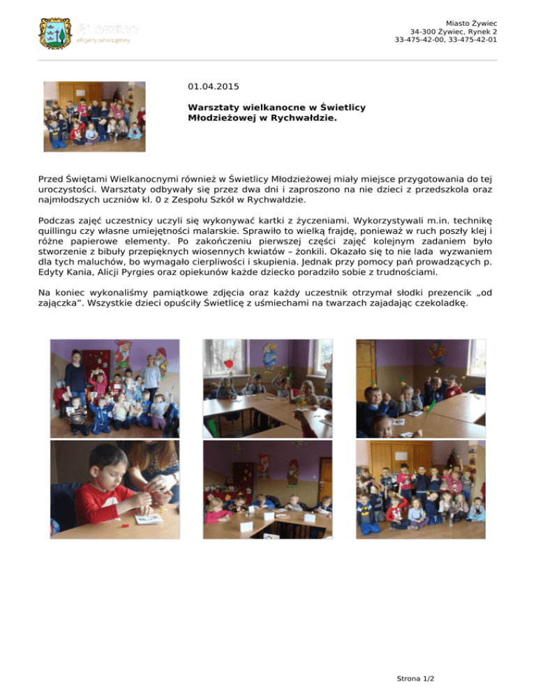 Miasto Żywiec 34-300 Żywiec, Rynek 2 33-475-42-00, 33-475-42-01 01.04.2015 Warsztaty wielkanocne w Świetlicy Młodzieżowej w Rychwałdzie. Przed Świętami Wielkanocnymi również w Świetlicy Młodzieżowej miały miejsce przygotowania do tej uroczystości. Warsztaty odbywały się przez dwa dni i zaproszono na nie dzieci z przedszkola oraz najmłodszych uczniów kl. 0 z Zespołu Szkół w Rychwałdzie. Podczas zajęć uczestnicy uczyli się wykonywać kartki z życzeniami. Wykorzystywali m.in. technikę quillingu czy własne umiejętności malarskie. Sprawiło to wielką frajdę, ponieważ w ruch poszły klej i różne papierowe elementy. Po zakończeniu pierwszej części zajęć kolejnym zadaniem było stworzenie z bibuły przepięknych wiosennych kwiatów – żonkili. Okazało się to nie lada wyzwaniem dla tych maluchów, bo wymagało cierpliwości i skupienia. Jednak przy pomocy pań prowadzących p. Edyty Kania, Alicji Pyrgies oraz opiekunów każde dziecko poradziło sobie z trudnościami. Na koniec wykonaliśmy pamiątkowe zdjęcia oraz każdy uczestnik otrzymał słodki prezencik „od zajączka”. Wszystkie dzieci opuściły Świetlicę z uśmiechami na twarzach zajadając czekoladkę. Strona 1/2 Miasto Żywiec 34-300 Żywiec, Rynek 2 33-475-42-00, 33-475-42-01 Strona 2/2 Powered by TCPDF (www.tcpdf.org)