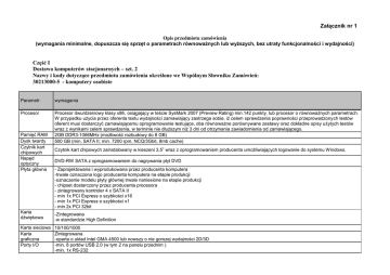Załącznik nr 1 Opis przedmiotu zamówienia (wymagania minimalne, dopuszcza się sprzęt o parametrach równoważnych lub wyższych, bez utraty funkcjonalności i wydajności) Część I Dostawa komputerów stacjonarnych – szt. 2 Nazwy i kody dotyczące przedmiotu zamówienia określone we Wspólnym Słowniku Zamówień: 30213000-5 - komputery osobiste Parametr wymagania Procesor Procesor dwurdzeniowy klasy x86, osiągający w teście SysMark 2007 (Preview Rating) min.142 punkty, lub procesor o równoważnych parametrach. W przypadku użycia przez oferenta testu wydajności zamawiający zastrzega sobie, iż celem sprawdzenia poprawności przeprowadzonych testów oferent musi dostarczyć zamawiającemu oprogramowanie testujące, oba równoważne porównywane zestawy oraz dokładne opisy użytych testów wraz z wynikami celem sprawdzenia, w terminie nie dłuższym niż 3 dni od otrzymania zawiadomienia od zamawiającego. 2GB DDR3-1066MHz (możliwość rozbudowy do 8 GB) 500 GB (min. SATA II; min. 7200 rpm, NCQ/3Gbit, 8mb cache) Pamięć RAM Dysk twardy Czytnik kart chipowych Napęd optyczny Płyta główna Czytnik kart chipowych zainstalowany w kieszeni 3,5” wraz z oprogramowaniem producenta umożliwiających logowanie do systemu W indows. DVD-RW SATA z oprogramowaniem do nagrywania płyt DVD - Zaprojektowana i wyprodukowana przez producenta komputera -trwale oznaczona logo producenta komputera na etapie produkcji -oznaczenie modelu płyty głównej trwale naniesione na etapie produkcji - chipset dostarczony przez producenta procesora - zintegrowany kontroler 4 x SATA II - min 1x PCI Express o szybkości x16 - min 1x PCI Express o szybkości x1 - min 2x PCI 32bit Karta dźwiękowa -Zintegrowana -w standardzie High Definition Karta sieciowa Karta graficzna Porty I/O 10/100/1000 Zintegrowana -oparta o układ Intel GMA 4500 lub nowszy o nie gorszej wydajności 2D/3D -min. 8 portów USB 2.0 (w tym 2 na panelu przednim ) -min. 1x RS-232 System operacyjny Obudowa Klawiatura Mysz Gwarancja Certyfikaty i normy -min. 1xLPT -2x porty PS2 -1x VGA - 1x DVI - 1x Display port -1x audio line-in, 2x audio line-out, 2x wejście mikrofonowe (wejście mikrofonowe i line-out zdublowane na panelu przednim obudowy) -Licencja dla Windows 7 Professional 32bit i 64 bit -Preinstalowany fabrycznie na dysku twardym Windows 7 Professional w polskiej wersji językowej, -Dostarczony nośnik Windows 7 Professional OEM pozwalający na ponowną instalację systemu niewymagającą wpisywania klucza rejestracyjnego lub rejestracji poprzez Internet czy telefon -Typu „Microtower” -obudowa w kolorze czarnym -zasilacz o mocy maksymalnej 300W z aktywnym filtrem PFC -minimum dwie zewnętrzne zatoki 5.25 cala -minimum jedna zewnętrzna zatoka 3,5 cala - -licencja na system operacyjny oraz numer seryjny komputera umieszczony na górnej części obudowy -slot Kensington -Klawiatura PS2 w układzie US -trwałe oznaczenie klawiatury logo producenta komputera -Mysz optyczna 800 dpi -USB -dwuprzyciskowa, rolka (scroll) jako trzeci przycisk -funkcja scroll'a czterokierunkowego -trwałe oznaczenie myszy logo producenta komputera Gwarancja 36 miesięcy Deklaracja zgodności CE, widoczne oznaczenie CE na górnej ścianie obudowy Certyfikaty jakości ISO 9001 i 14001 Część II Dostawa monitorów LCD 19” – szt. 2 Nazwy i kody dotyczące przedmiotu zamówienia określone we Wspólnym Słowniku Zamówień: 30231250-4 monitory ekranowe Parametr Przekątna ekranu, rozdzielczość Parametry obrazu Wejścia wideo Obudowa i regulacja monitora Kable Gwarancja Certyfikaty i normy, dokumentacja Wymagania minimalne 19”, proporcje 5:4, rozdzielczości minimum 1280 x 1024 pikseli, maksymalny rozmiar piksela 0.3 mm, kontrast 10000:1 (dynamiczny), kontrast 1000:1(typowy), jasność 250 cd/m2 ,czas reakcji matrycy max. 5ms, kąty widzenia pion/poziom minimum 170 stopni, częstotliwość pozioma 30-82 kHz, częstotliwość pionowa 55-75 Hz (weryfikacja na podstawie dokumentacji technicznej producenta monitora), 1x D-SUB 1x DVI-D -obudowa ekranu w kolorze czarnym -pochylenie ekranu (tilt) -zintegrowany zasilacz i głośniki stereo stereo o mocy minimum 1W każdy -waga maksymalna bez podstawy 3,4 kg -Kabel D-SUB (15-pinowy) o długości minimum 1,8m - kabel audio stereo - analogowy Gwarancja 36 miesięcy w systemie door-to-door -Energy Star 5.0 -CE -RoHS, WEEE -Instrukcja obsługi monitora Część III Dostawa Drukarki laserowej kolorowej A 3 – szt. 1 Nazwy i kody dotyczące przedmiotu zamówienia określone we Wspólnym Słowniku Zamówień: 30232110-8 Drukarki laserowe Parametr Wymagania minimalne Informacje podstawowe Szybkość druku A4 A4: 22 str./min (druk kolorowy), 32 str./min (druk czarno-biały) Szybkość druku A3 A3: 12 str./min (druk kolorowy) 17 str./min (druk czarno-biały) Czas pierwszego wydruku 11,5 s (kolor), 9,5 sekund (czarno-biały) Czas rozgrzewania Do 90 s od włączenia zasilania i do 75 s od wyjścia z trybu oszczędności energii Rozdzielczość w pionie: 1200 dpi, rozdzielczość w poziomie: 600 dpi. Procesor Szybkość procesora min. 200 MHz Pamięć Interfejsy / Komunikacja min. RAM: 128MB Złącza Hi-Speed USB 1 szt. Karta sieciowa (LAN/GBLAN) Formaty papieru 10/100 Pojemność tacy Formaty papieru: Podajnik 1: A3, A4, A5, A6, B4, B5; Podajnik 2/3: A3, A4, A5, B4, B5; Podajnik uniwersalny: A3, A4, A5, B4, B5, A6; 10 koperty (Com-9, Com-10, DL, Monarch, C5); naklejki (Avery 7162, 7664, 7666), format niestandardowy (długość do 1200 mm w tym banery); Drukowanie dwustronne: A3, A4, A5, B4, B5; format niestandardowy: Szerokość 148,5-297mm x Długość 182-431,80mm 250 arkuszy zadrukiem do dołu, 100 arkuszy zadrukiem do góry; 80 g/m2 Poziom hałasu Nie przekracza 54 dB(A); Oczekiwanie: Nie przekracza 37 dB(A); Pozostałe informacje Języki drukowania Język wydruku oparty o hosta Windows/Mac Kompatybilność z systemami operacyjnymi Windows 2000 / XP Home / XP Professional / XP Professional x64 / Server 2003 (32