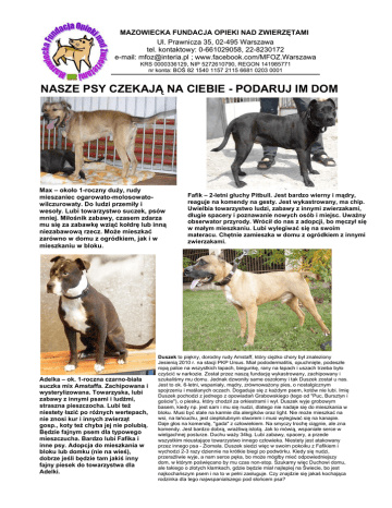 MAZOWIECKA FUNDACJA OPIEKI NAD ZWIERZĘTAMI Ul. Prawnicza 35, 02-495 Warszawa tel. kontaktowy: 0-661029058, 22-8230172 e-mail: [email protected] ; www.facebook.com/MFOZ.Warszawa KRS 0000336129, NIP 5272610790, REGON 141985771 nr konta: BOŚ 82 1540 1157 2115 6681 0203 0001 NASZE PSY CZEKAJĄ NA CIEBIE - PODARUJ IM DOM Max – około 1-roczny duży, rudy mieszaniec ogarowato-molosowatowilczurowaty. Do ludzi przemiły i wesoły. Lubi towarzystwo suczek, psów mniej. Miłośnik zabawy, czasem zdarza mu się za zabawkę wziąć kołdrę lub inną niezabawową rzecz. Może mieszkać zarówno w domu z ogródkiem, jak i w mieszkaniu w bloku. Adelka – ok. 1-roczna czarno-biała suczka mix Amstaffa. Zachipowana i wysterylizowana. Towarzyska, lubi zabawy z innymi psami i ludźmi, straszna pieszczocha. Lubi też niestety łazić po różnych wertepach, nie znosi kur i innych zwierząt gosp., koty też chyba jej nie polubią. Będzie fajnym psem dla typowego mieszczucha. Bardzo lubi Fafika i inne psy. Adopcja do mieszkania w bloku lub domku (nie na wieś), dobrze jeśli będzie tam jakiś inny fajny piesek do towarzystwa dla Adelki. Fafik – 2-letni głuchy Pitbull. Jest bardzo wierny i mądry, reaguje na komendy na gesty. Jest wykastrowany, ma chip. Uwielbia towarzystwo ludzi, zabawy z innymi zwierzakami, długie spacery i poznawanie nowych osób i miejsc. Uważny obserwator przyrody. Wrócił do nas z adopcji, bo męczył się w małym mieszkaniu. Lubi wylegiwać się na swoim materacu. Chętnie zamieszka w domu z ogródkiem z innymi zwierzakami. Duszek to piękny, dorodny rudy Amstaff, który ciężko chory był znaleziony Jesienią 2010 r. na stacji PKP Ursus. Miał pododermatitis, opuchnięte, podeszłe ropą palce na wszystkich łapach, biegunkę, rany na łapach i uszach trzeba było czyścić w narkozie. Został przez naszą fundację wykastrowany, zachipowany i szukaliśmy mu domu. Jednak dzwoniły same oszołomy i tak Duszek został u nas. Jest to ok. 6-letni, wspaniały, mądry, zrównoważony pies, o nostalgicznym spojrzeniu i maślanych oczach. Dogaduje się z każdym psem, kotów nie lubi. Imię Duszek pochodzi z jednego z opowiadań Grabowskiego (tego od "Puc, Bursztyn i goście"), o piesku, który chodził za orkiestrami i wył. Duszek wyje grobowym basem, kiedy np. jest sam i mu się nudzi, dlatego nie nadaje się do mieszkania w bloku. Musi być stale na karmie dla alergików oraz light. Nie może mieszkać na wsi, na łańcuchu, jest ciepłolubnym stworem i musi wylegiwać się na kanapie. Daje głos na komendę, "gada" z człowiekiem. Na smyczy trochę ciągnie, ale zna komendy. Jest bardzo dobrą, wrażliwą istotą. Jak to mówią, wspaniałe serce w wielgachnej posturze. Duchu waży 34kg. Lubi zabawy, spacery, a przede wszystkim nieustające towarzystwo innego człowieka. Niestety jest atakowany przez innego psa - Ziomala. Duszek siedzi więc w swoim pokoiku z Fafikiem i wychodzi 2-3 razy dziennie na krótkie biegi po podwórku. Kiedy się nudzi, przeraźliwie wyje, a nam serce pęka, bo może mógłby mieć odpowiedniejszy dom, w którym poświęcano by mu czas non-stop. Szukamy więc Duchowi domu, ale takiego o złotych klamkach, gdzie będzie miał najlepiej na Świecie, bo jest najkochańszym psem i na to w pełni zasługuje. Czy znajdzie się jakaś kochająca rodzinka dla tego najwspanialszego pod słońcem psa?